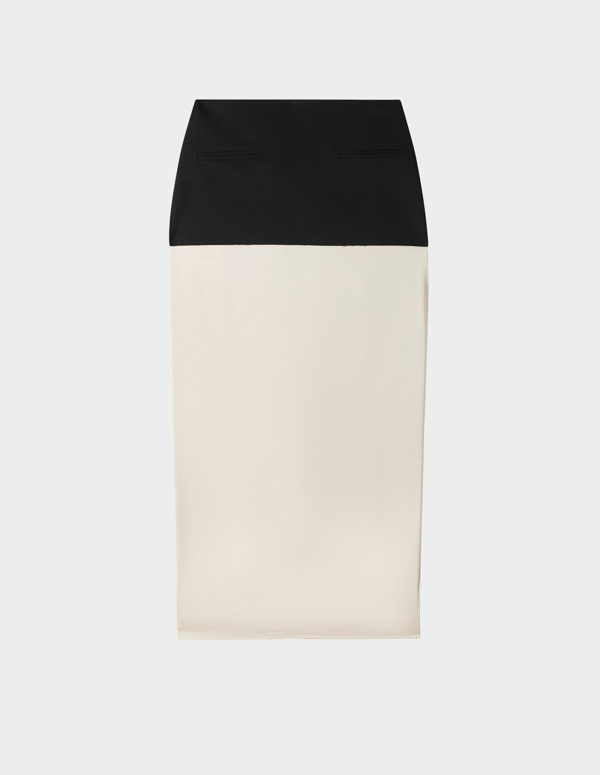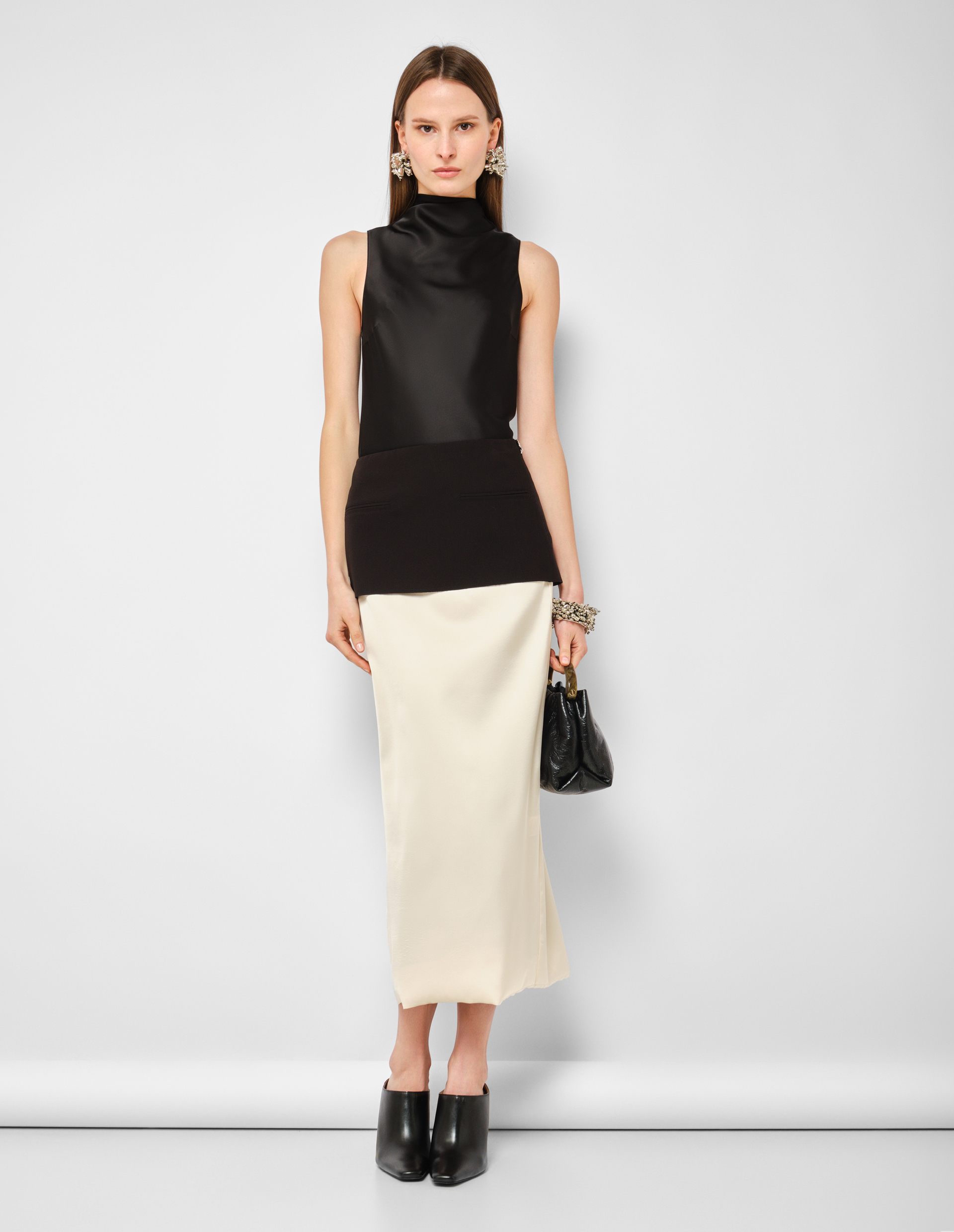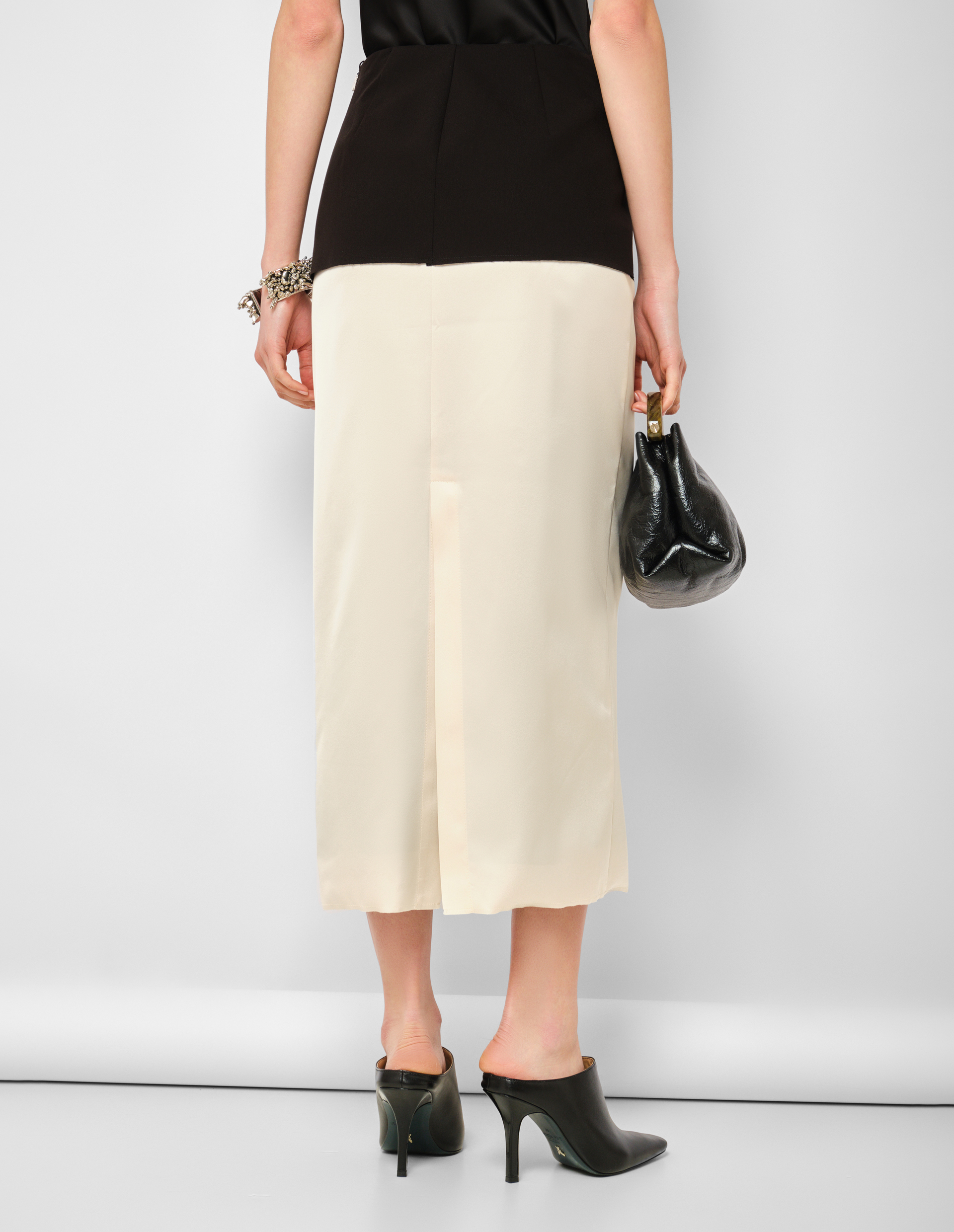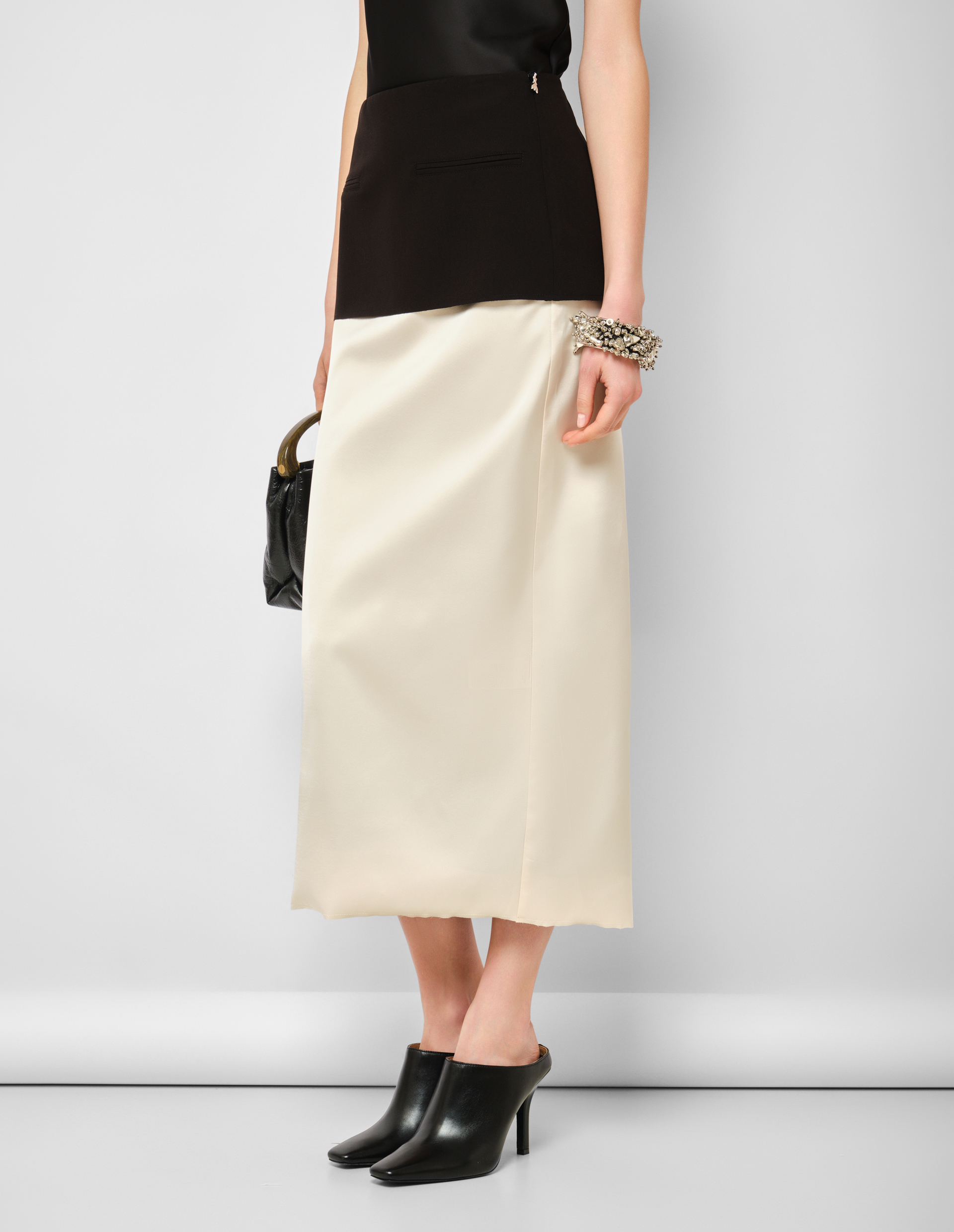 Архитектурный диалог двух текстур и двух цветов, заключённый в один силуэт. Её основа — струящийся бежевый сатин, мягко обволакивающий бёдра и создающий базу для сложной конструкции. Главный акцент — чёрная баска, которая начинается от пояса и архитектурно расширяется, добавляя образу драматизма, графической чёткости и намёка на нью-лук силуэты прошлого. Миди-длина балансирует эту театральность, делая юбку уместной и для вечернего выхода, и для продуманного дневного образа.