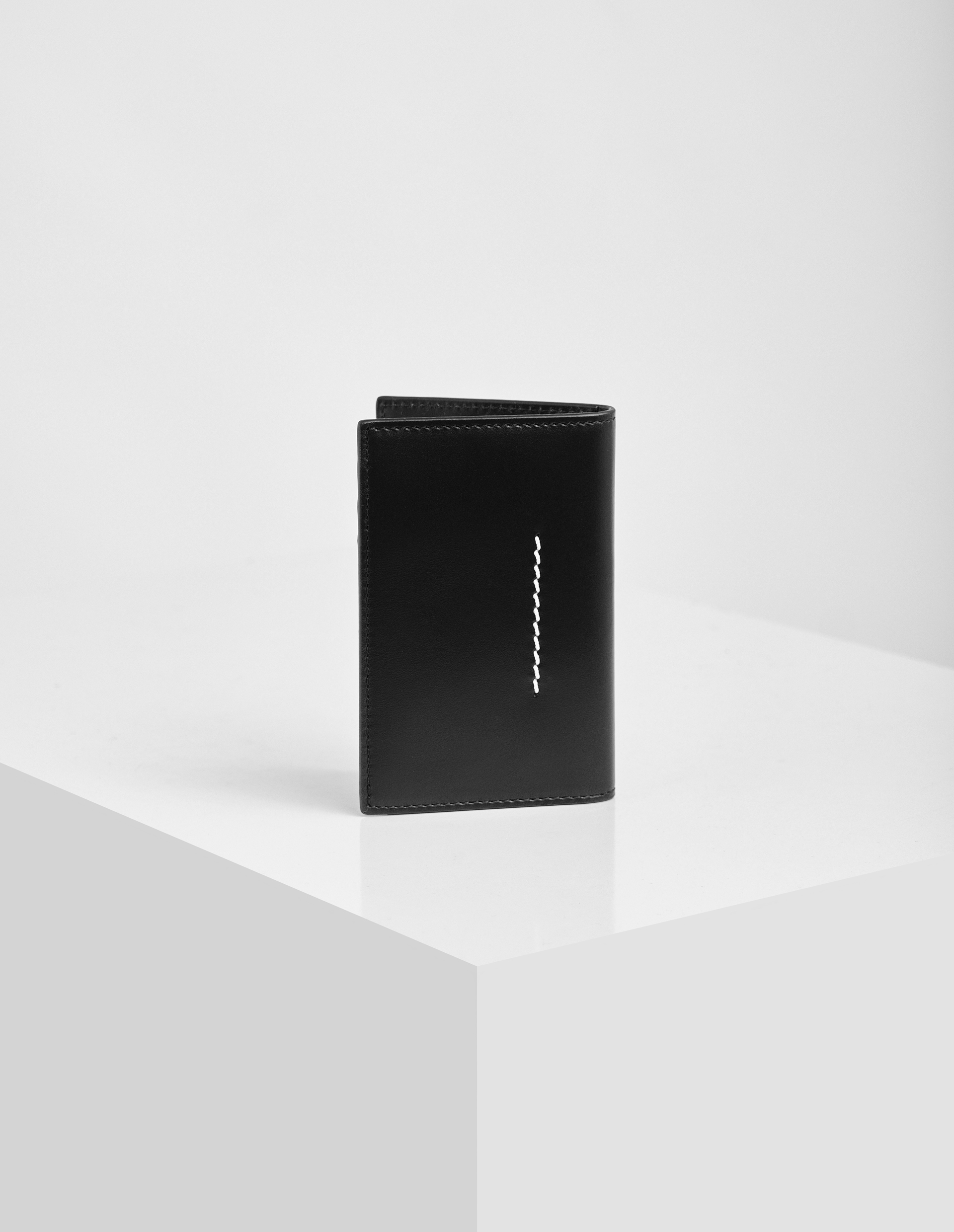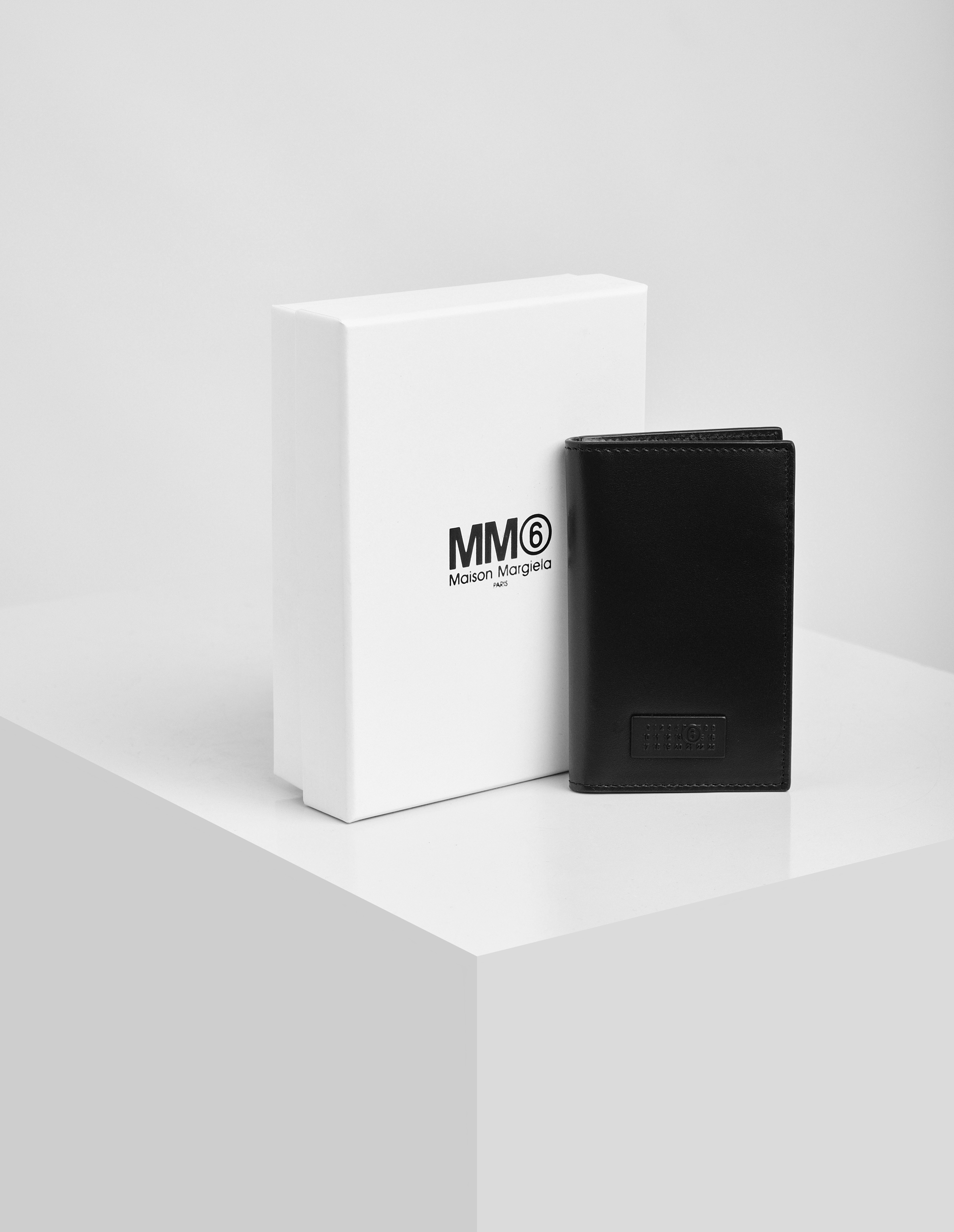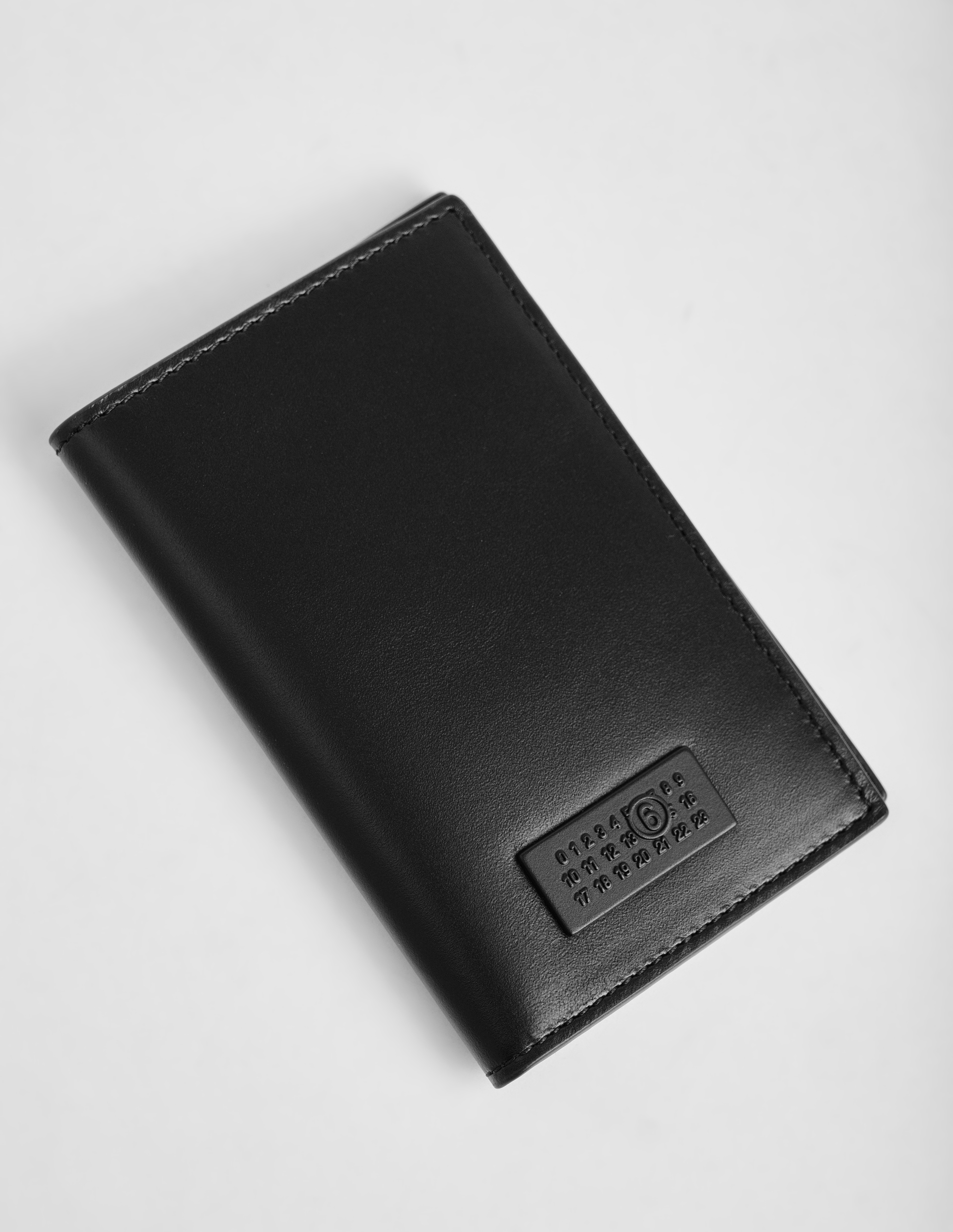 Кошелек двойного сложения из гладкой кожи, украшенный тональным оформлением в виде пластины с культовой цифровой гравировкой, воплощает сдержанный код MM6. Шесть внутренних отделений для карт формируют строгую геометрию, а фирменная белая строчка на обороте подчеркивает минималистичный жест бренда. Безупречные стежки и итальянское исполнение демонстрируют гармонию функциональности и роскоши, где утилитарный аксессуар преобразован в объект анонимной элегантности, завершенный культовой белой упаковкой.