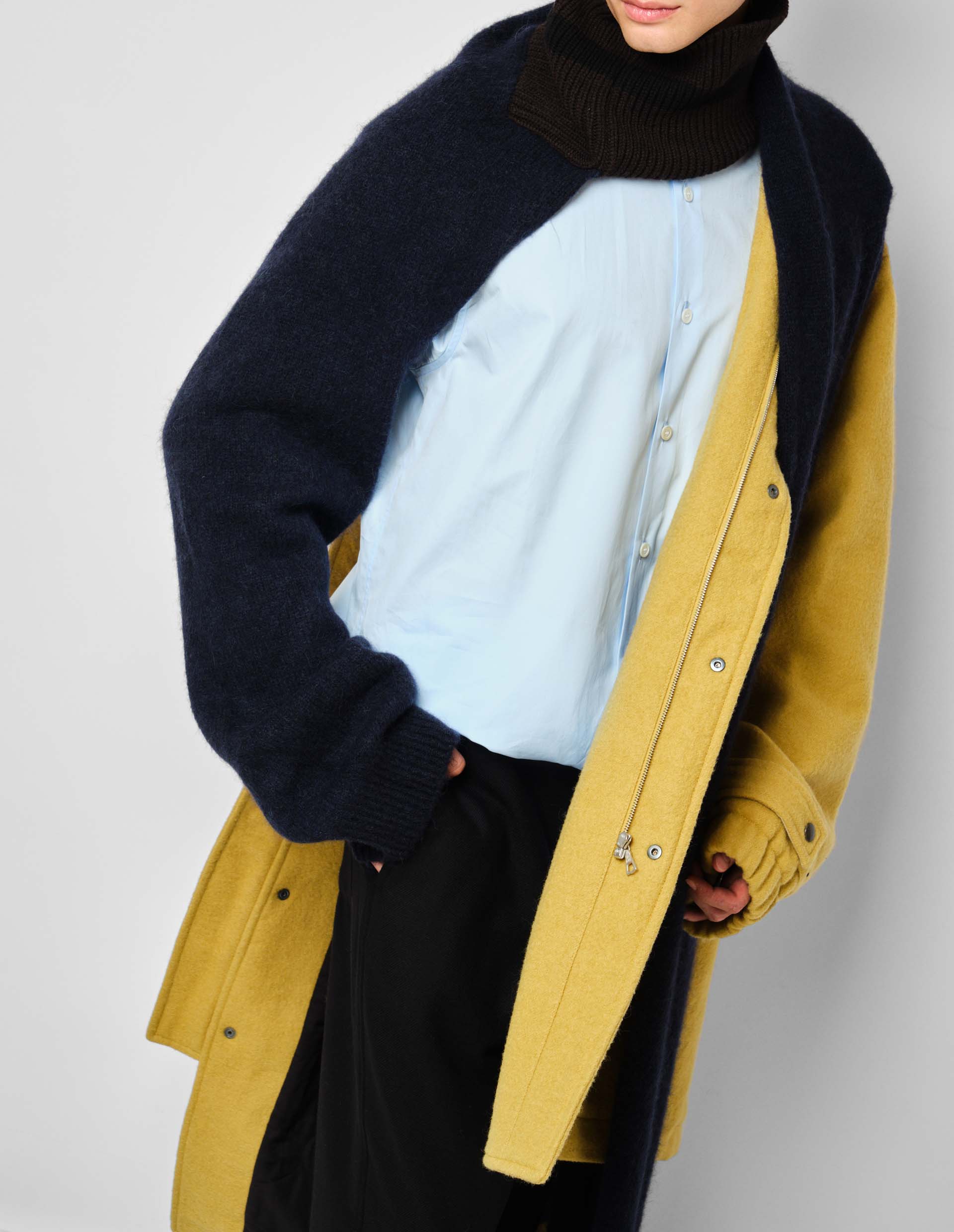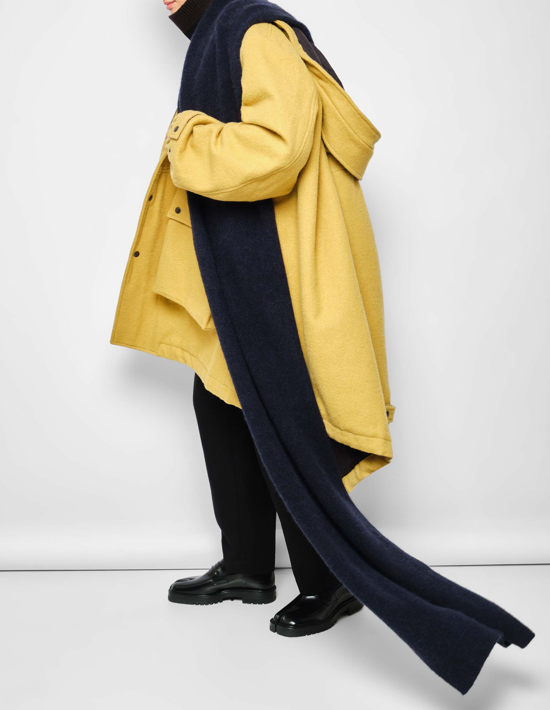 Дизайн шарфа представляет эксклюзивную комбинацию из широкого полотна, высокого ворота и одинарного рукава. Это допускает универсальные варианты стилизации, делая его идеальным дополнением к любому взыскательному гардеробу. Накинут ли он поверх элегантного пальто для официального ансамбля, или же использован в более непринужденной манере, ставшей новой интерпретацией свитера, это выходит за рамки простой функциональности, становясь выражением индивидуальности.