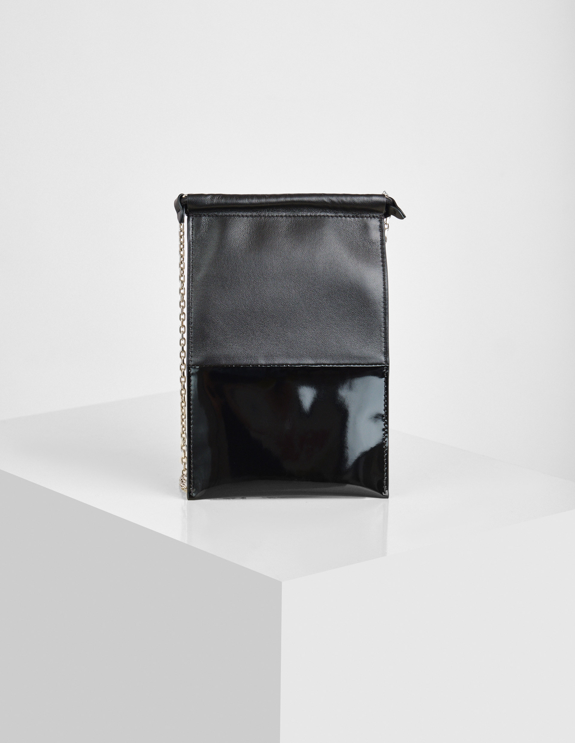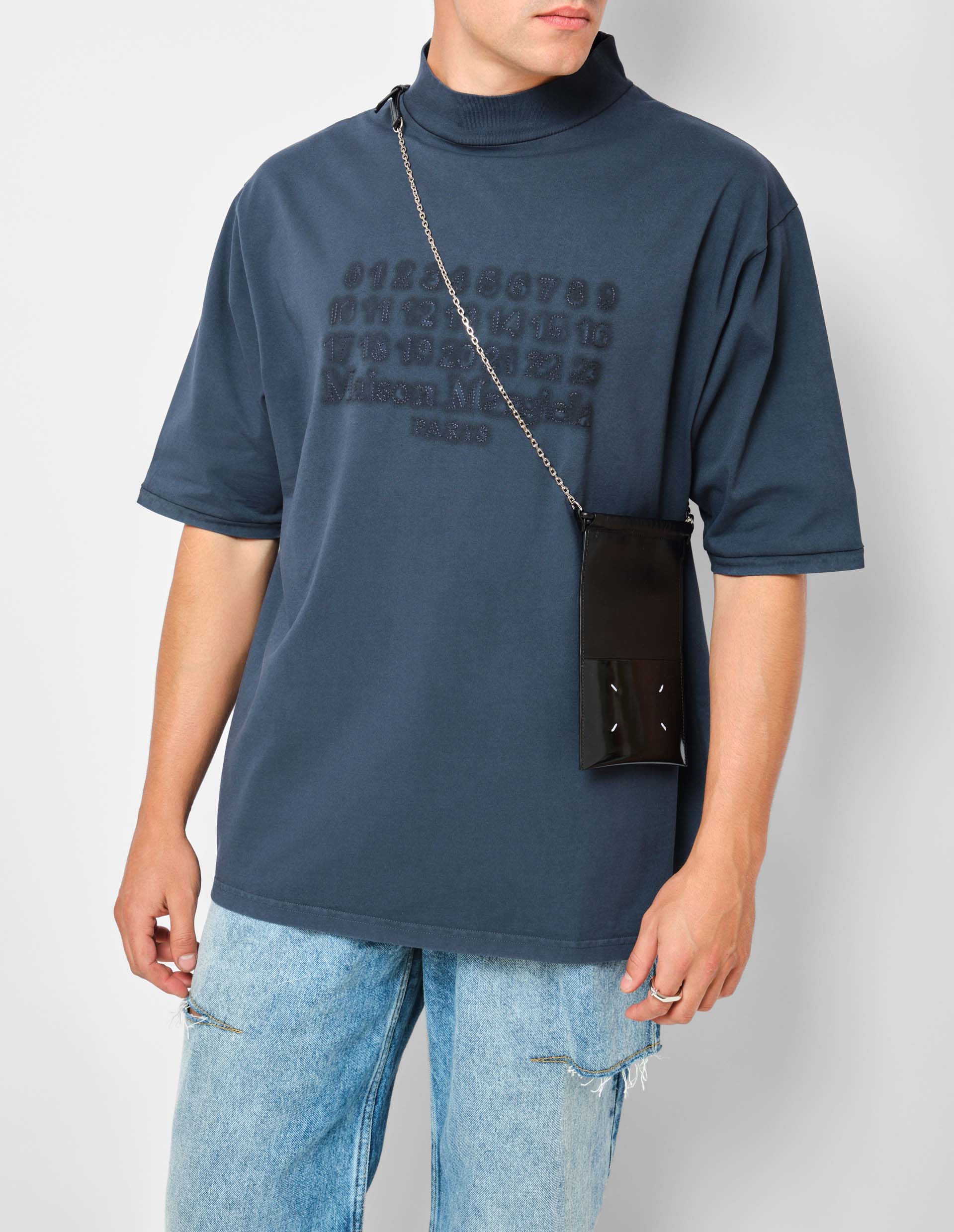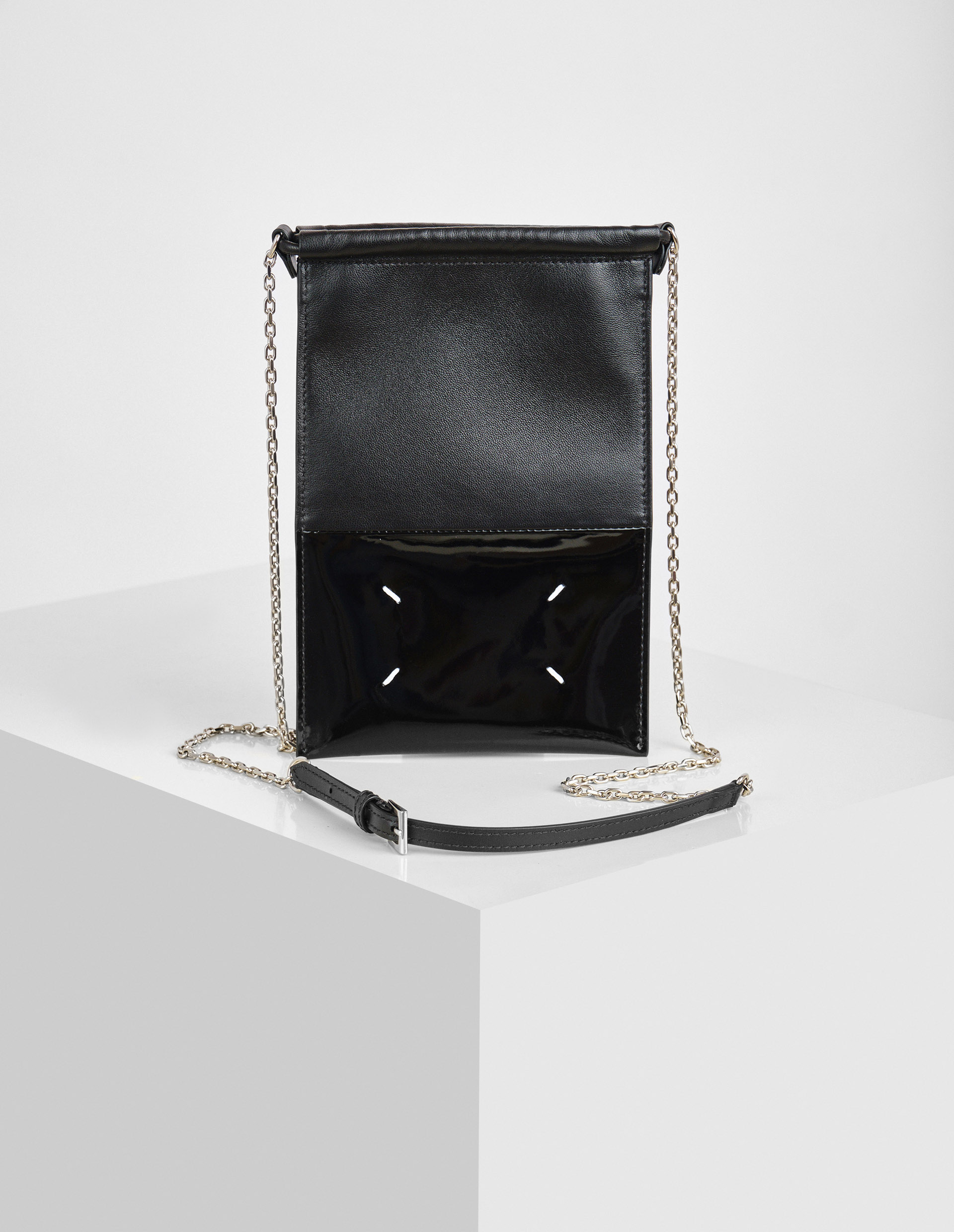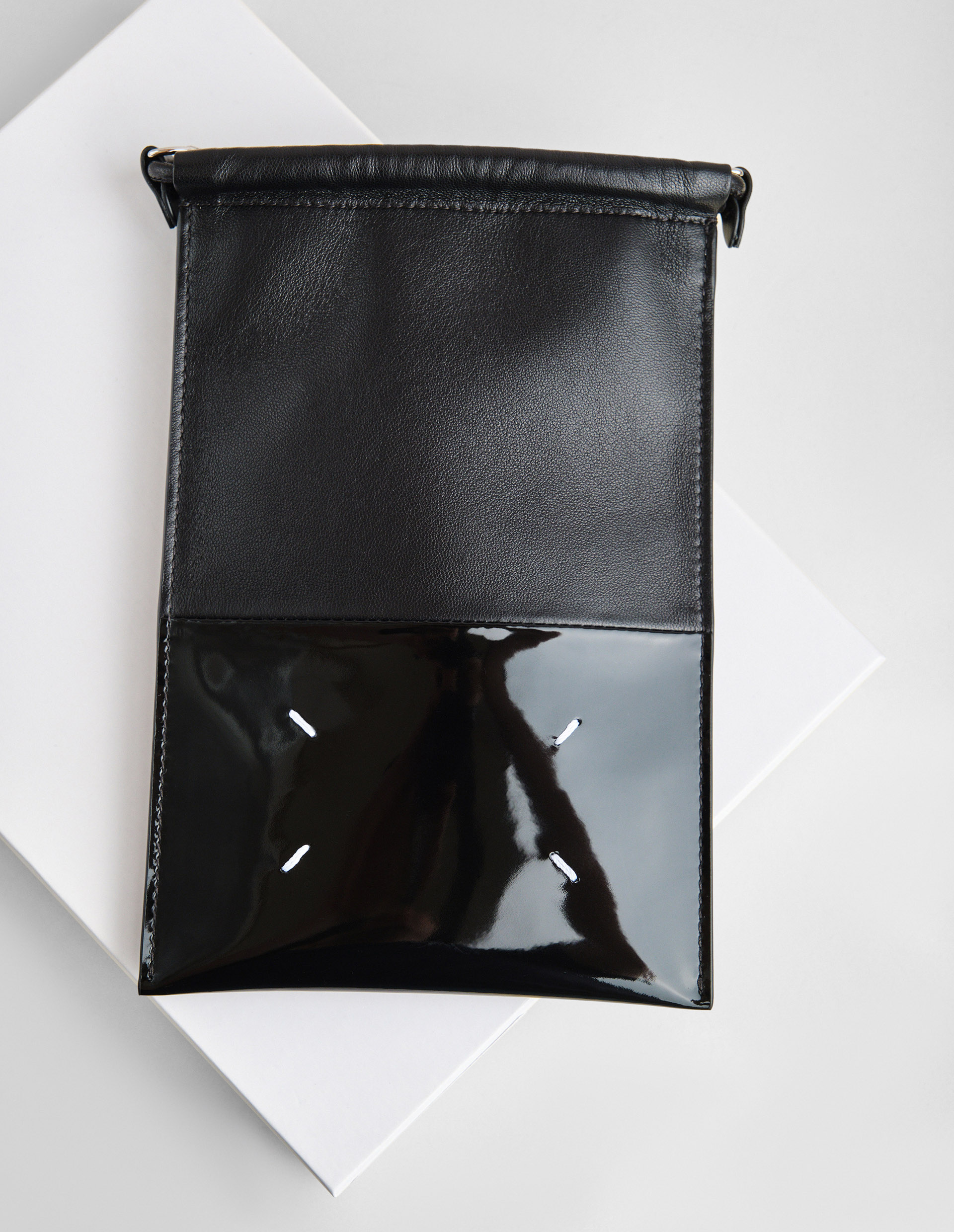Уникальное и аутентичное изделие, которое может одновременно роль чехла и миниатюрной сумки — черный кожаный чехол от модного дома Maison Margiela. Универсальное изделие дополнили ажурным серебристым ремнем-цепочкой с мягкой регулируемой вставкой. Для пошива аксессуара использовали комбинацию мелкозернистой полуматовой и гладкой лакированной кожи. Чехол, затягивающийся сверху кулиской, декорировали на передней панели фирменными белыми стежками, намекающими на наследение культового бренда.
