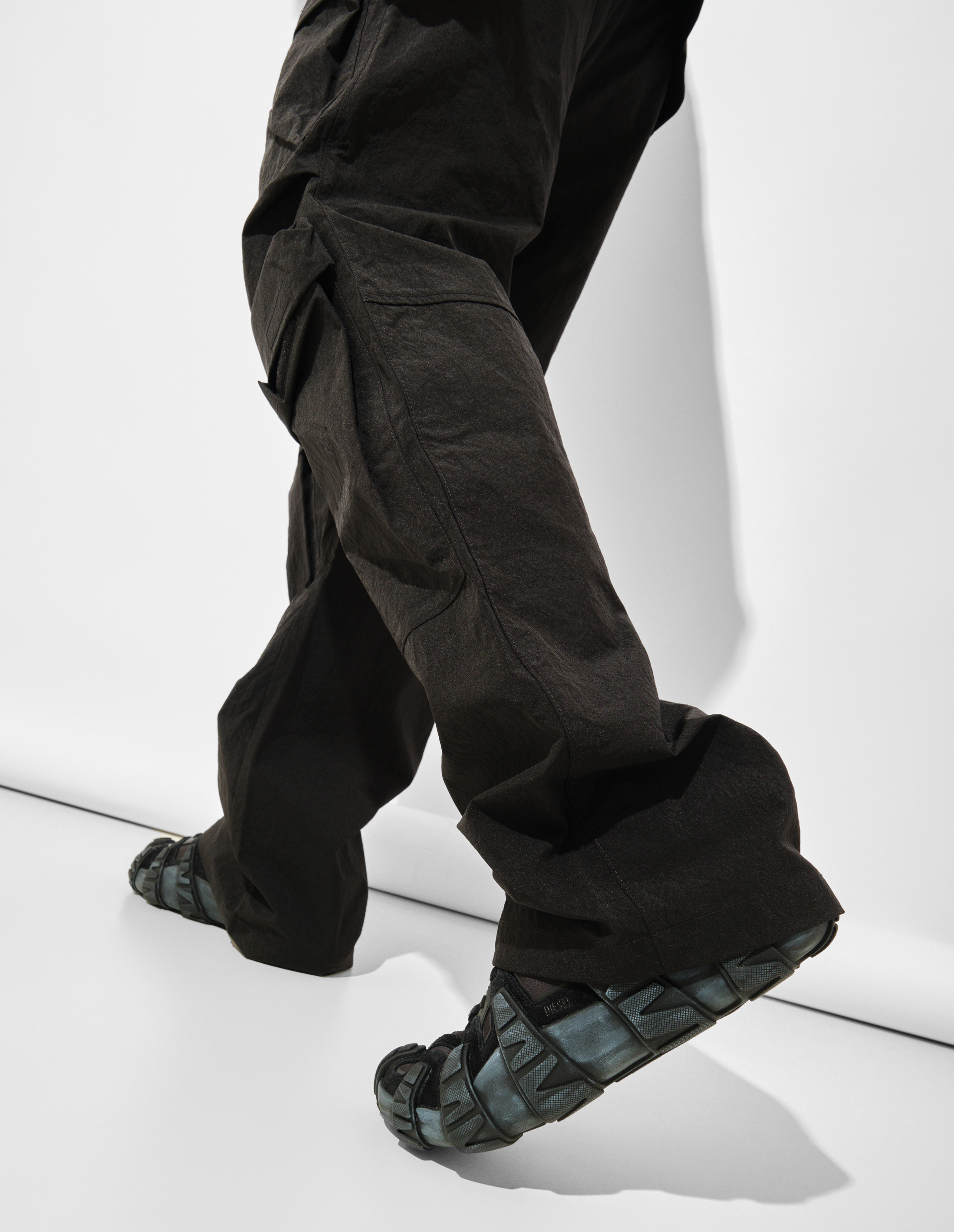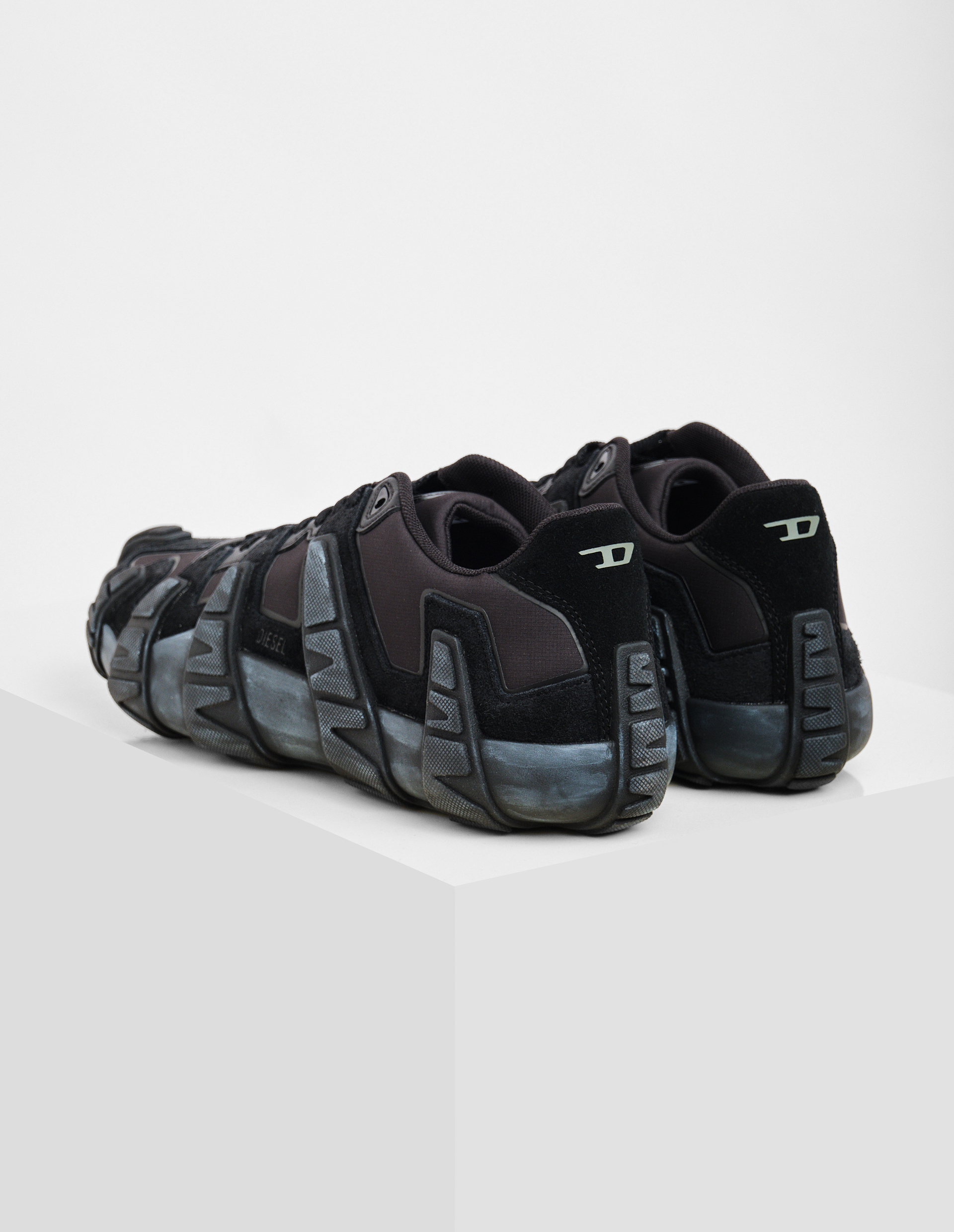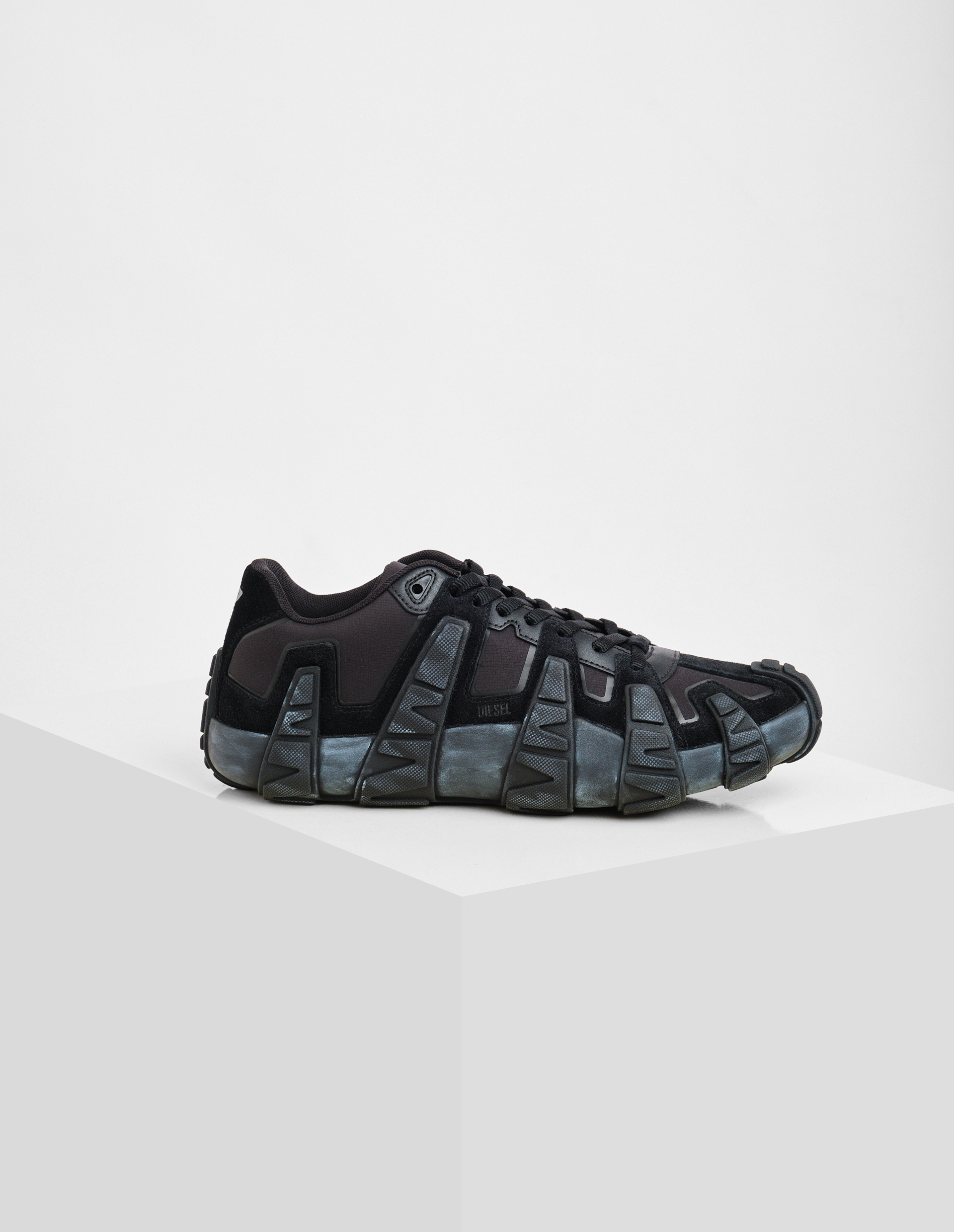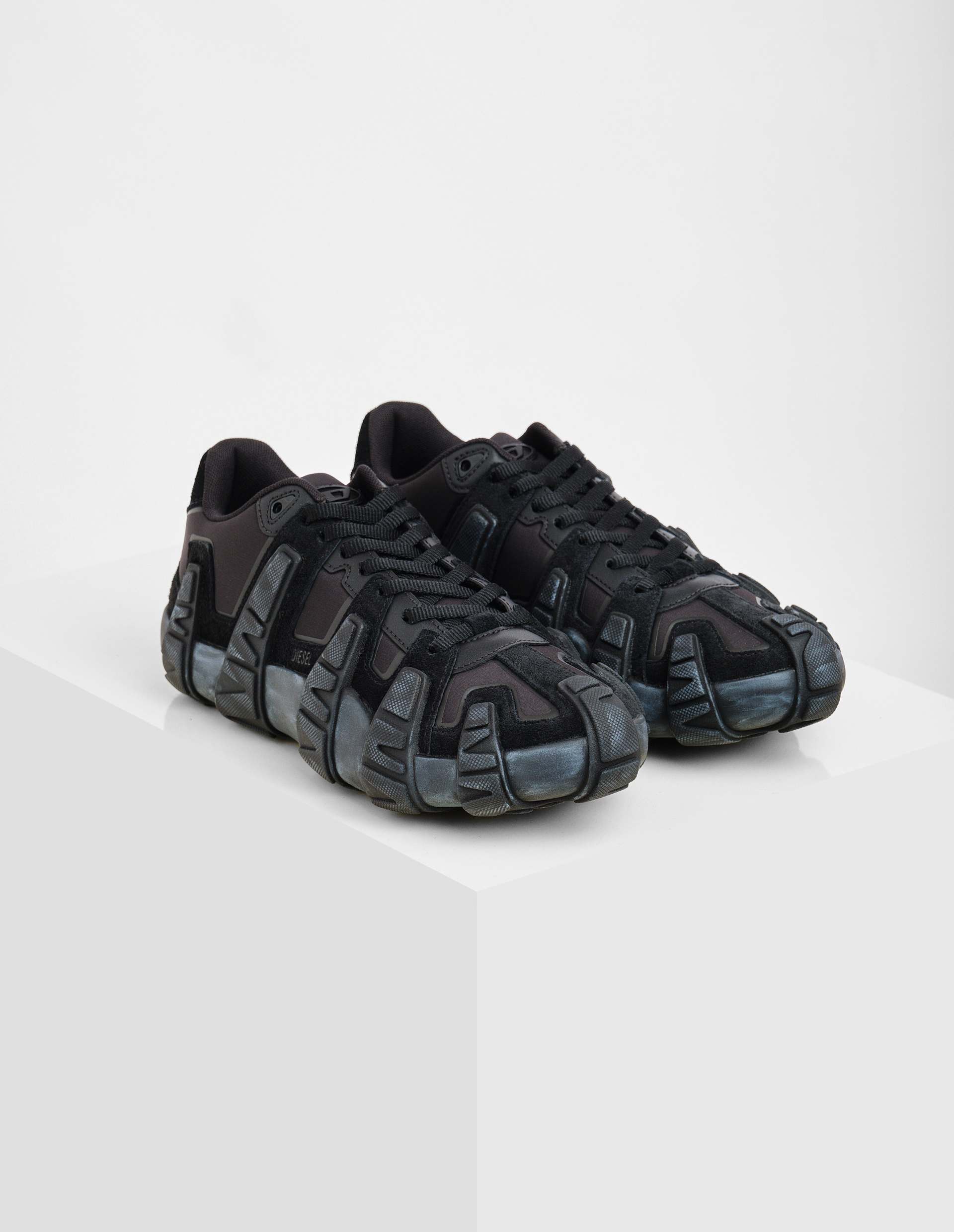 Кроссовки S-D-Griffe: индустриальный ответ городскому хаосу. Технический нейлон и фактурная замша формируют бронированный силуэт, где кожаные вставки работают как функциональный скелет. Искусственная патина на материалах не скрывает износ, а культивирует его в духе Diesel, где следы времени становятся знаком подлинности. Массивная подошва и агрессивный протектор завершают образ обуви, созданной для тех, кто воспринимает улицы как полигон для самовыражения.