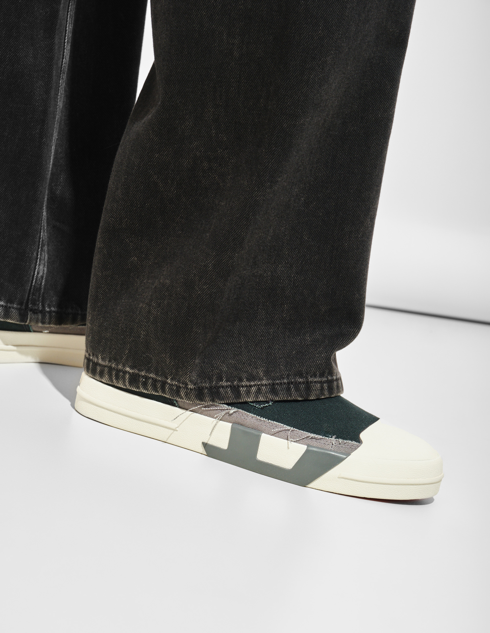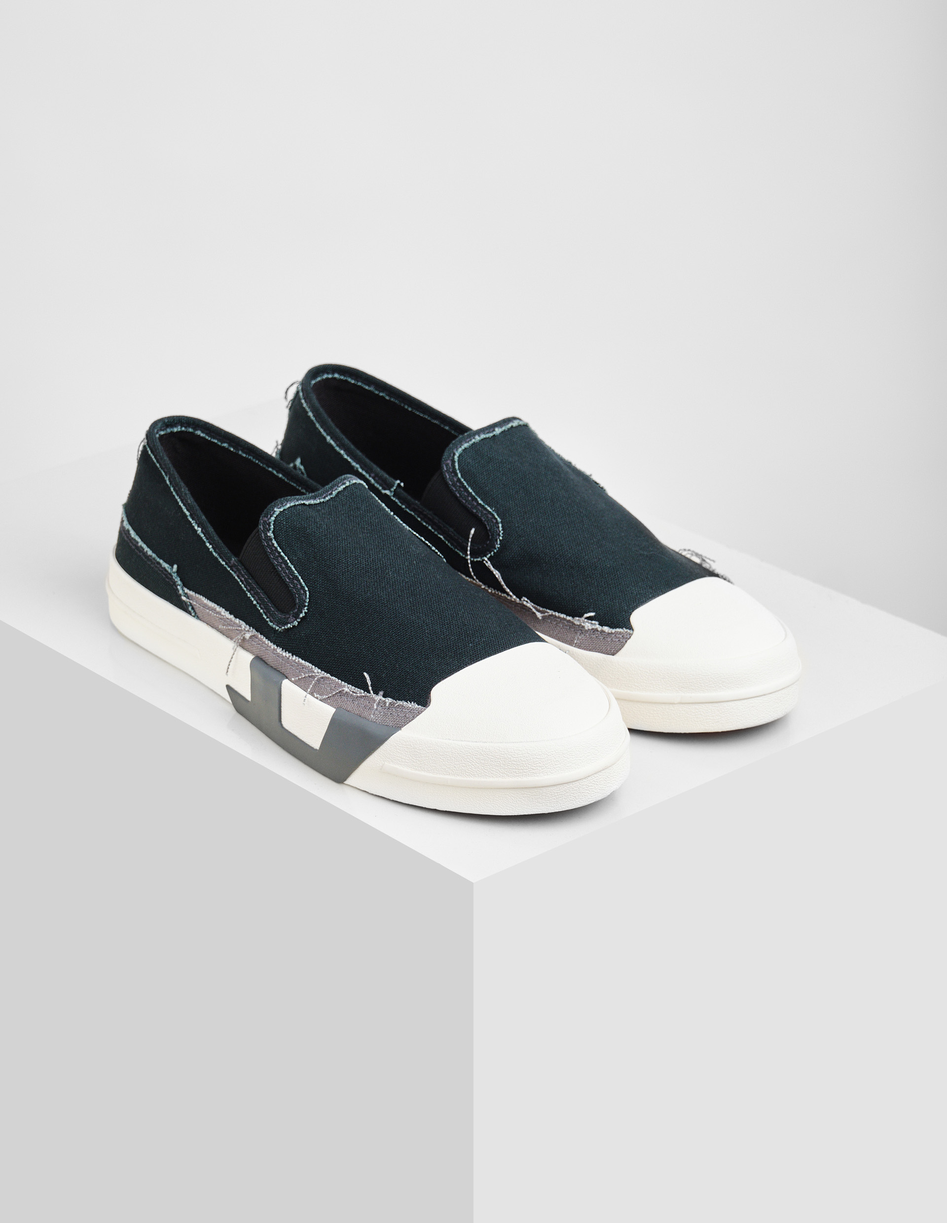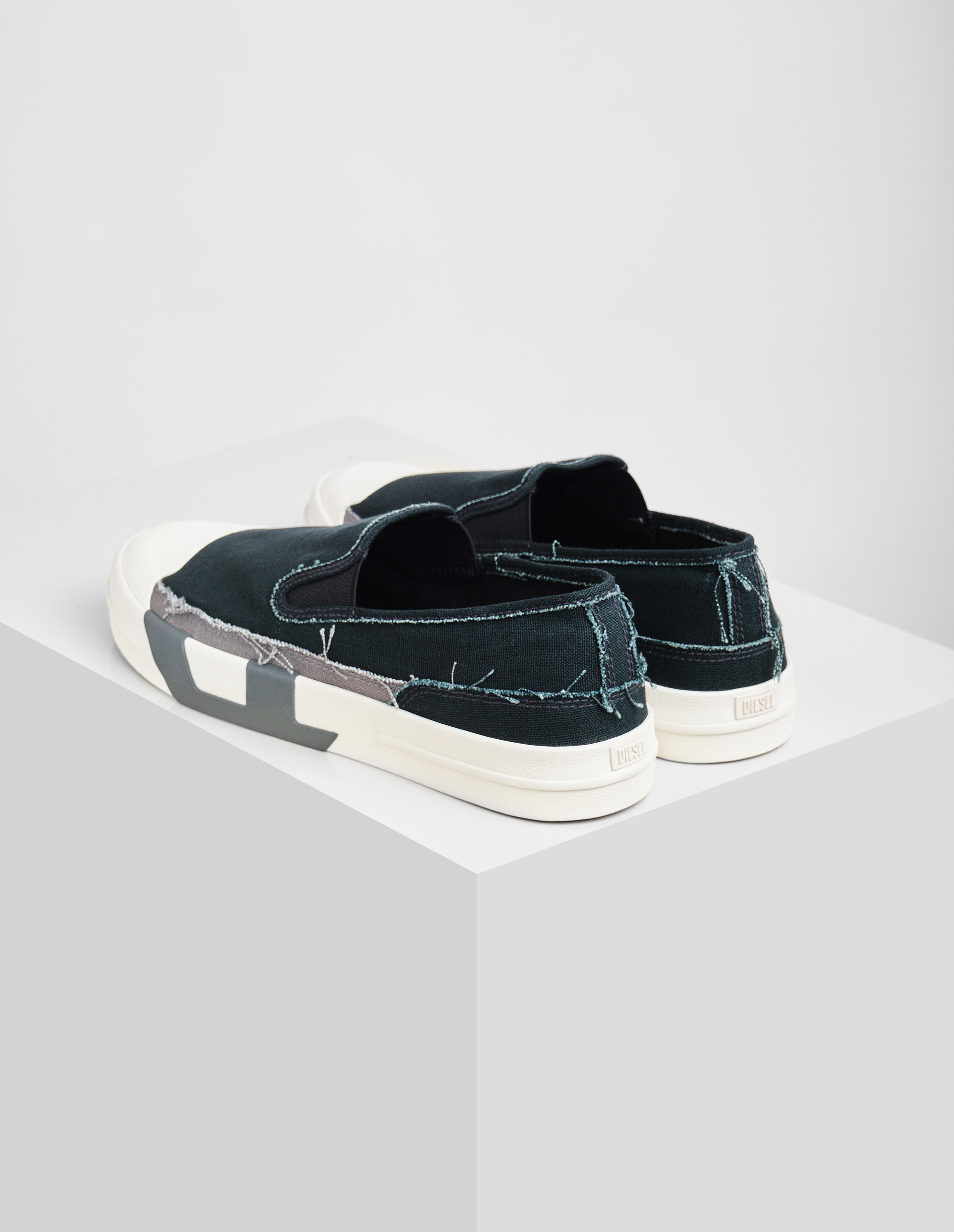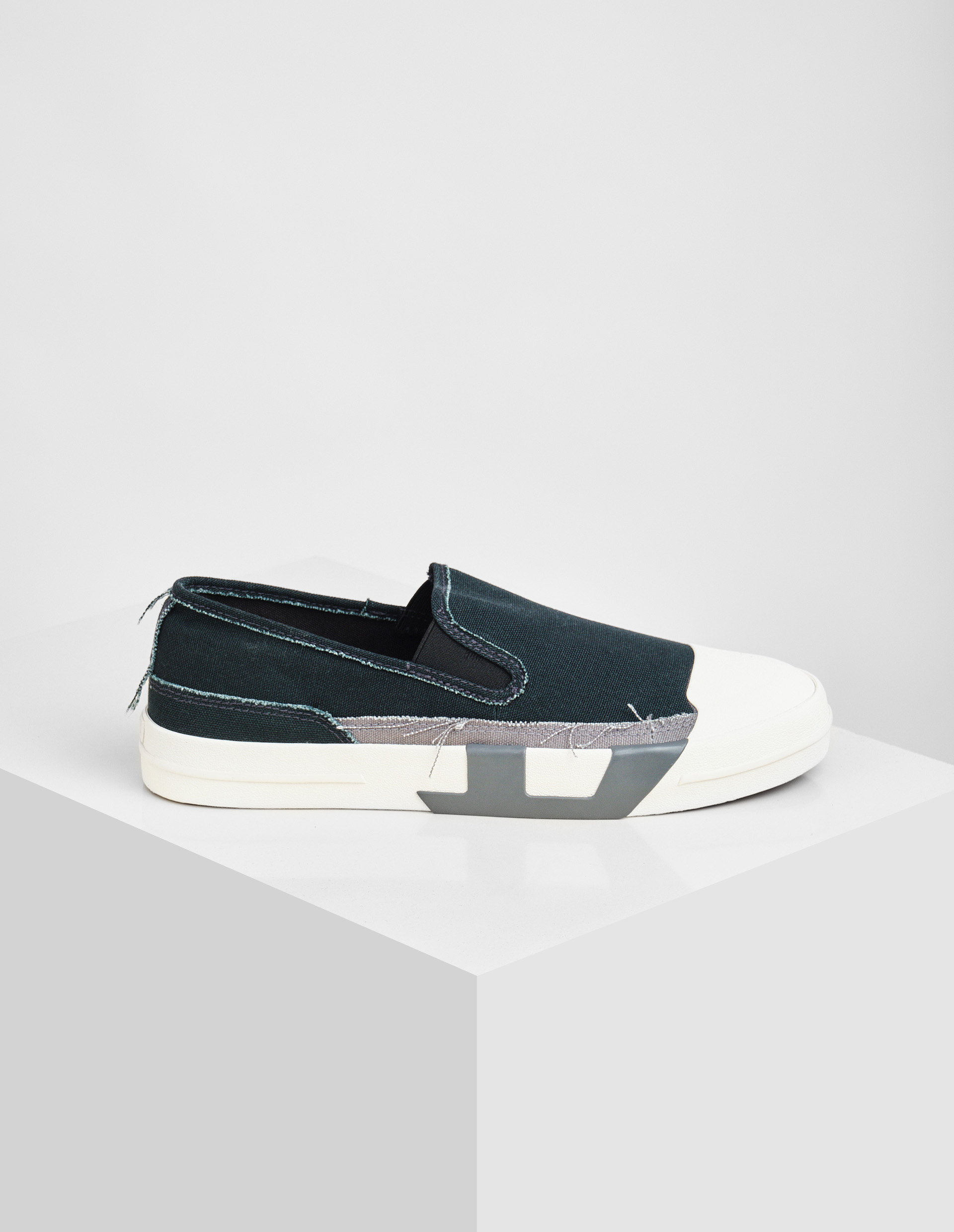 Слипоны Diesel — это микс деконструкции и выразительных деталей. Модель выполнена из плотного хлопкового холста с эффектом рваных краёв, подчёркивающих брутальность. Эластичные вставки по бокам обеспечивают удобную посадку, а защитные накладки на носке добавляют практичности. Главной дизайнерской особенностью выступает крупный логотип D на стыке верха и подошвы, выполненный в смешанной технике из резины и ткани – это дерзкая игра с формами и традиционной конструкцией обуви. Вулканизированная подошва с красным протектором не только гарантирует износостойкость, но и добавляет яркий акцент. Пара сочетает уличный шик с элементами промышленного дизайна, характерными для Diesel, предлагая свежий взгляд на повседневную обувь.