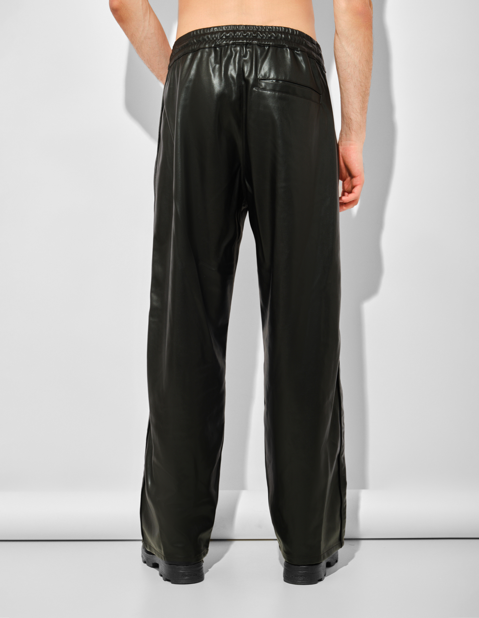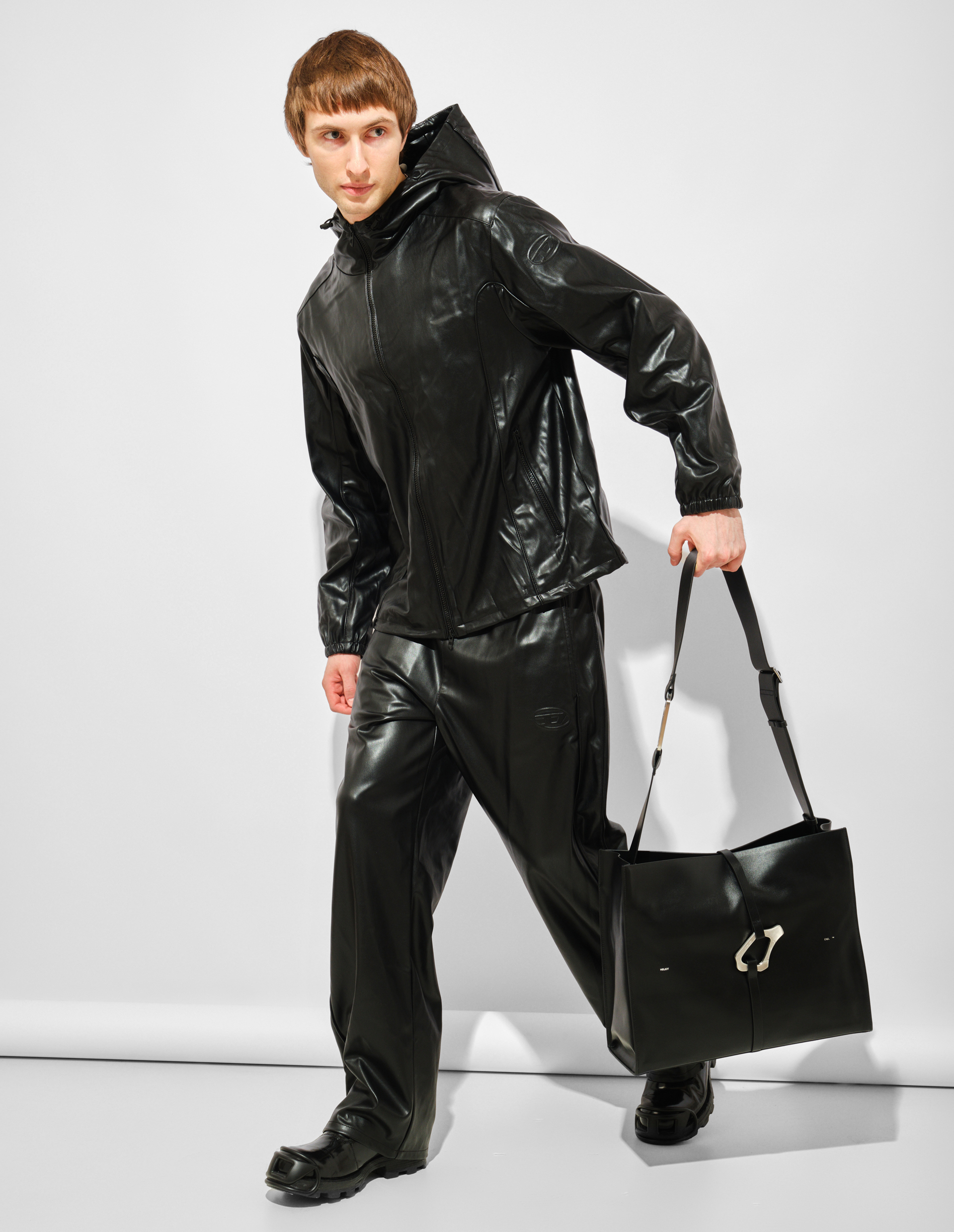 Брюки от Diesel переосмысливают классические кожаные штаны через призму современного комфорта и уличной эстетики, создавая вещь, которая работает как главный акцент любого образа. Модель прямого кроя выполнена из глянцевой эко-кожи высшего качества, которая сияет и переливается на свету, придавая брюкам индустриальный шик и футуристическую выразительность. Прямой крой создает чистый, современный силуэт, который визуально вытягивает ноги и добавляет образу скульптурной монументальности. Главная архитектурная деталь — кожаные лампасы вдоль боковых швов. Они задают четкую вертикальную линию, подчеркивая геометрию и делая ноги бесконечно длинными. Эластичный пояс с внутренними завязками обеспечивает идеальную посадку без лишнего давления, позволяя чувствовать себя свободно в течение всего дня, при этом сохраняя строгость кроя. Три врезных кармана добавляют функциональности, а тисненое лого слева становится сдержанной подписью мастера, заметной лишь тем, кто присматривается. В эру Гленна Мартенса Diesel переосмысливает даже самые простые формы, добавляя им архивированной глубины и современного звучания. Эти брюки — пример того, как спортивный комфорт встречает вечерний глянец, а утилитарность становится поводом для дизайнерского высказывания. Носите их с классическим пиджаком и белой футболкой для создания контраста фактур или с худи и массивными кроссовками для образа в духе современного стритвила. Благодаря универсальному черному цвету и прямому крою, они легко комбинируются с любой верхней одеждой и обувью
