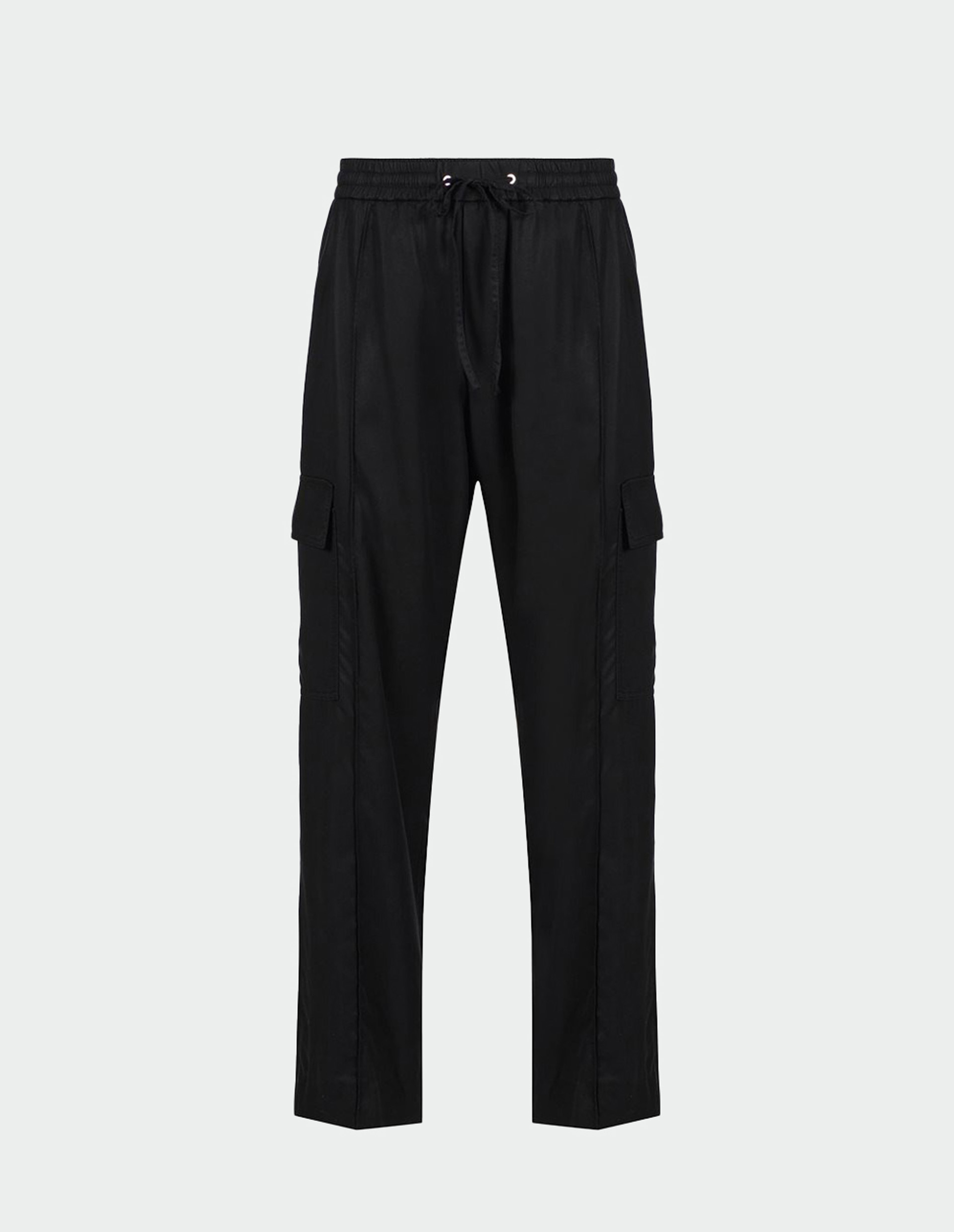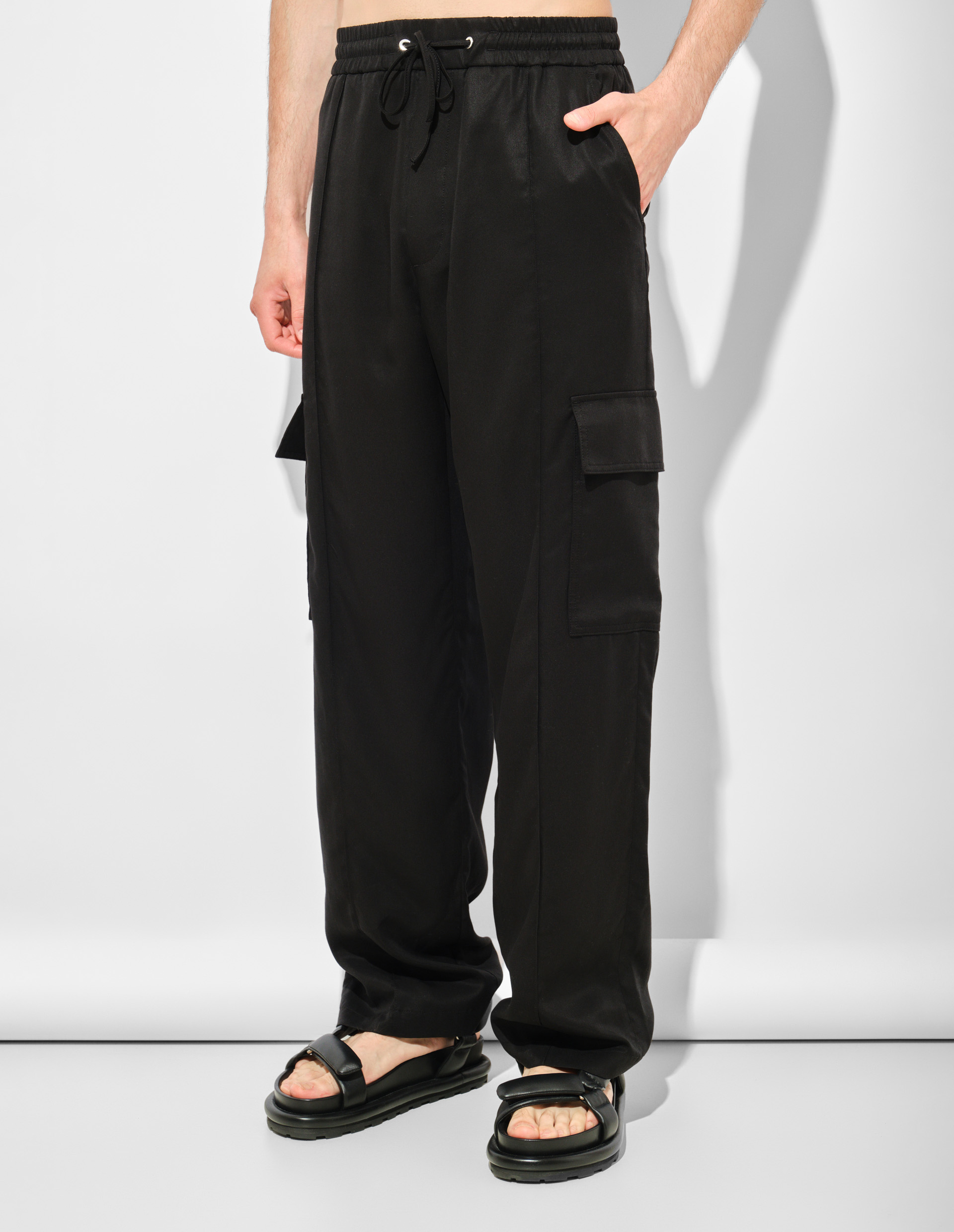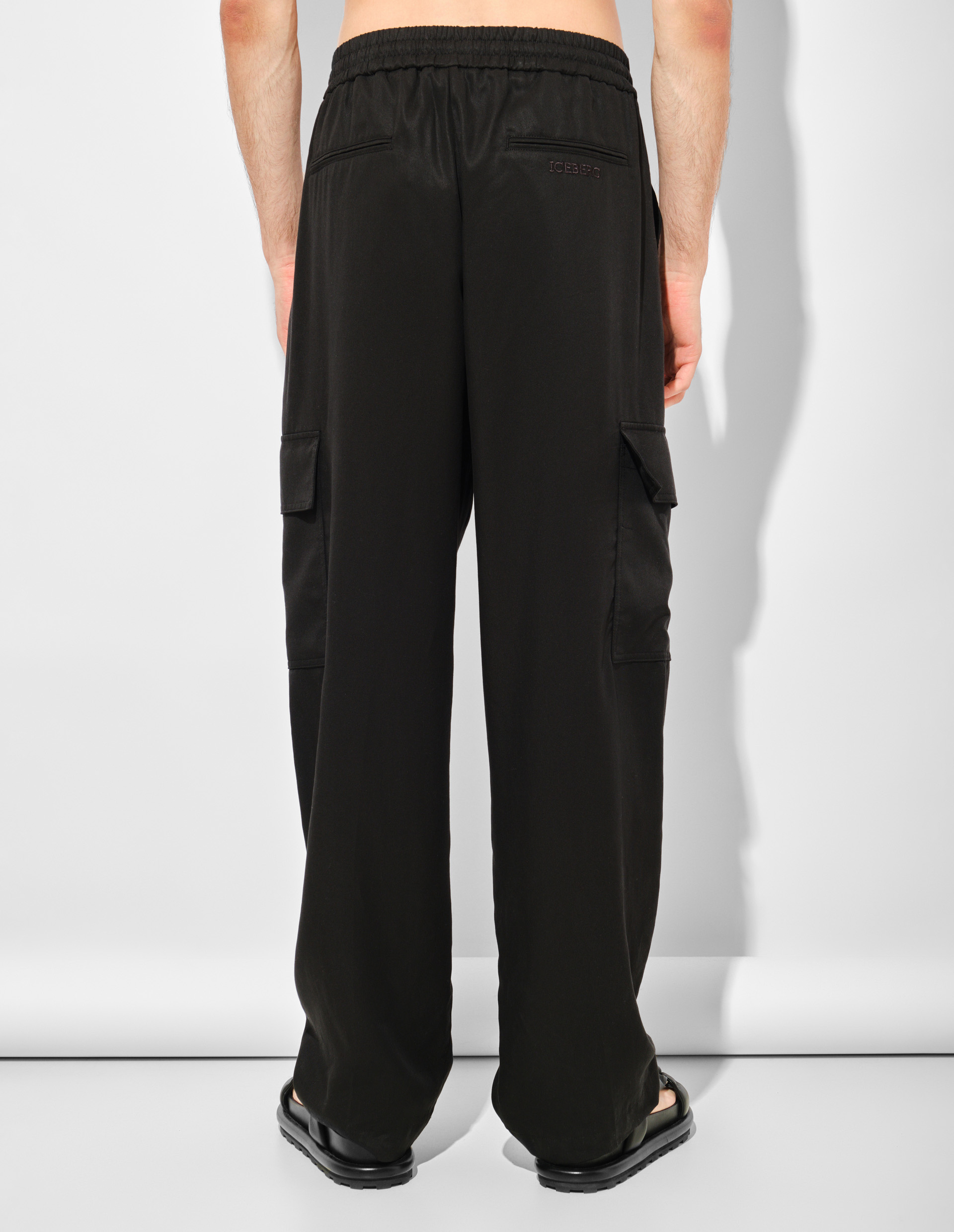 Черные брюки из струящегося тенселя переосмысливают утилитарный стиль, соединяя практичность и элегантность. Объемные клапаны карманов на бедрах подчеркивают функциональность, а вышивка Iceberg справа добавляет брендовый лоск. Эластичный пояс с кулиской обеспечивает идеальную посадку и комфорт в движении. Универсальная модель для создания утонченного образа с характерным почерком ICEBERG, соединяющего повседневность с безупречным кроем и делающим заявление о том, что даже в casual-гардеробе есть место для дисциплинированной эстетики.