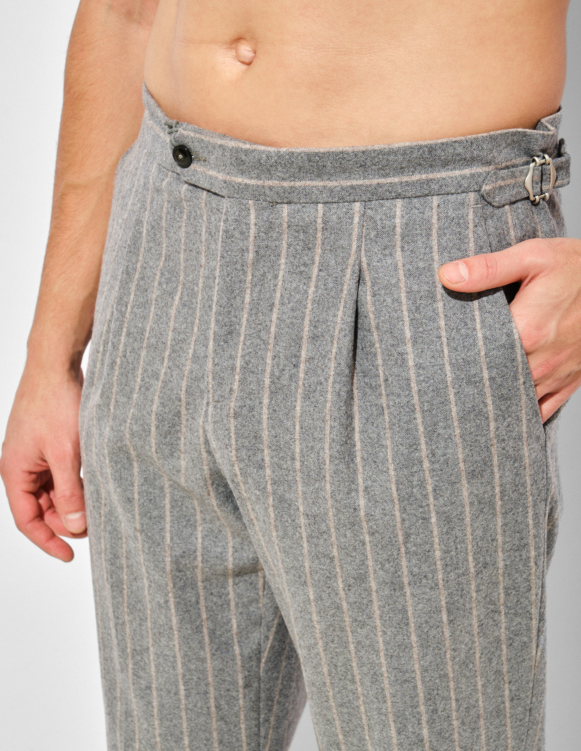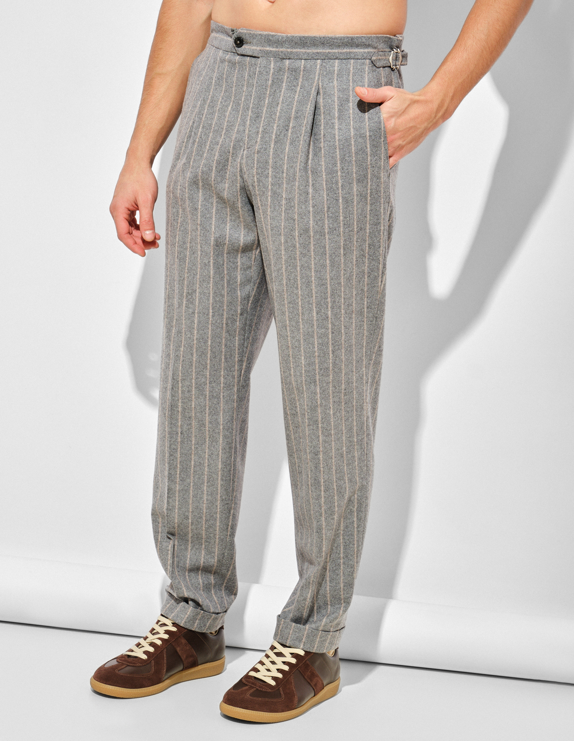 В ДНК Paul Taylor заложена игра со стилем, которую вы можете начать, примерив эти эксклюзивные брюки. Материал из смесовой шерсти покорит комфортными ощущениями, а принт в полоску задаст силуэту графичность и настроение в духе современного дэнди, которое также поддерживается подворотными манжетами. Изысканный внешний вид модели дополняется функциональными деталями в виде скрытых застежек, боковых карманов и регулируемых ремешков по бокам пояса, позволяющих адаптировать посадку именно к вашей фигуре.