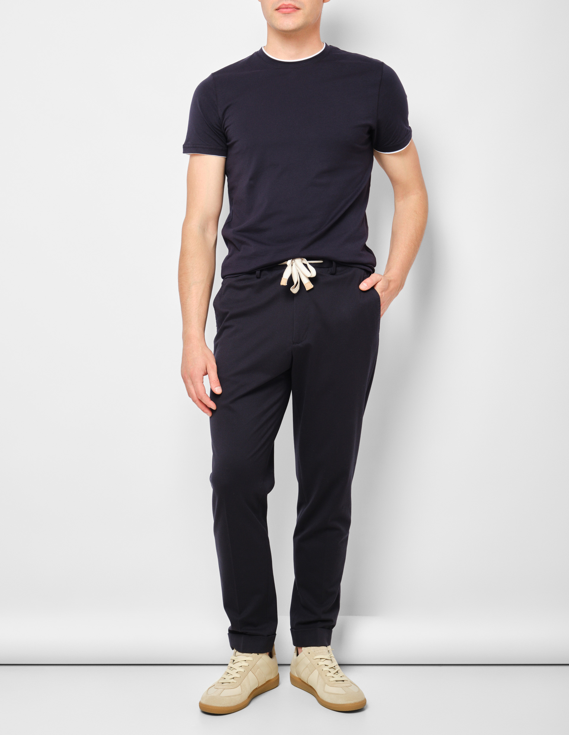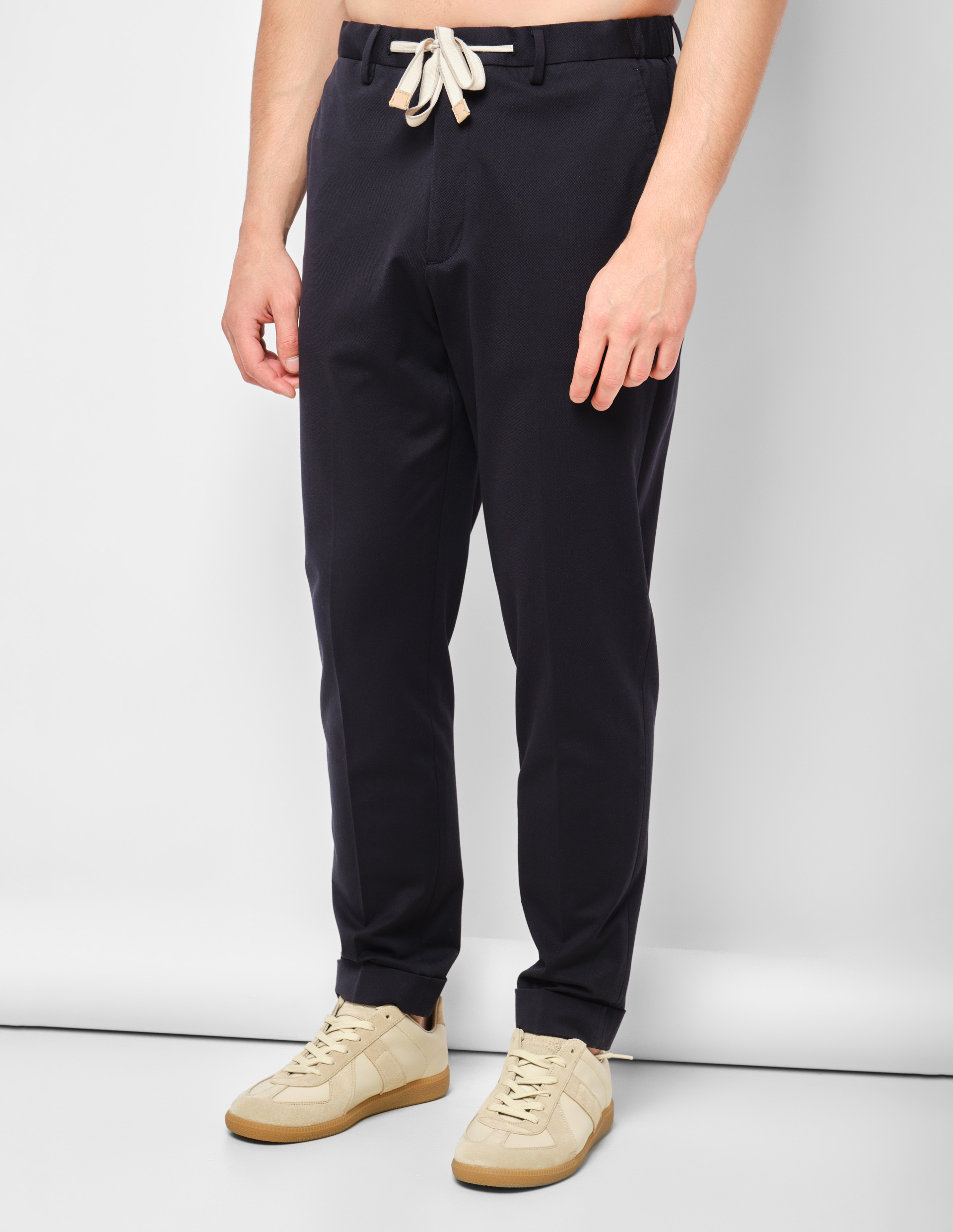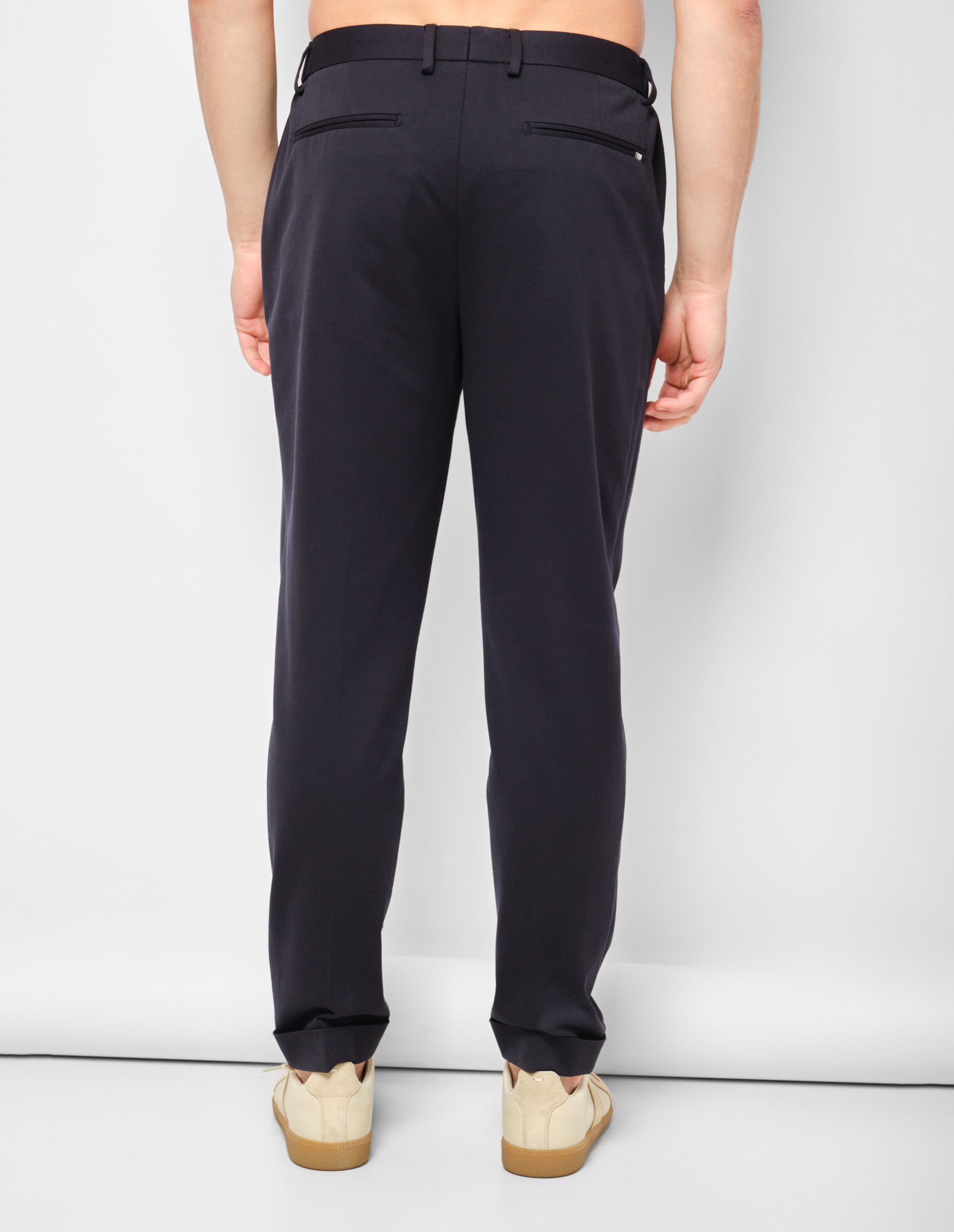 Удобная и практичная модель из 100% хлопка «пике». Легкая ткань отличается высокой прочностью благодаря специальному сложному плетению. Концепцию комфорта продолжает пояс с завязками, который можно маскировать под ремнем, скрытая резинка по бокам и свободная посадка в области бедер. Брюки снабжены 5 карманами: двумя боковыми, двумя прорезными задними и маленьким для монет. Манжеты вносят акцент неформальности в классическую модель со стрелками и лаконичным дизайном. Универсальный синий эффектно сочетается как с темным, так и со светлым верхом.