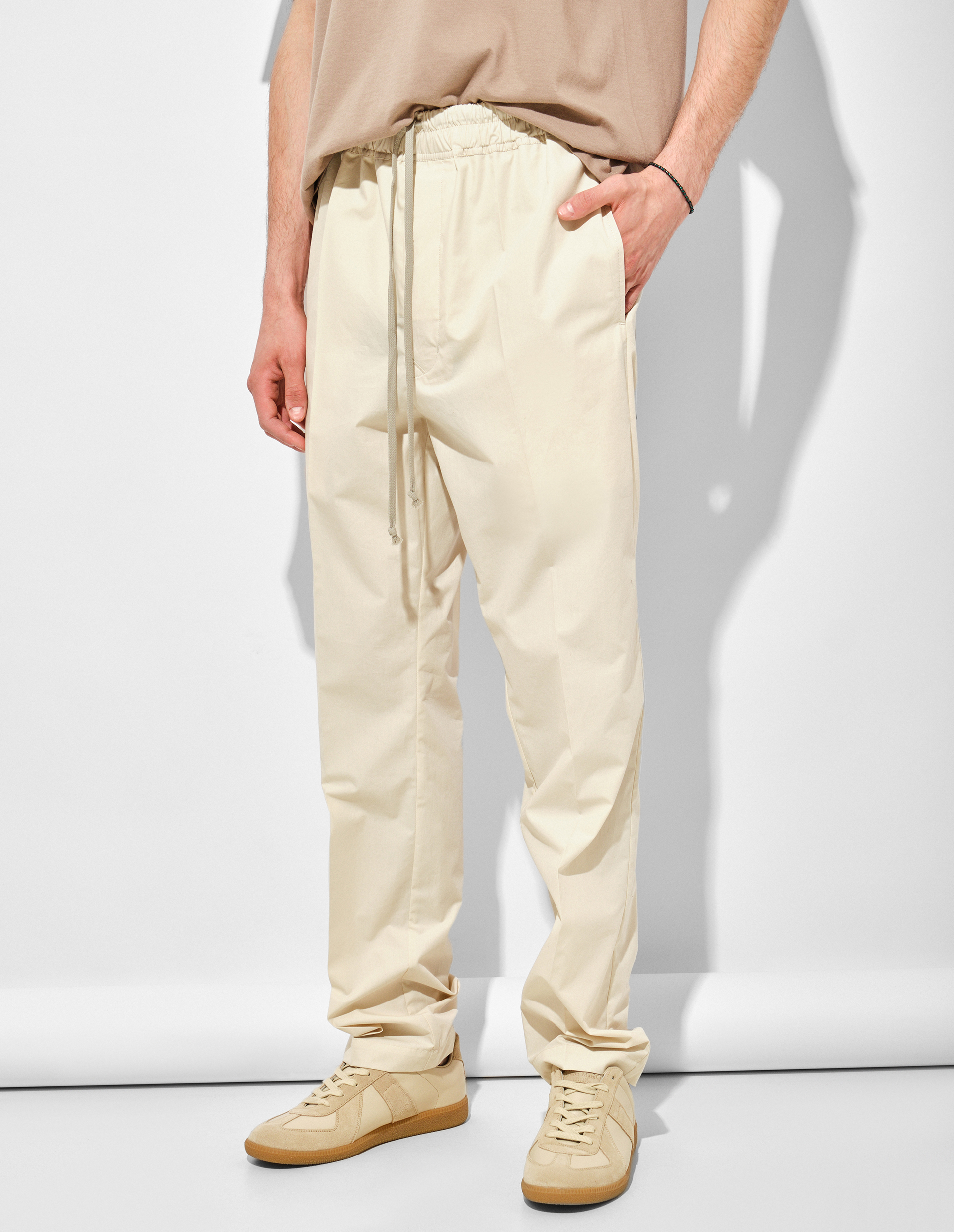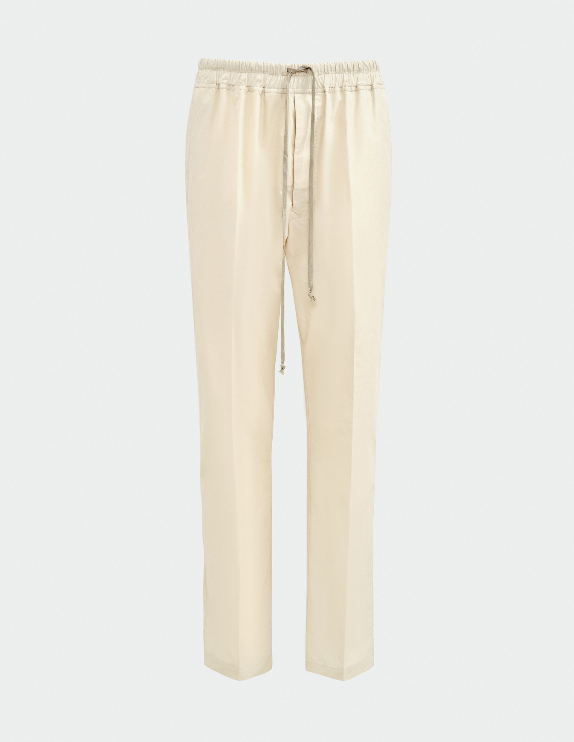 Слегка зауженный крой с эластичным поясом на шнурке и скрытой застежкой сочетает в себе дисциплину и комфорт, а стрелки спереди подчеркивают архитектурную точность линий.