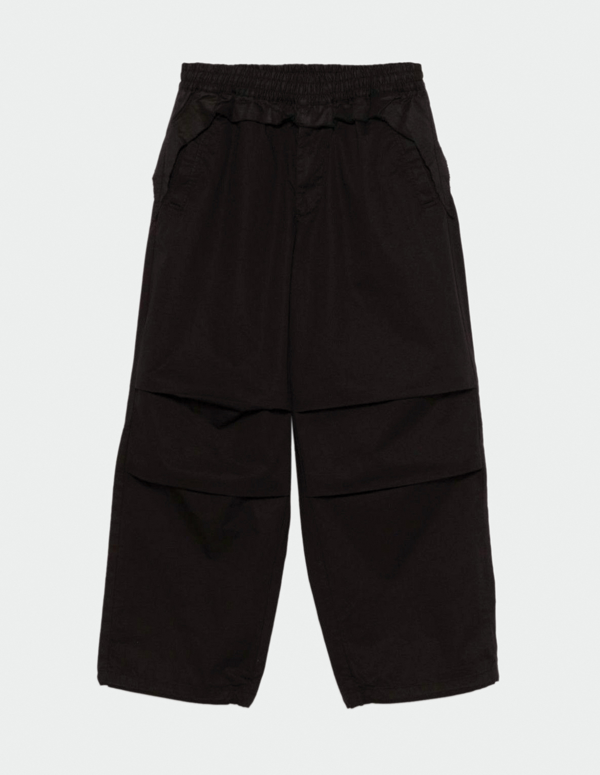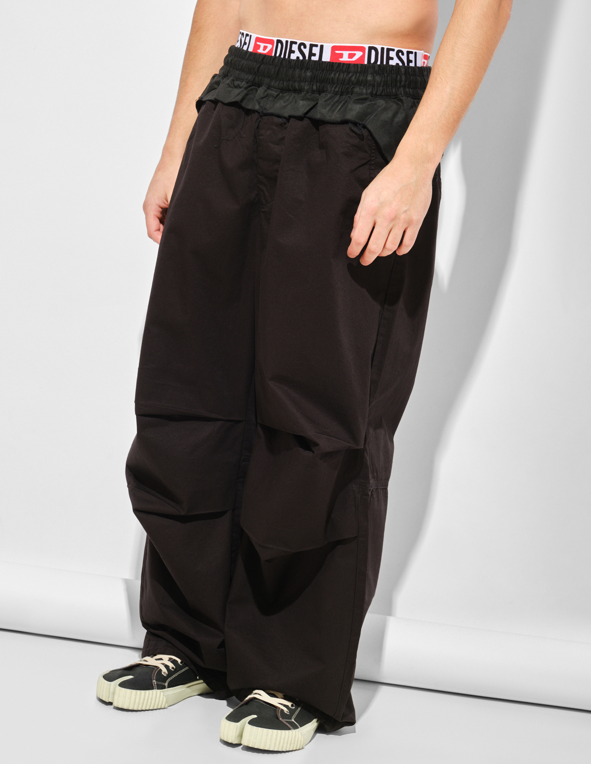 P-GUSTAF миксует уникальный дизайн и инновационные материалы. Это хлопковый микро-твил с обработкой Stone Washed и нейлон на эластичном поясе с необработанной, словно оторванной панелью — демонстрация эксклюзивного кроя в бунтарском духе Diesel. Он также находит продолжение в широком силуэте с защипами на коленях, что делает модель практичным и ярким элементом городского образа.