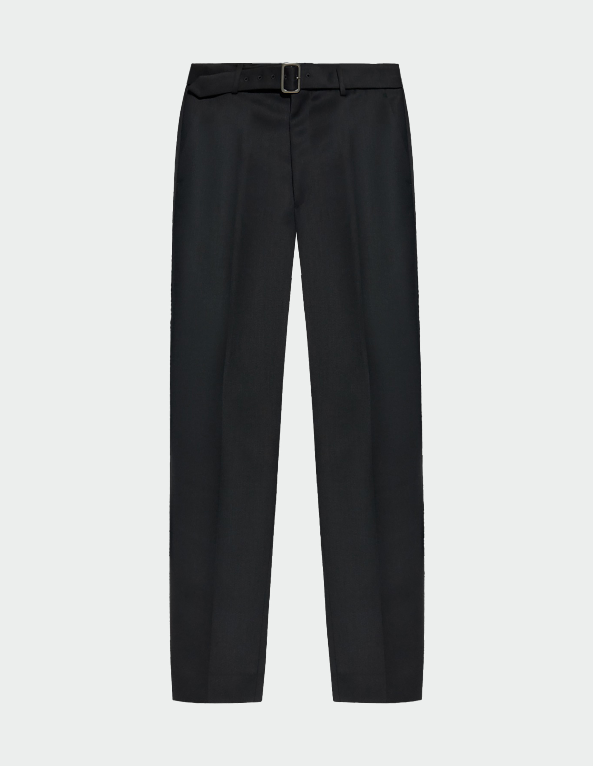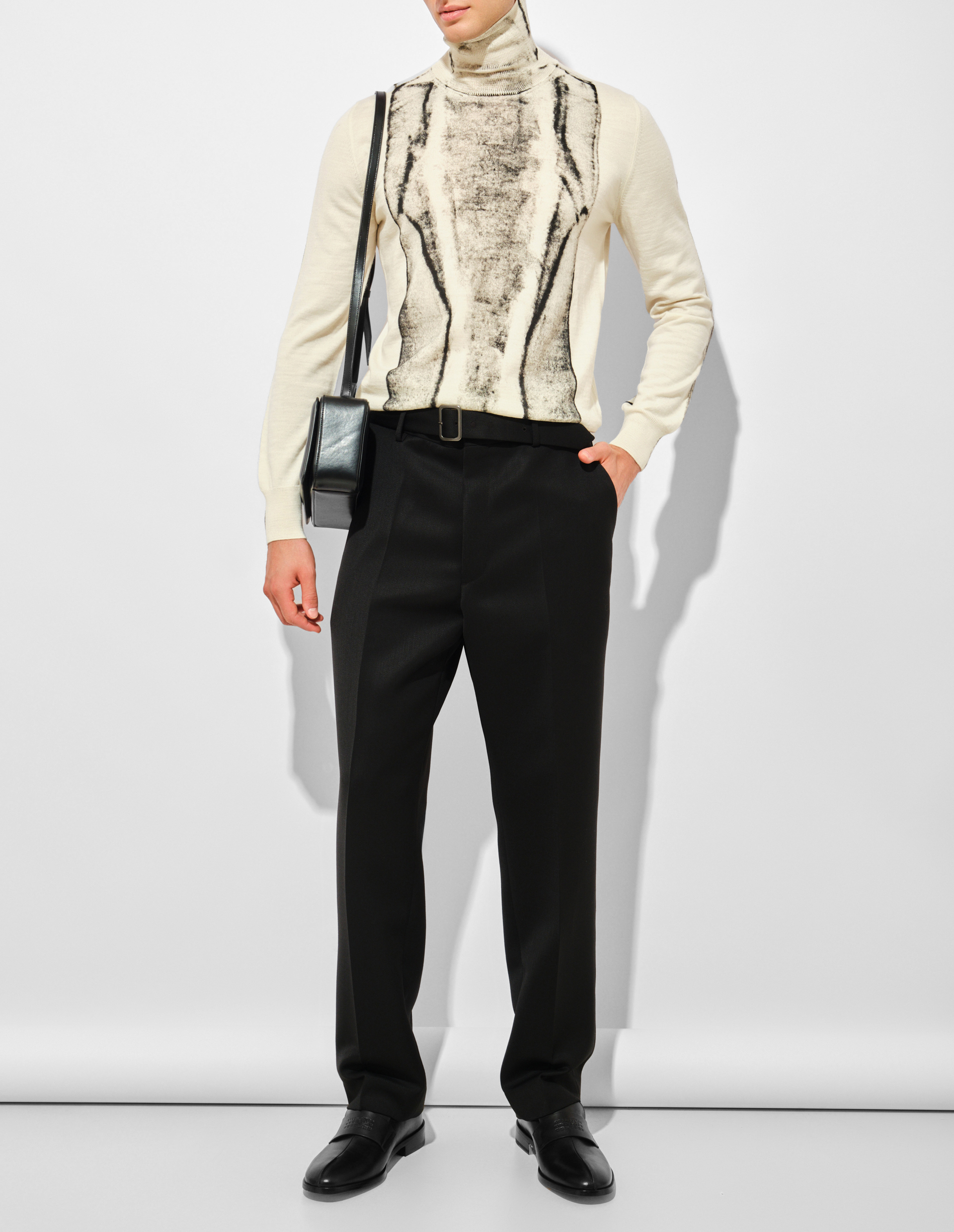 Брюки из шерстяного габардина с завышенной талией и стрелками преобразуют классический костюмный силуэт через контраст утилитарных деталей. Застежка на молнию с пуговицей и крючком, накладные карманы и текстильный ремень создают сложную систему закрепления, отсылающую к индустриальной эстетике. Терморегулирующие свойства шерсти подчеркивают функциональный подход MM6, где традиционная элегантность наделяется деконструктивным жестом через намеренное смешение формальных и практических кодов.