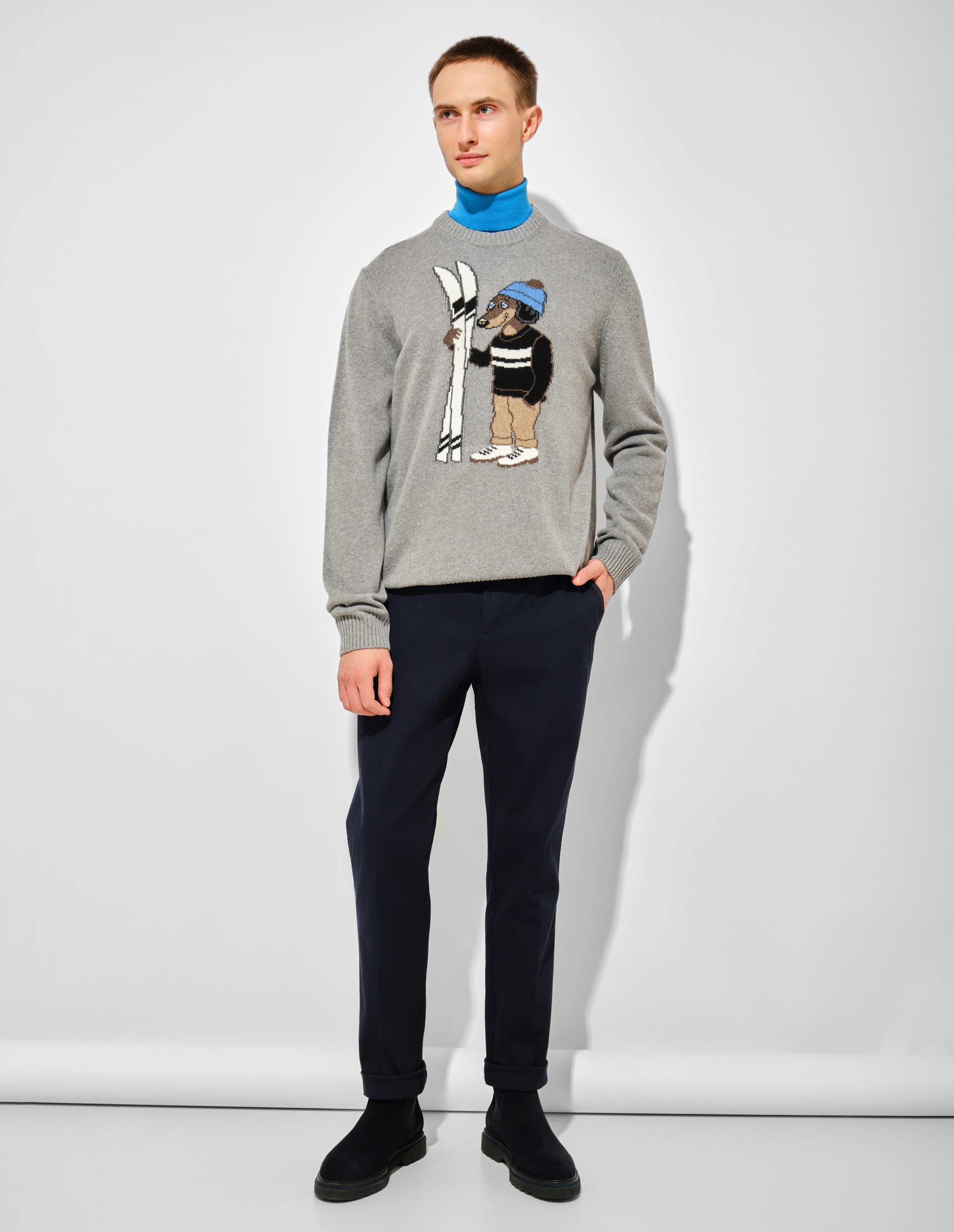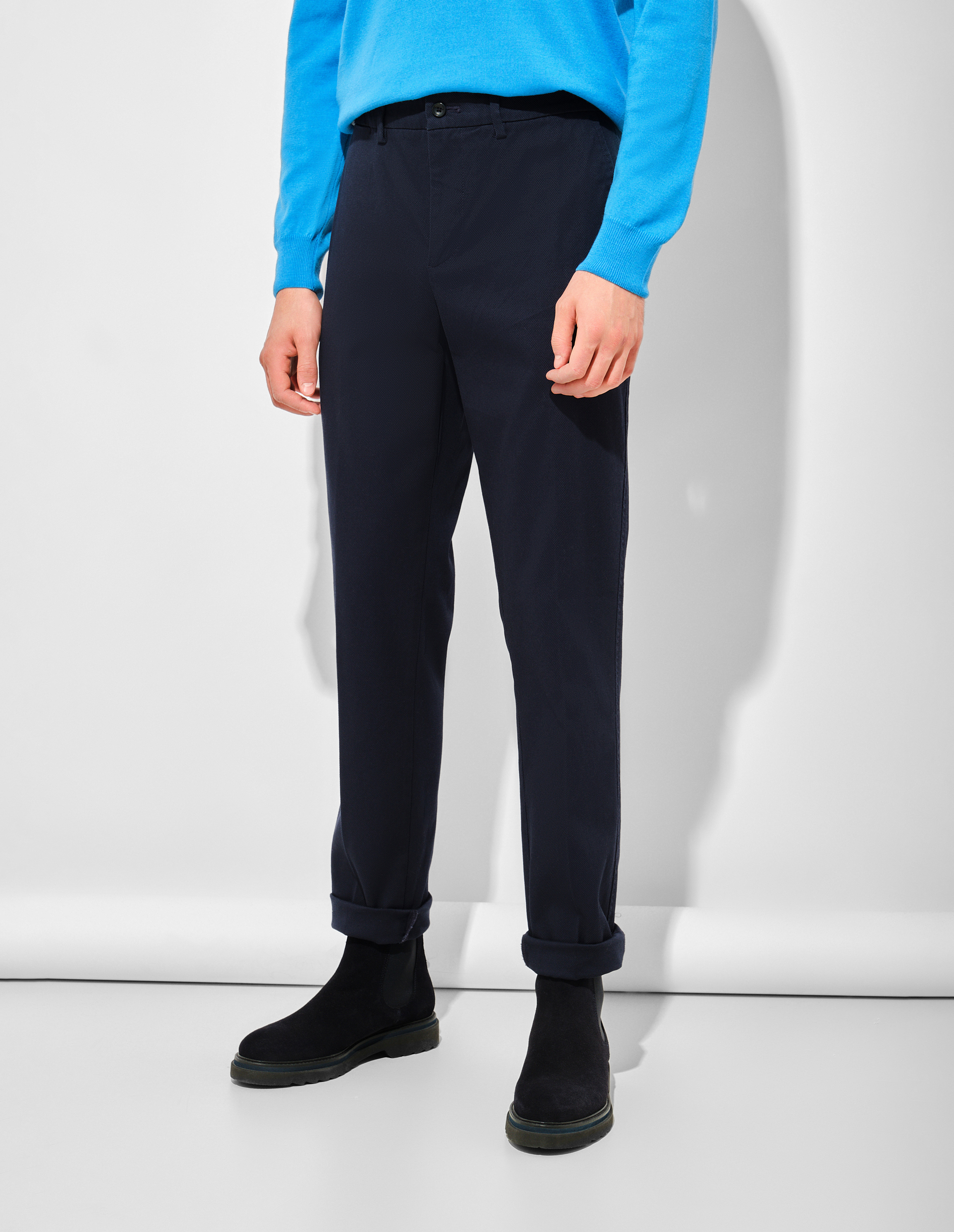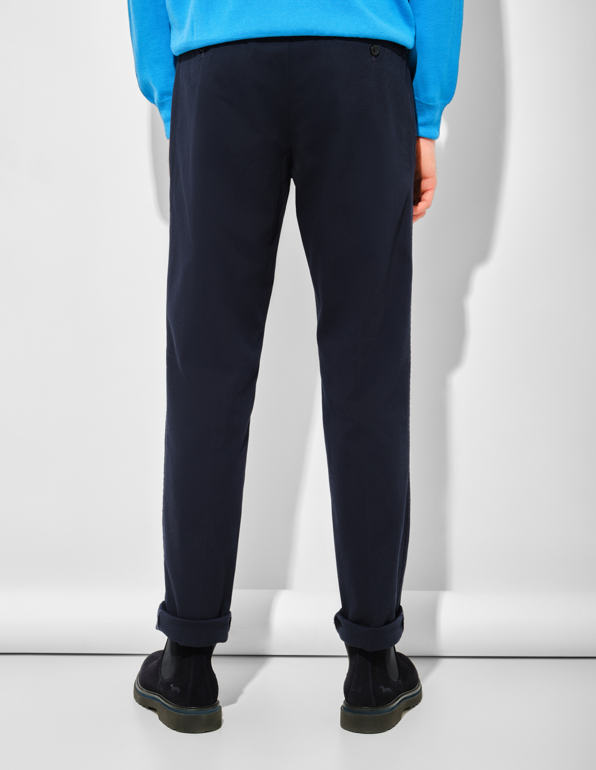 Олицетворяя smart-элегантность, эти чинос из FW25 Winter Bloom становятся основой современного гардероба. Их сдержанный дизайн с лаконичным кроем идеально соответствует духу коллекции, где городская эстетика встречается с индивидуальностью. Модель оснащена практичными боковыми карманами и задними прорезными, где красуется фирменная вышивка с таксой Блэйн — символом авантюрного духа Harmont&Blaine. Застежка на потайную молнию и пуговицу, а также шлевки для ремня подчеркивают чистоту линий и продуманность деталей.
