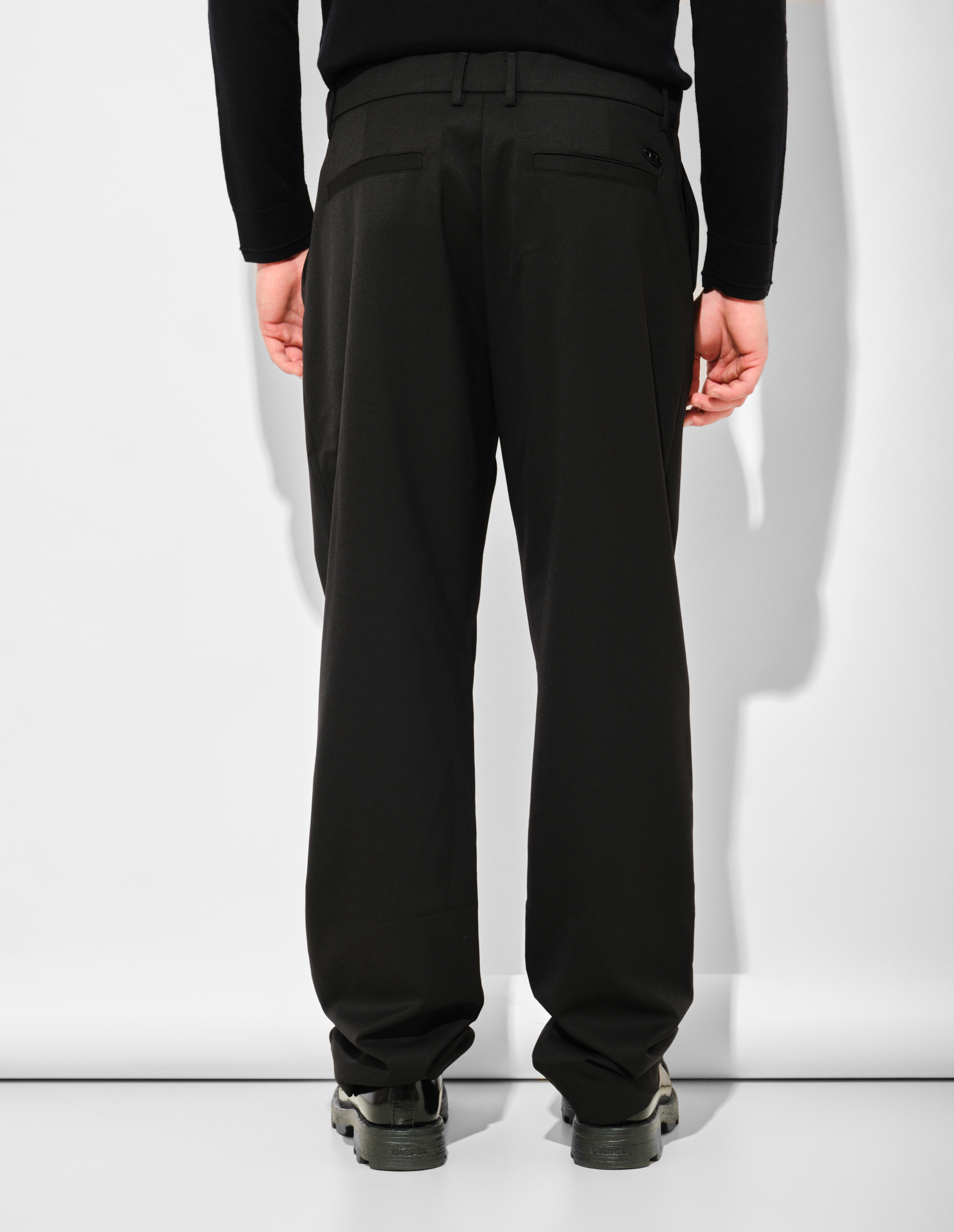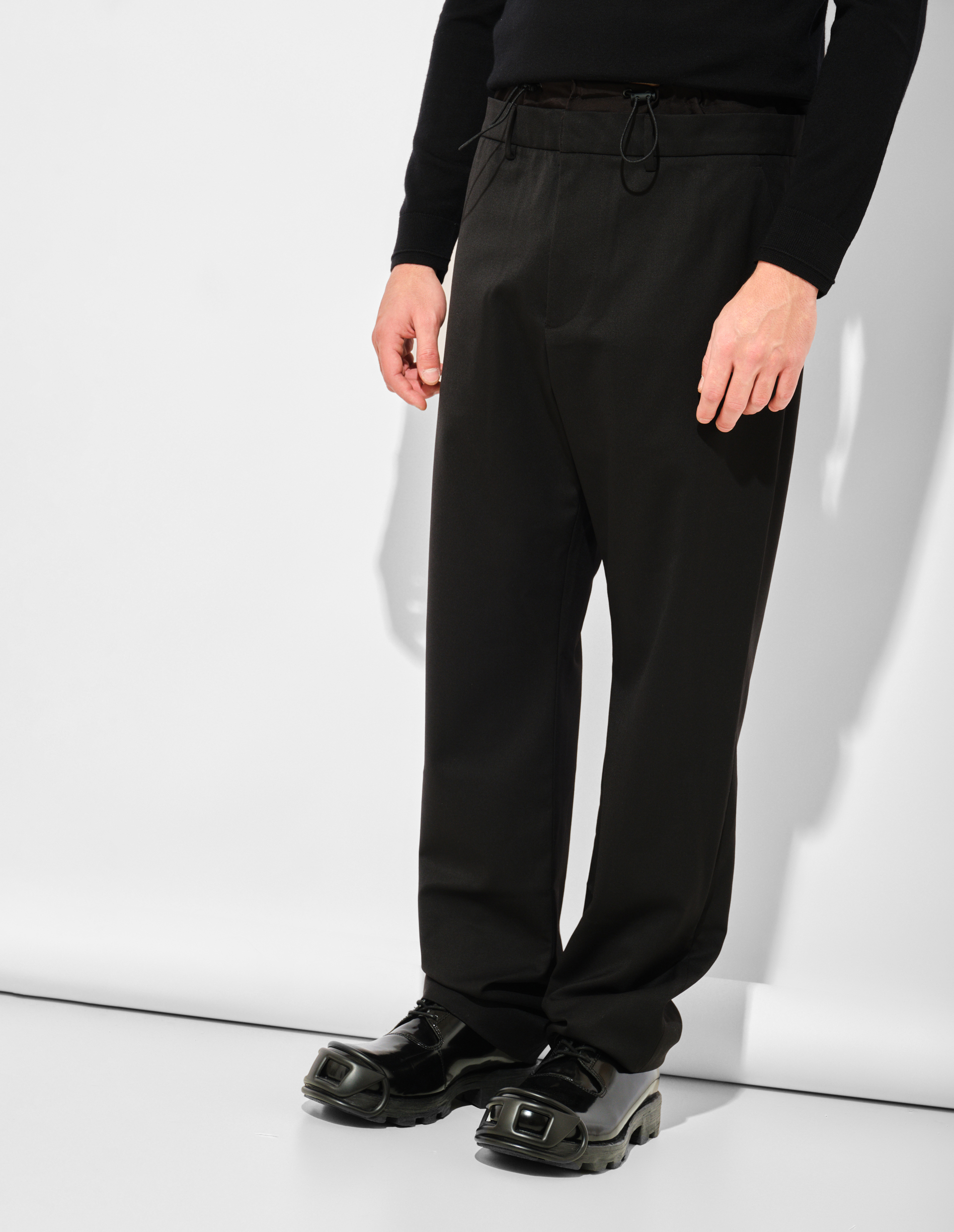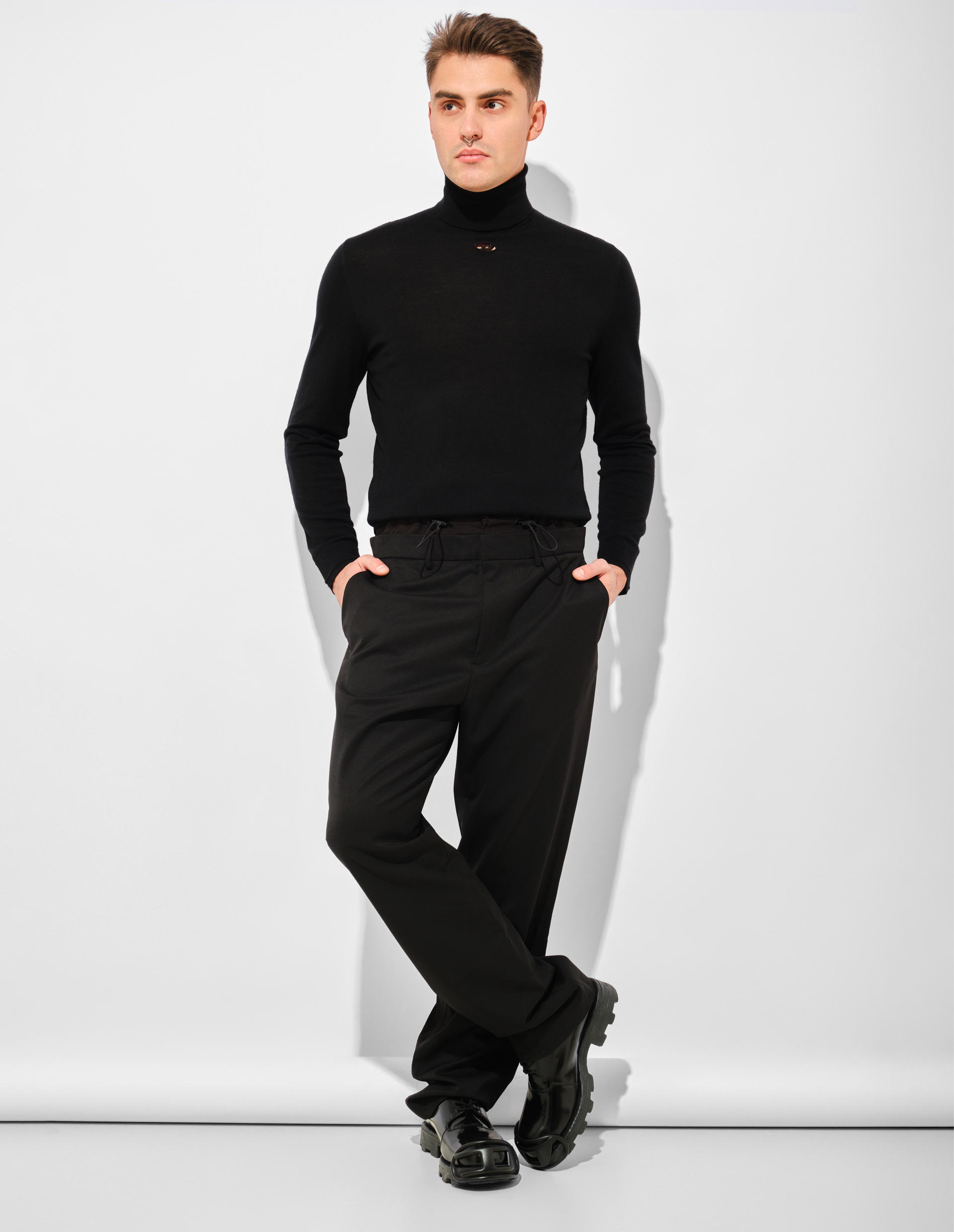 Брюки прямого кроя из шерстяной смеси — синтез утилитарности и безупречного кроя. Эластичный пояс с контрастной нейлоновой стропой и шнурком сочетается с многоуровневой застежкой: молния, пуговица и внутренний крючок создают сложную конструкцию в духе индустриальной эстетики Diesel. Передние карманы и классические отделения сзади подчеркивают сдержанную элегантность, а металлическая пластина с логотипом Oval D становится финальным акцентом.