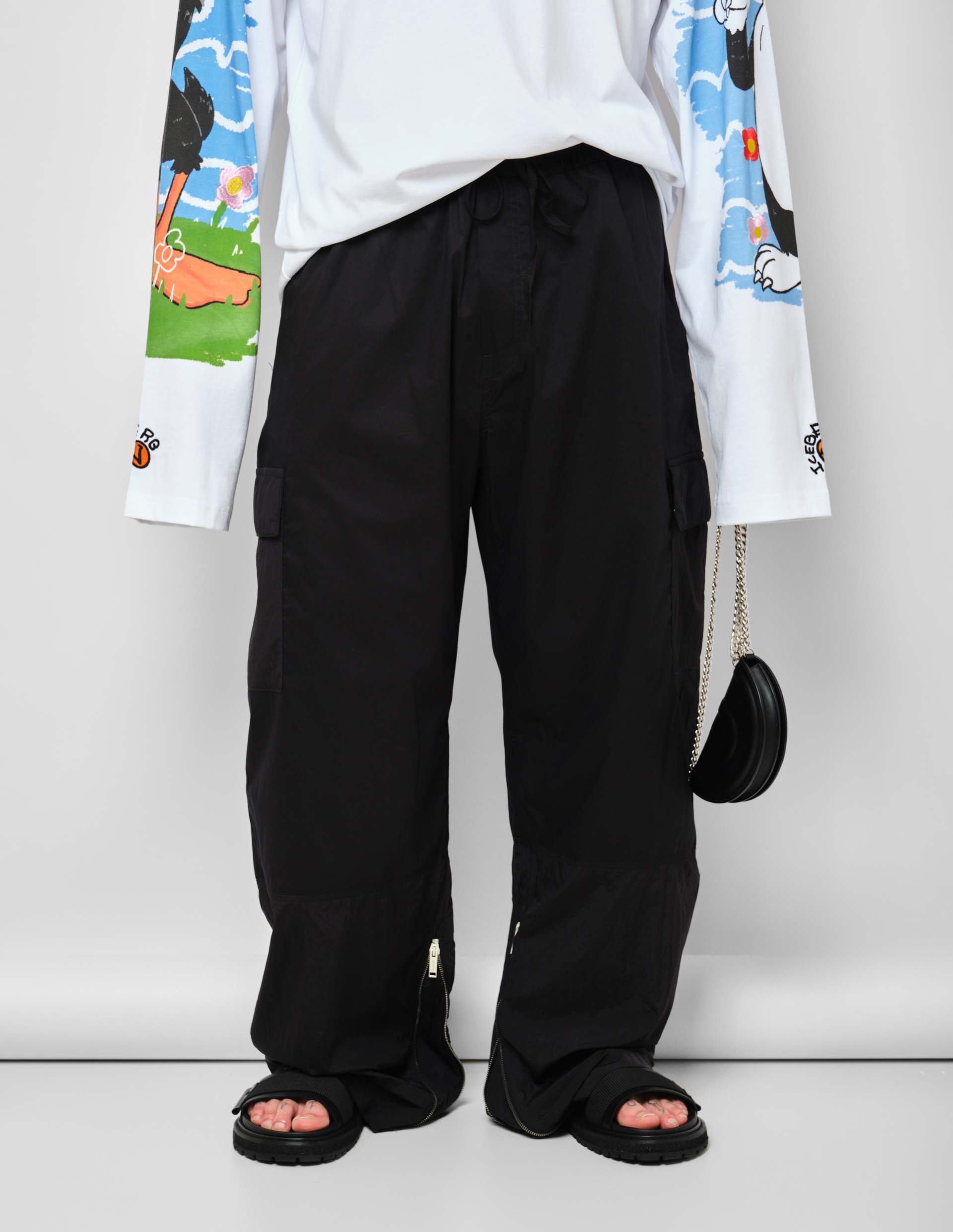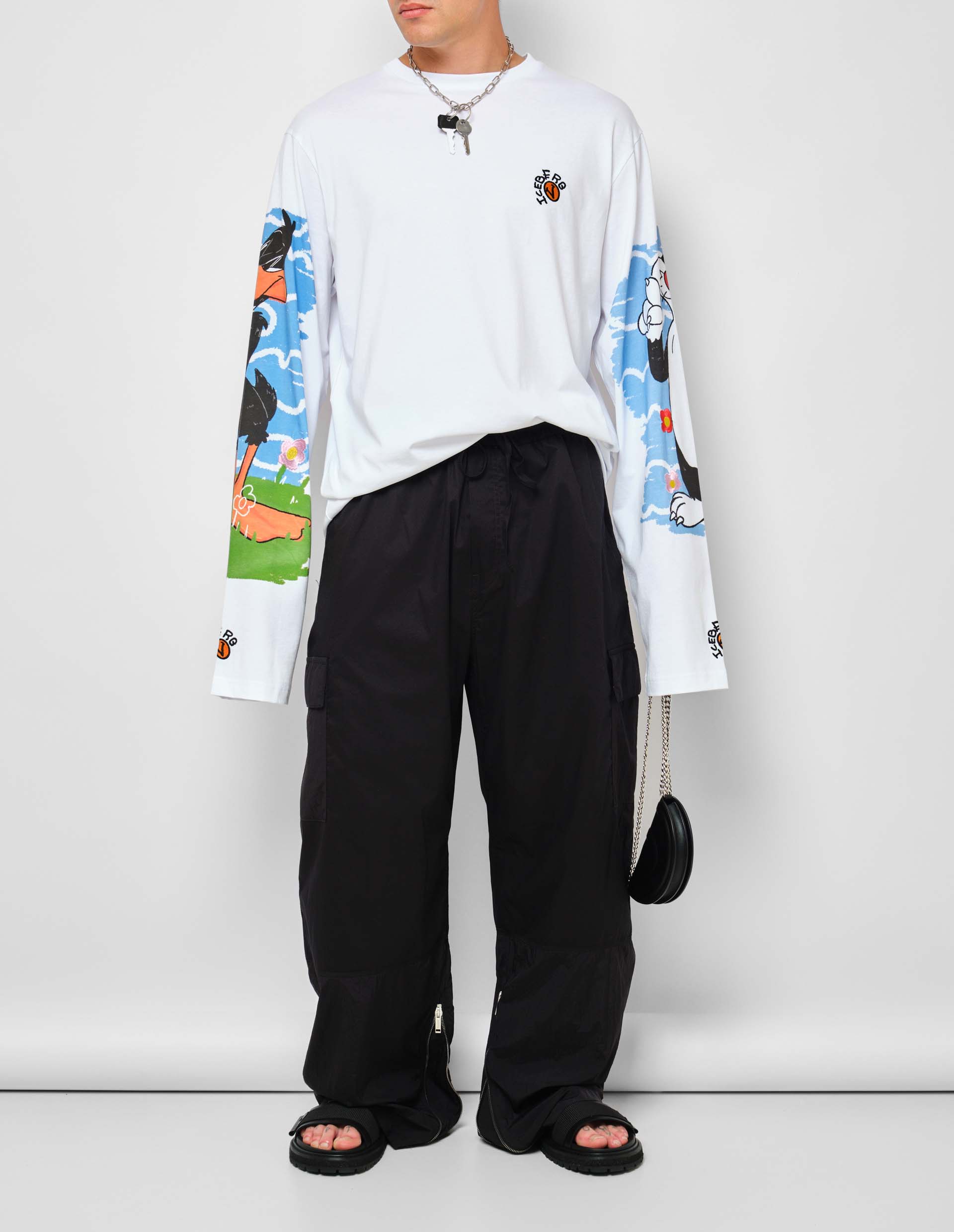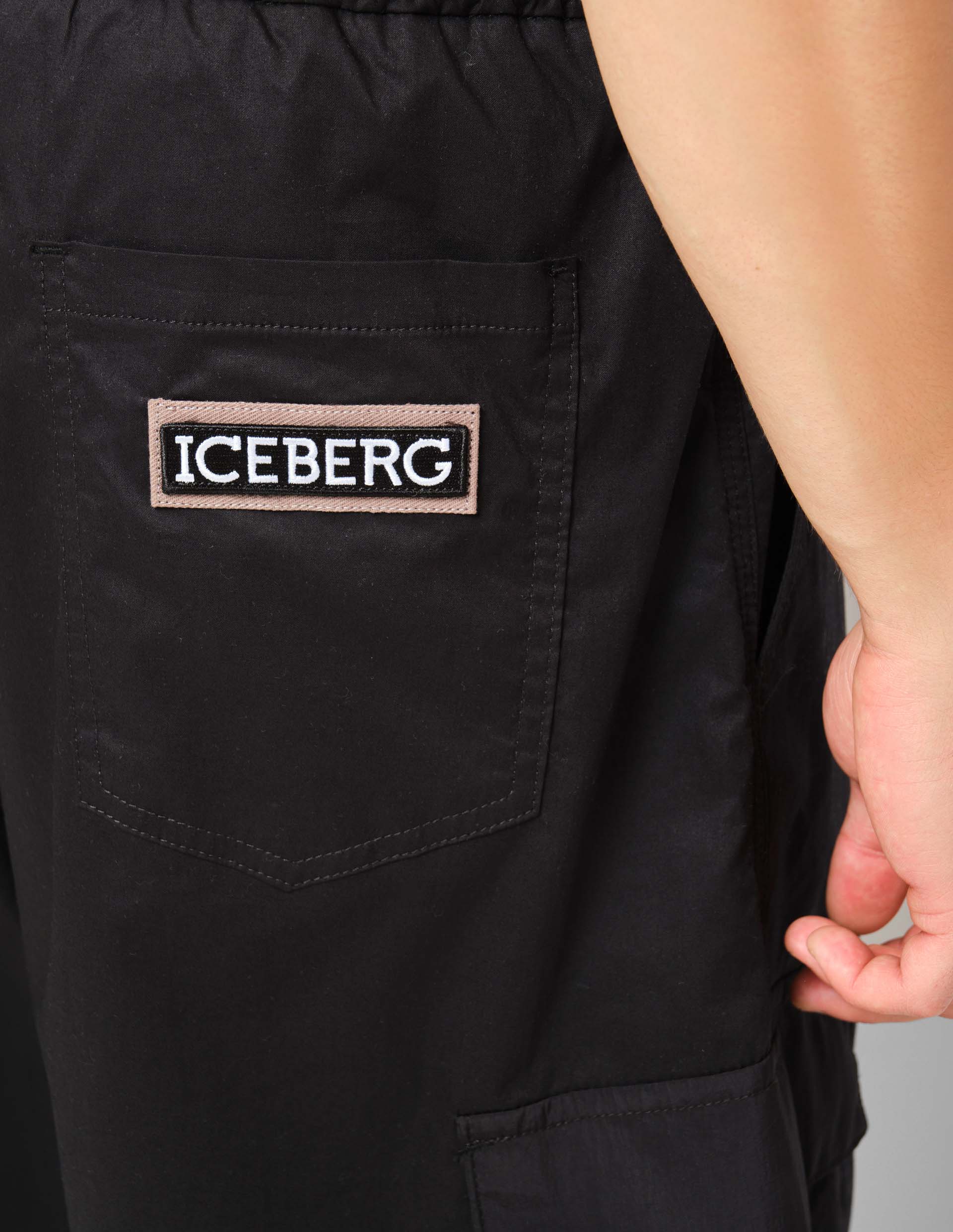 Брюки дополнены эластичным поясом с кулиской для идеальной посадки, большими боковыми карманами на уровне колен и молниями на внутренней стороне штанин, добавляющими функциональность и немного гранжа. Сзади нанесена нашивка с логотипом Iceberg, вышитая с 3D-эффектом. Эти карго свободного силуэта идеально подходят для смелого повседневного образа.