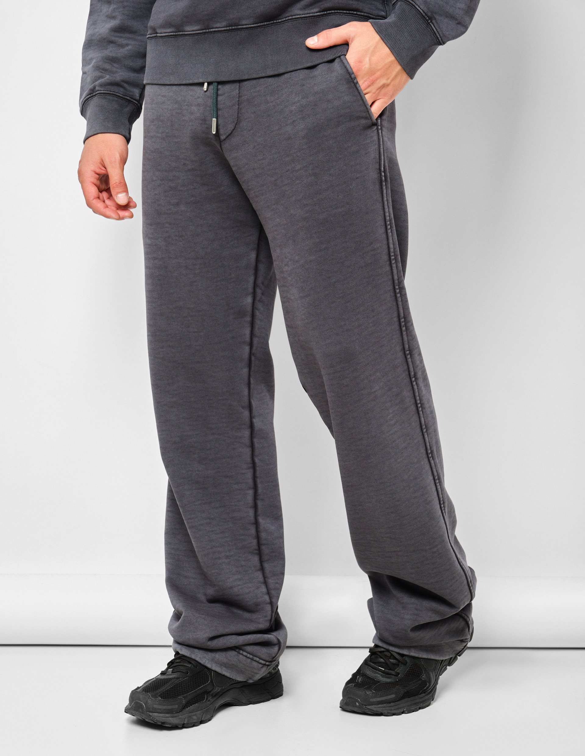 Темно-серые спортивные брюки HAMER задают расслабленный тон своим акцентным оттенком мокрого асфальта с эффектом выцветшей ткани, а их свободный прямой крой обеспечивает непревзойденный комфорт без ущерба для стиля. Изделие дополнено функциональными карманами по бокам, а концептуальность и современный дизайн гарантирован контрастными швами по всей модели, благодаря чему эти брюки легко адаптируются к любому гардеробу и образу. Создайте практичный total look вместе с темно-серым свитшотом HAFFEL с накладными карманами от бренда Dries Van Noten.