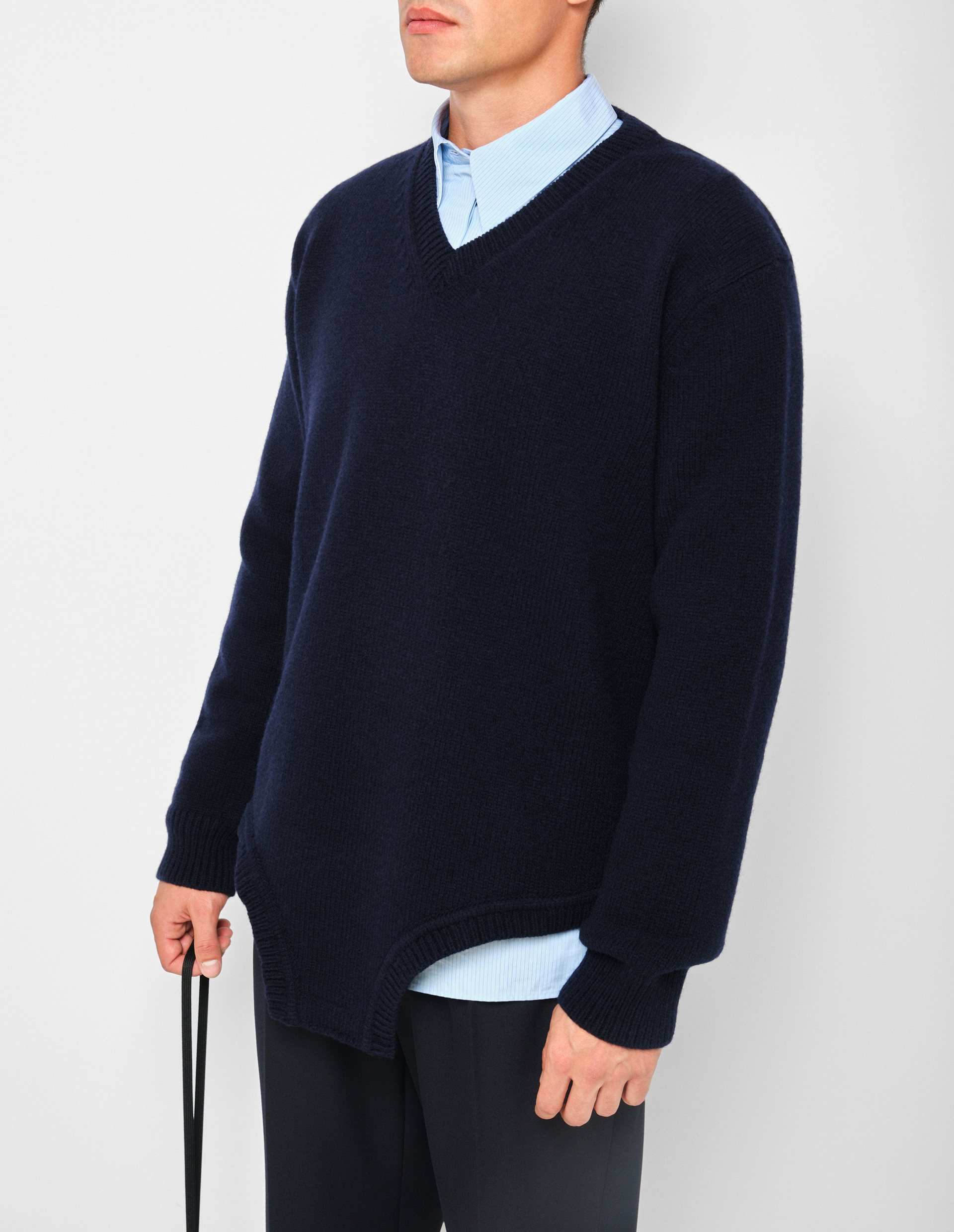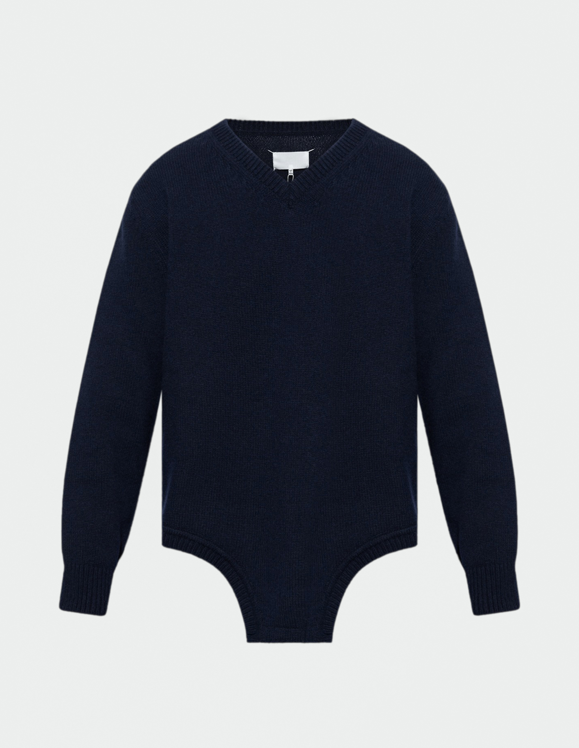 Модель объединяет наследие портновского пошива Maison Margiela с видением будущего, когда базовая вещь приобретает авангардное выражение. И тогда благодаря нонконформистскому подходу Дома переосмысливаются классические линии в современные дресс-коды: традиционный джемпер с V-образным вырезом становится настоящим боди. В качестве балансирующего элемента выступает оттенок, похожий на цвет вечернего неба, и безупречный трикотаж на основе 100% шерсти. Сзади расположен фирменный, культовый знак в виде четырех белых стежков.