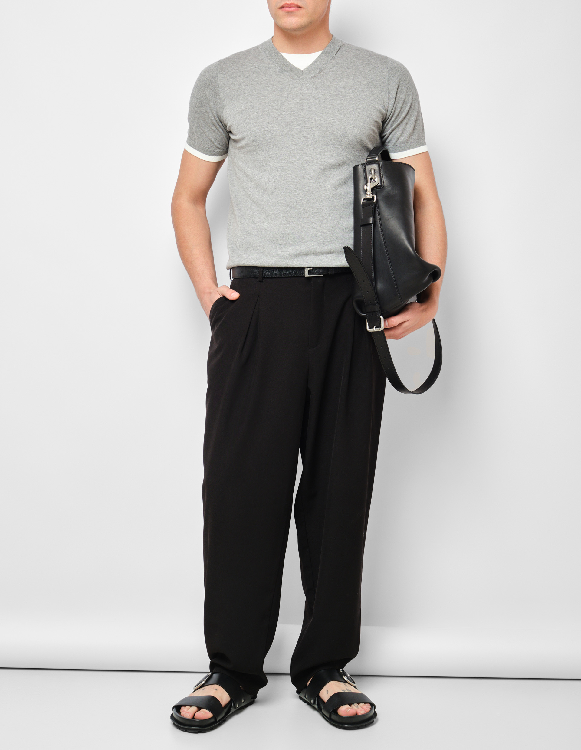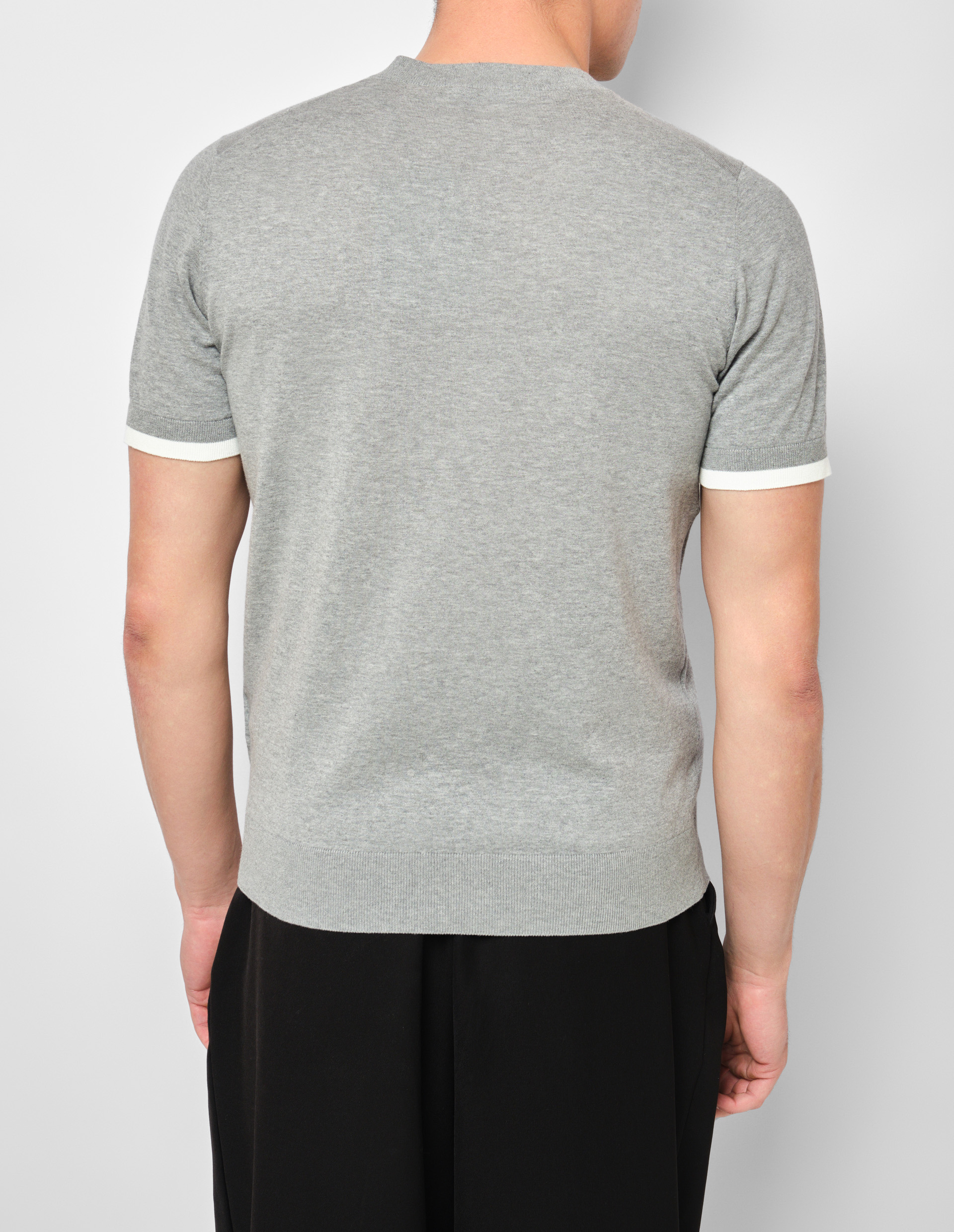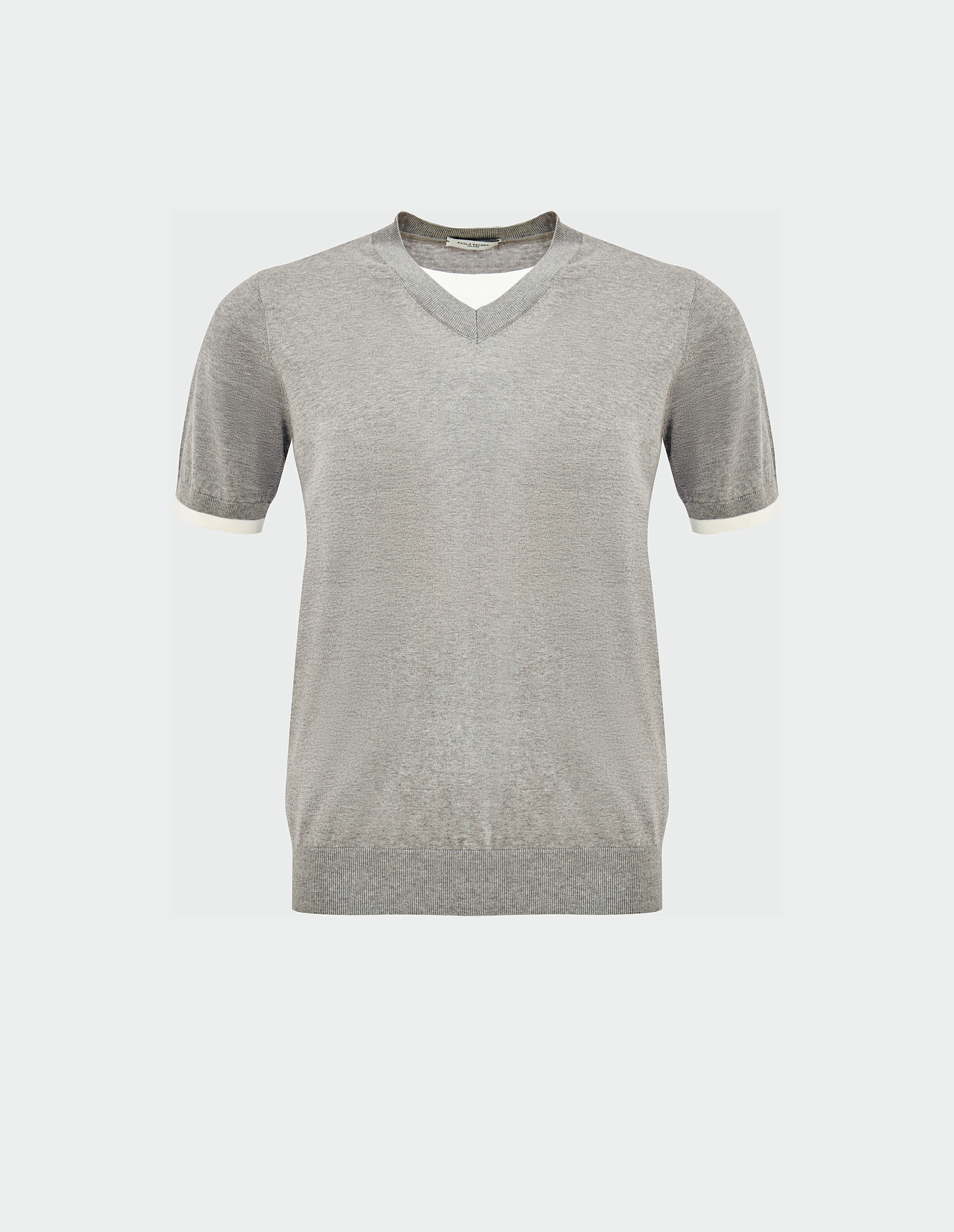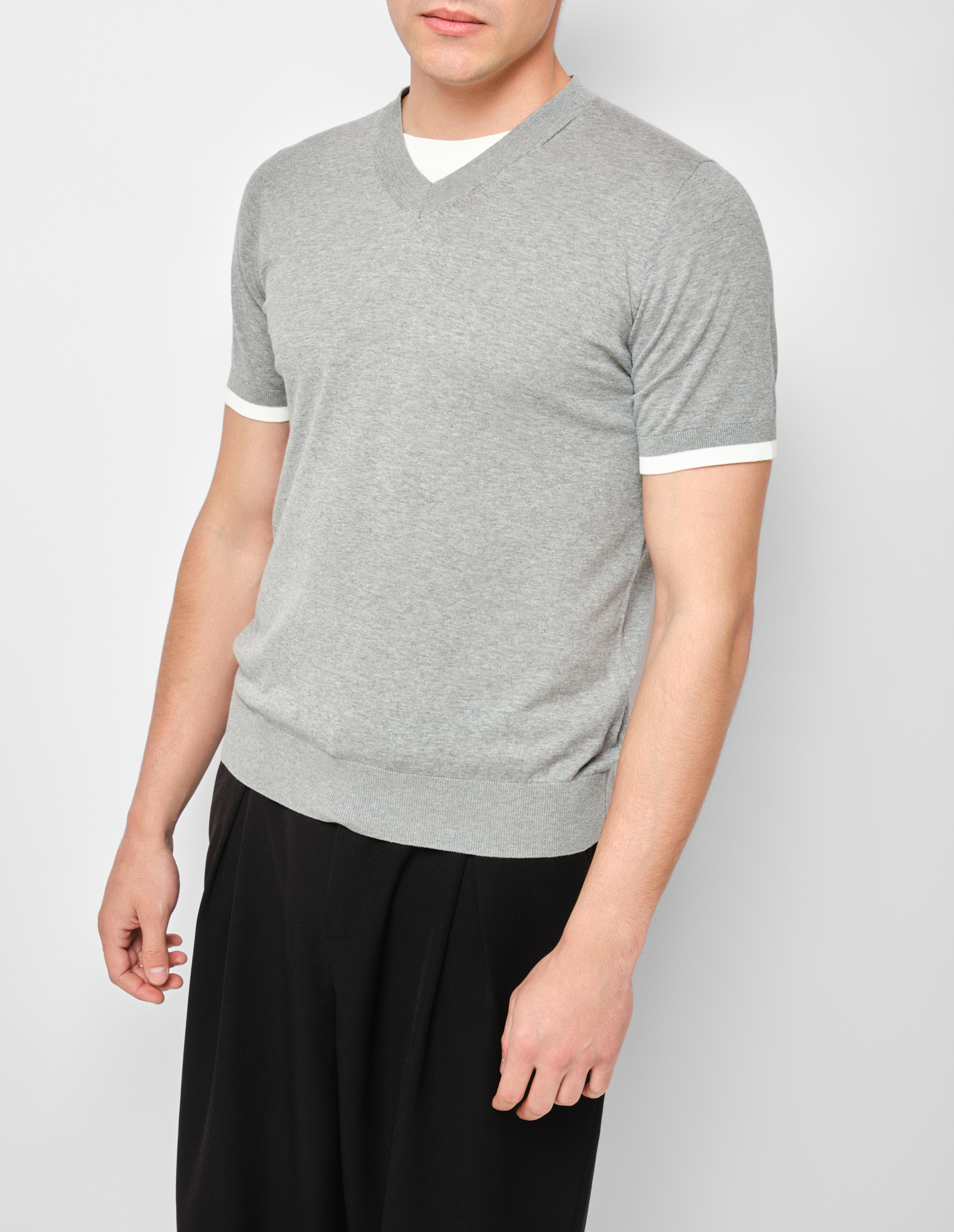 Классический крой и иллюзия многослойности. Светло-серый мужской джемпер выполнен из мягкого смесового хлопка c меланжевым плетением. Белый цвет на манжетах и горловине создает эффект второго слоя, превращая универсальную деталь в часть актуального образа. Эластичная ткань хорошо тянется, обеспечивая безупречную посадку. V-образный вырез вытягивает силуэт, завершая концепцию идеальной внесезонной футболки. Небанально, удобно, роскошно. В изысканном духе Paolo Pecora.
