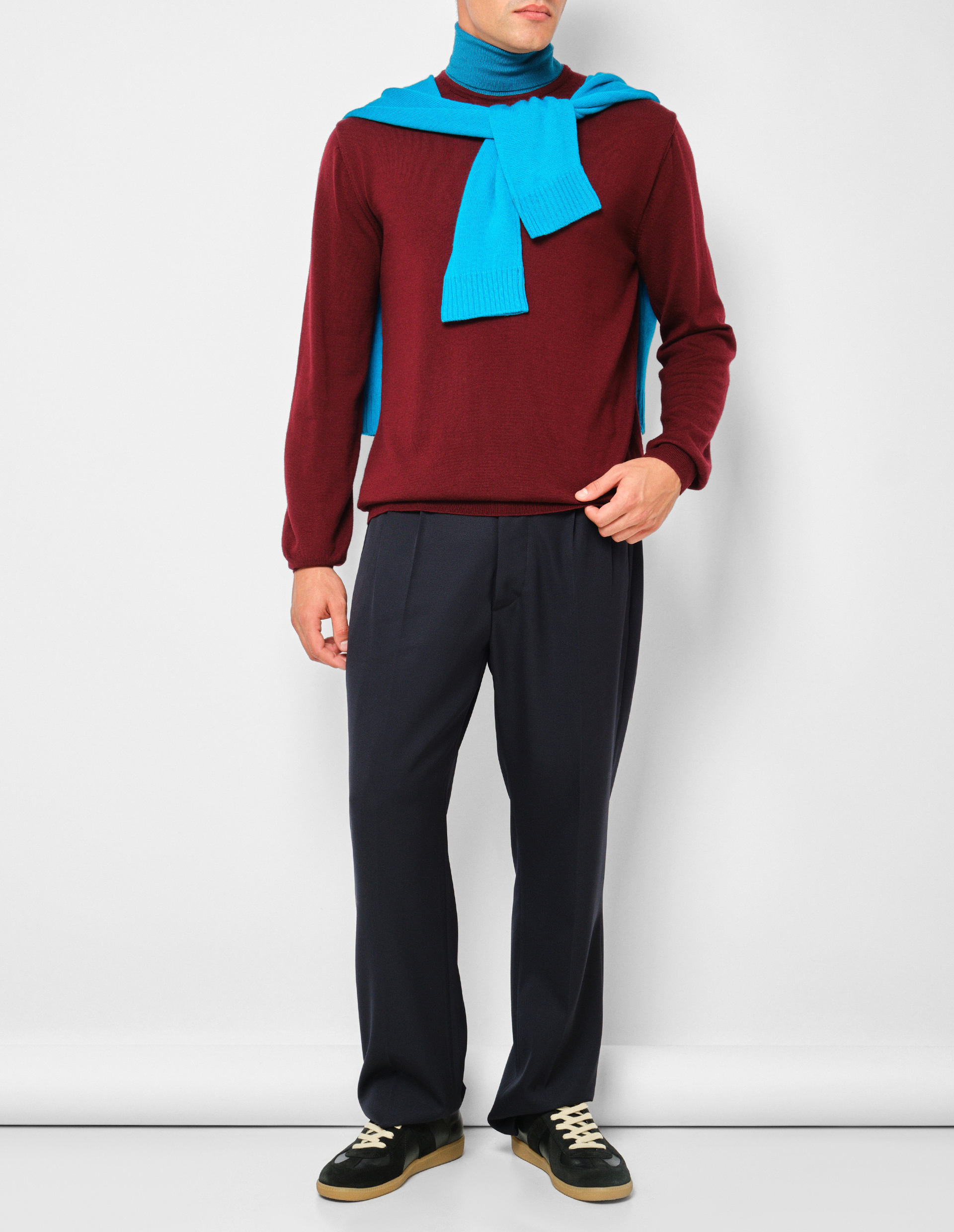 Эксклюзивный комбинированный джемпер из коллекции Dark Waters, в чьи темные воды отправляется BOTTER, как и прежде исследуя вечно актуальную проблему загрязнения океана и саму карибскую моду, из которой берет начало ДНК бренда. Модель, органично сочетающая эстетику корпоративного офиса, возникла благодаря переоценке техник, материалов и стилей. Это привело к интегрированию уютного трикотажа, очищению силуэта и поиску поэзии в таких деталях, как конструкция trompe-l’oeil (от фр. — "обманка"). Она создает иллюзию многослойного образа благодаря сращиванию деталей классического джемпера коричневого цвета с высоким голубым воротом водолазки. Именно сочетание контрастов воспевает палитру, энергию и дух Caribbean Couture, являясь данью уважения разным культурам и связи между землей и водой.