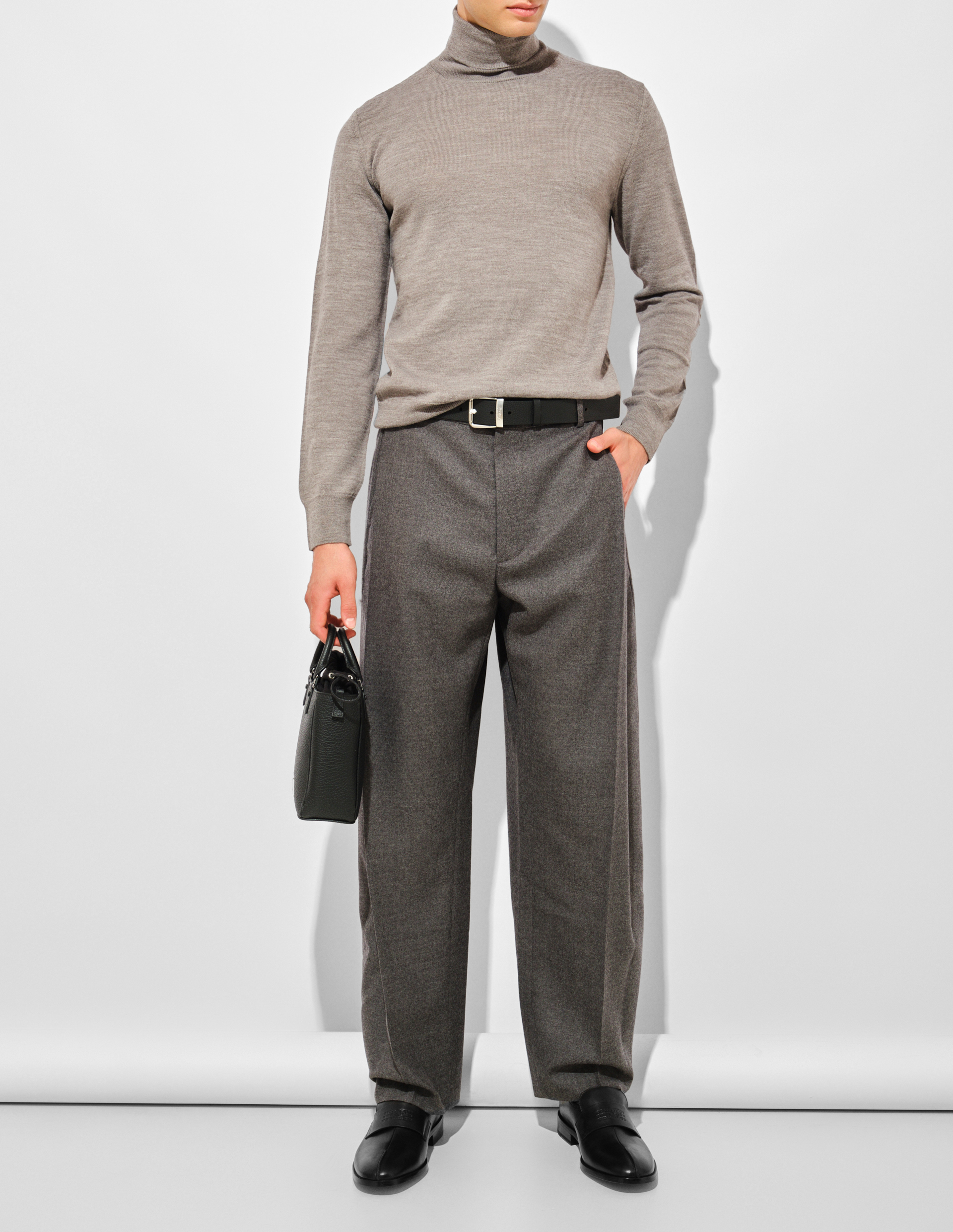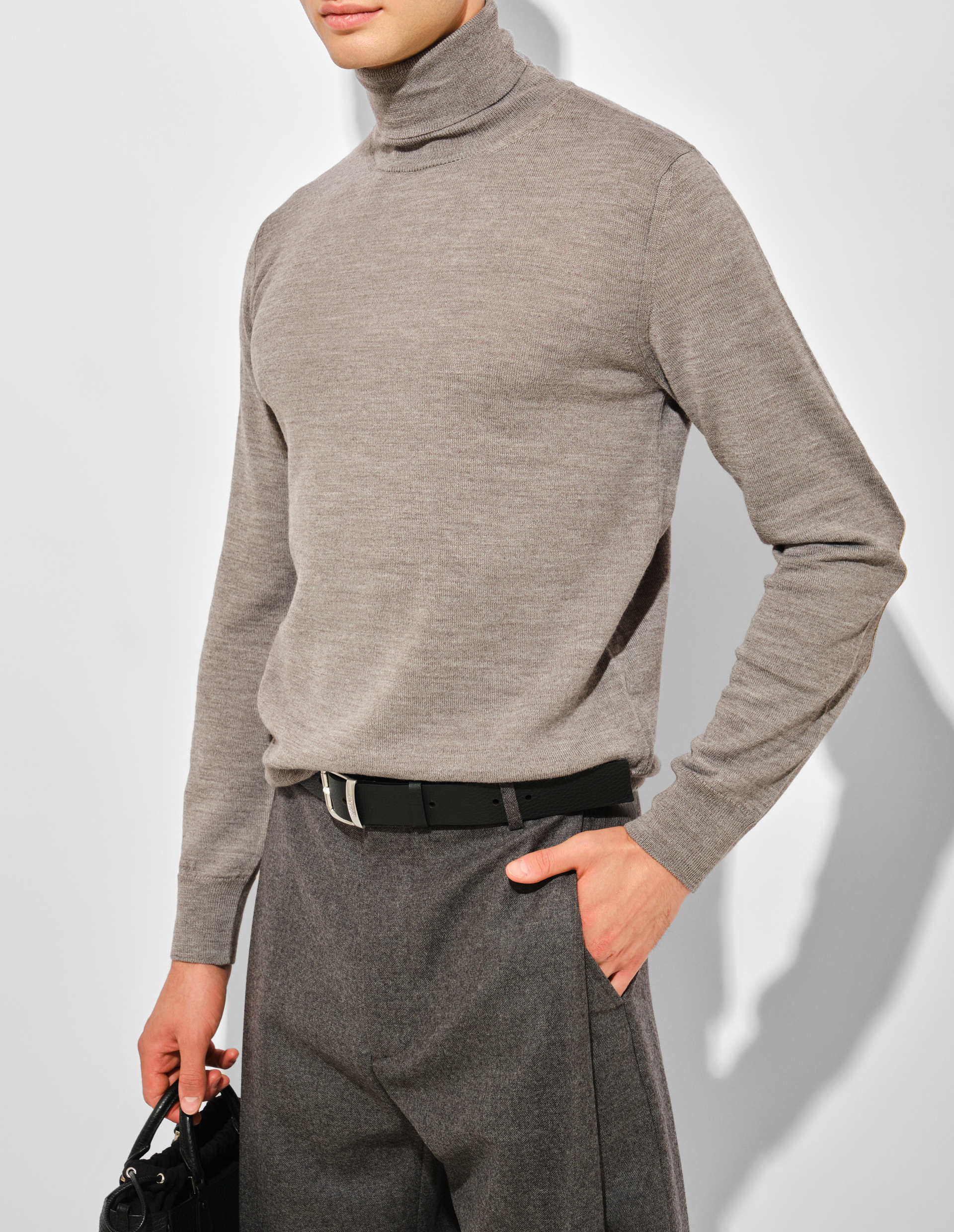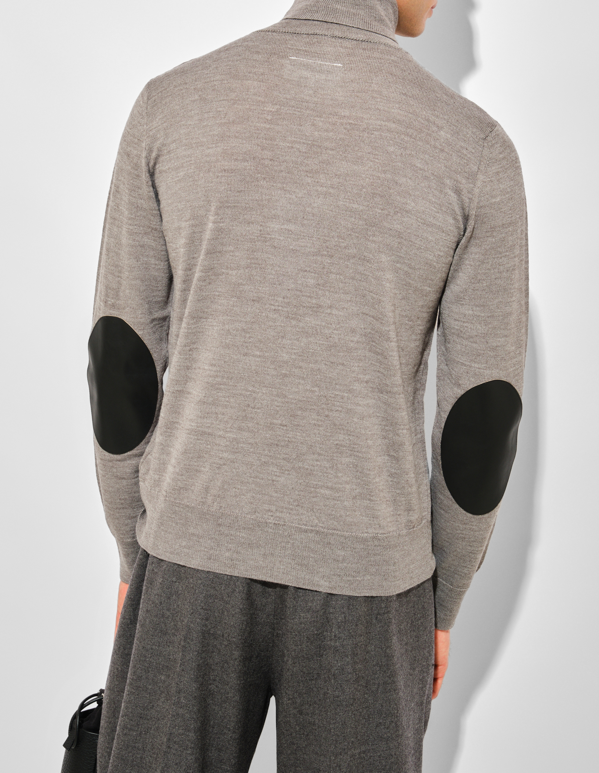Этот гольф из облегченной смесовой шерсти с плоскими кожаными заплатками на локтях отсылает к архивным работам Мартина Маржелы, где утилитарные детали становятся элементом деконструкции. Исключительная мягкость и долговечность тонкого трикотажа контрастируют со строгой геометрией укрепляющих элементов, подчеркивая принцип функционального преобразования силуэта. Ребристая резинка манжет и подола создает четкий каркас, а фирменная белая строчка на спине завершает переосмысление классической модели через призму интеллектуальной эстетики MM6.