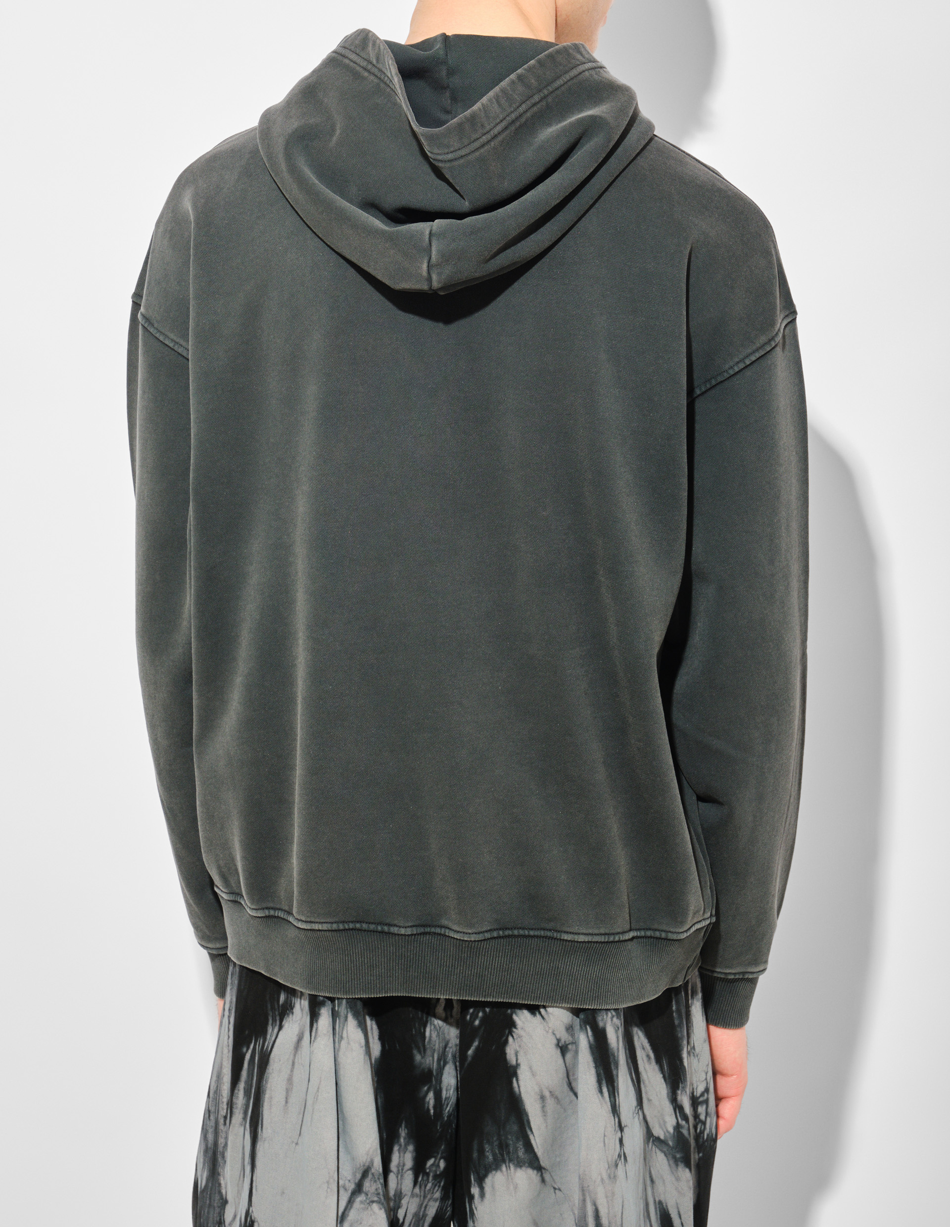 Худи S-BOXT свободного кроя из 100% регенеративного хлопка демонстрирует экологичный подход Diesel и фирменную винтажную эстетику. Модель с эффектом искусственного состаривания украшена деконструированным логотипом Oval D, выполненным флок-печатью — технологией нанесения ворсистого рисунка, создающей тактильно ощутимую бархатистую поверхность. Практичные детали включают капюшон с регулировкой, вместительный карман-кенгуру и двойные резинки на манжетах. Интенсивная обработка ткани придает материалу характерную потертость, а флокированное изображение с размытыми контурами усиливает эффект намеренной небрежности.