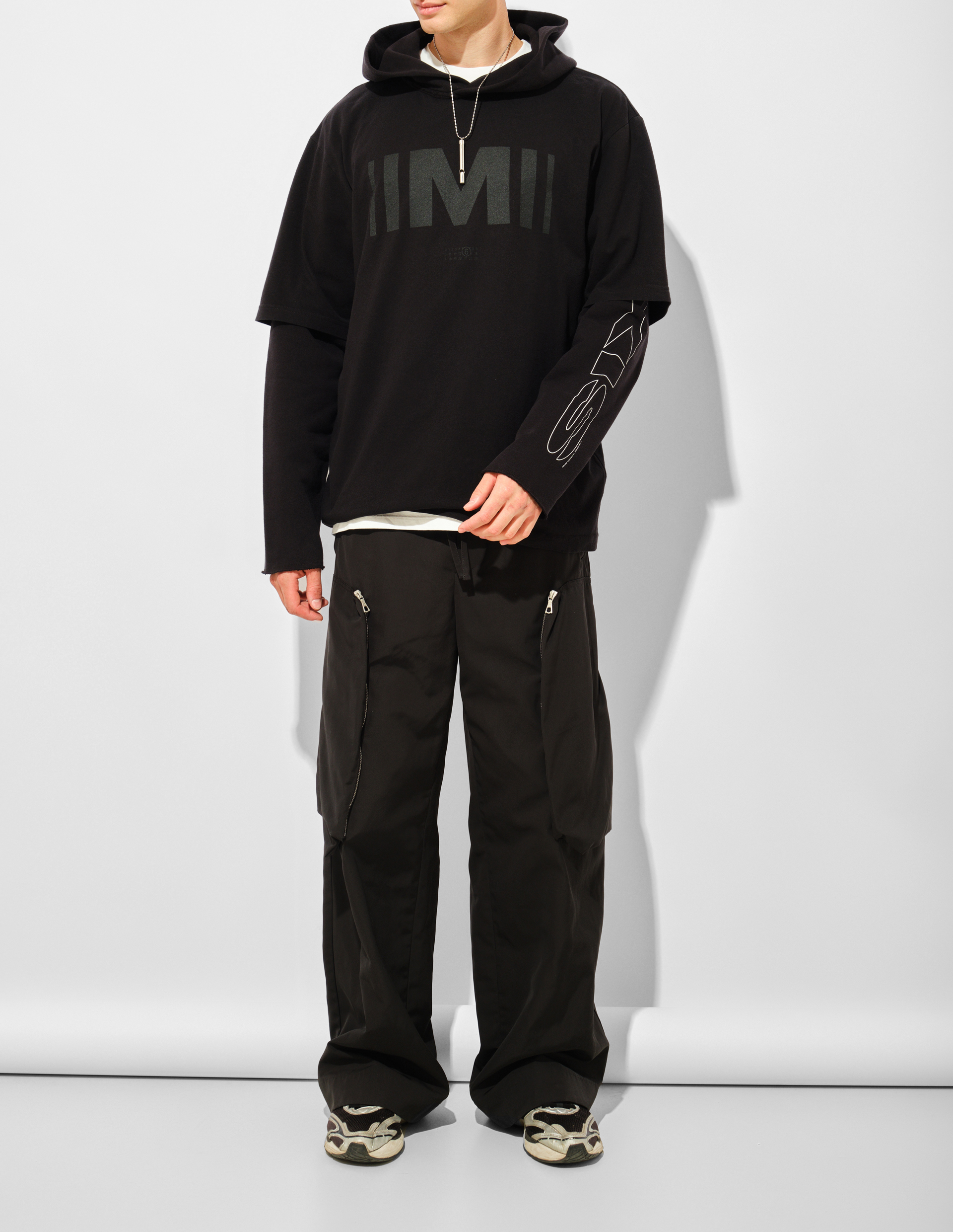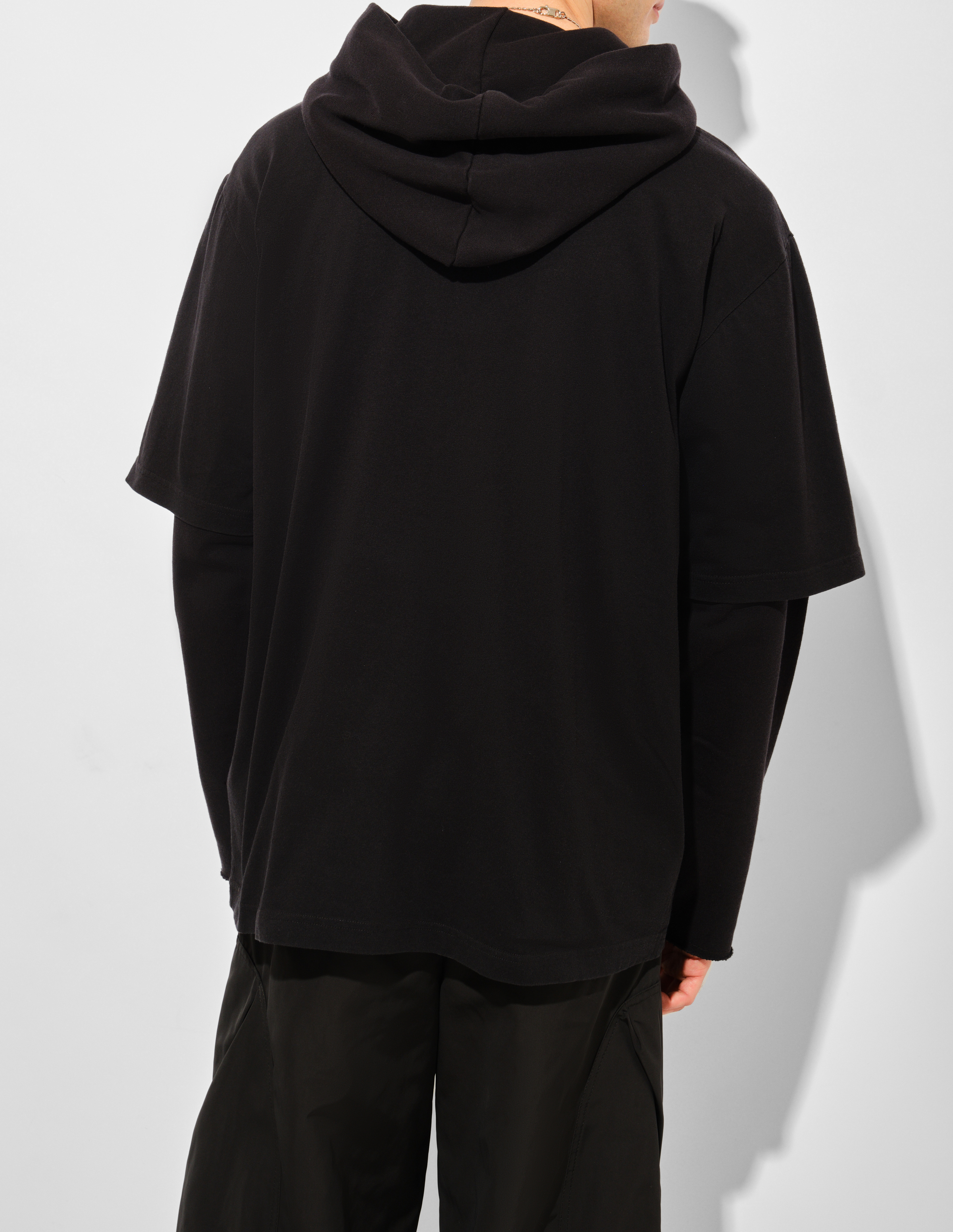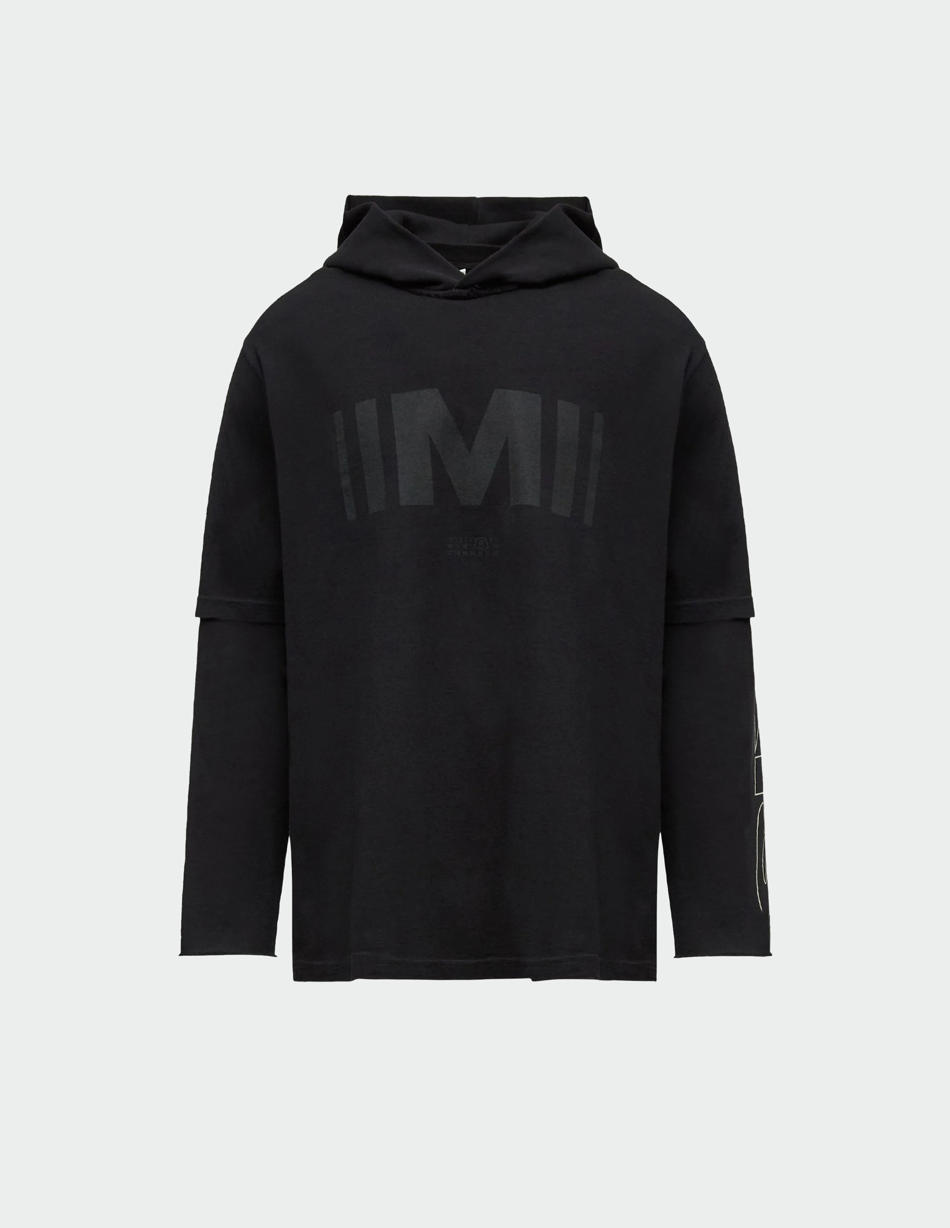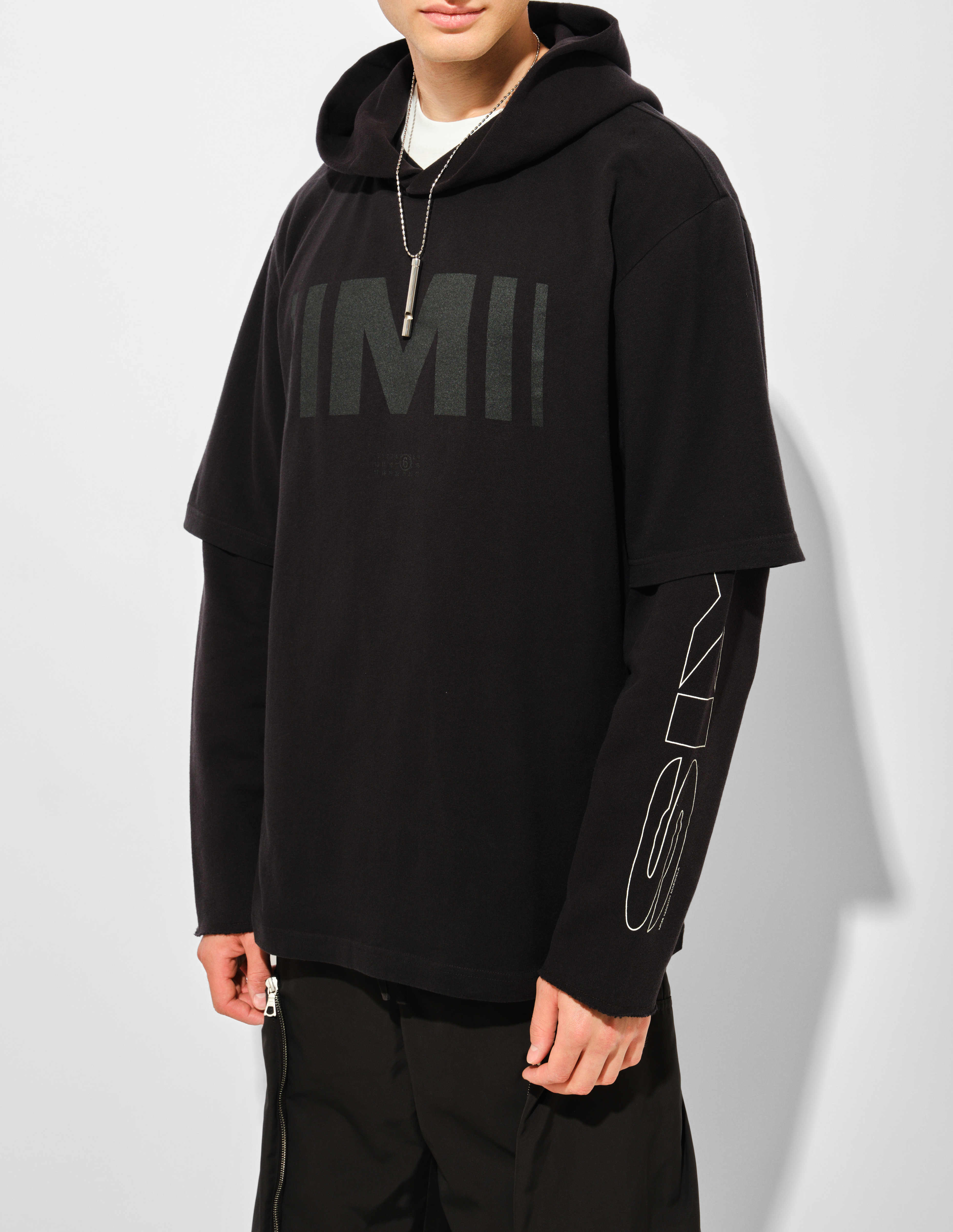 Черный свитшот из хлопкового трикотажа с эффектом многослойности воспроизводит оптическую иллюзию лонгслива под худи. На передней части размещена монограмма «M», а на рукаве — графическая подпись «SIX», создавая систему визуальных маркеров бренда. Фирменная белая строчка сзади завершает деконструктивный жест, преобразуя утилитарный силуэт в заявление о концептуальной сложности повседневной одежды.