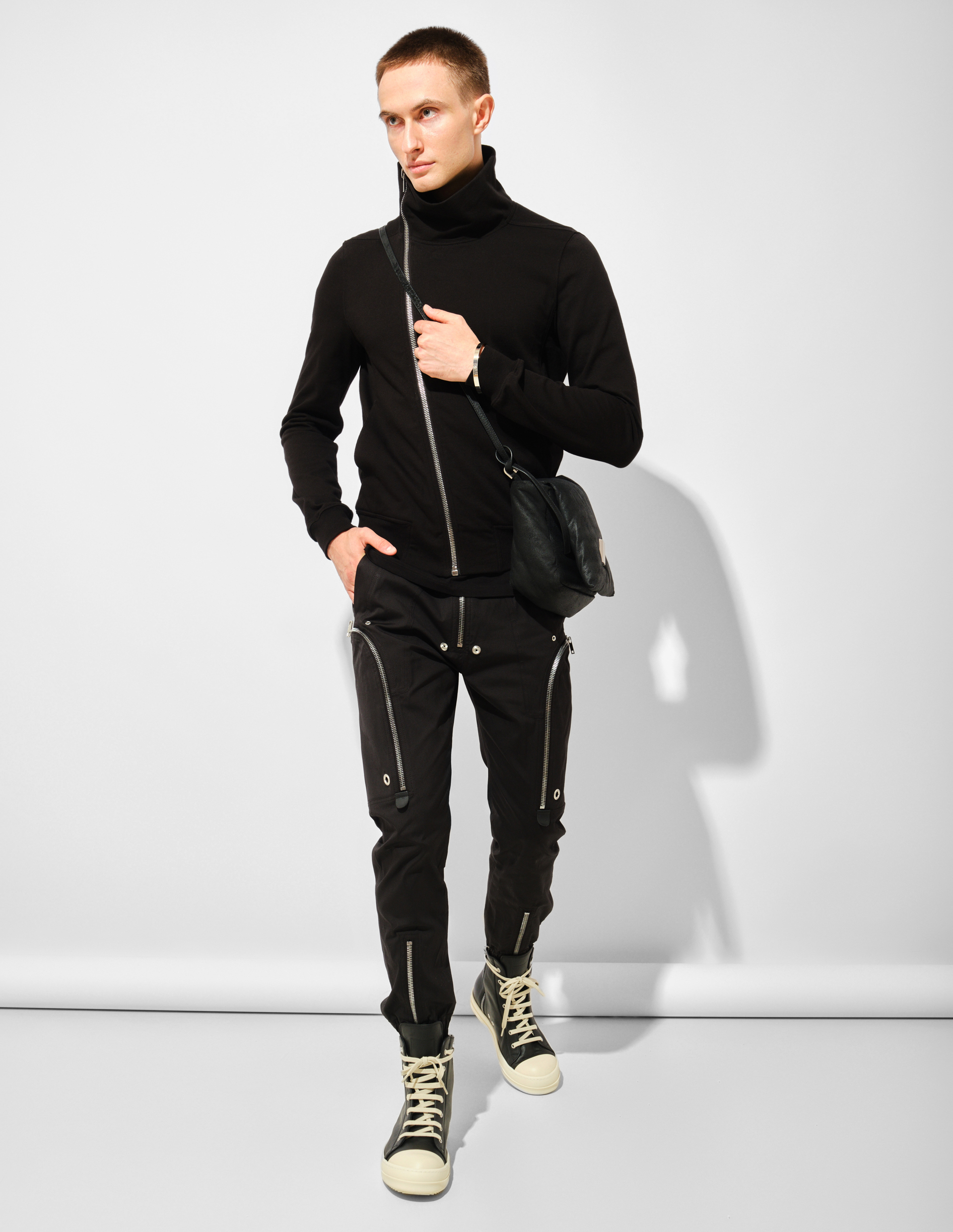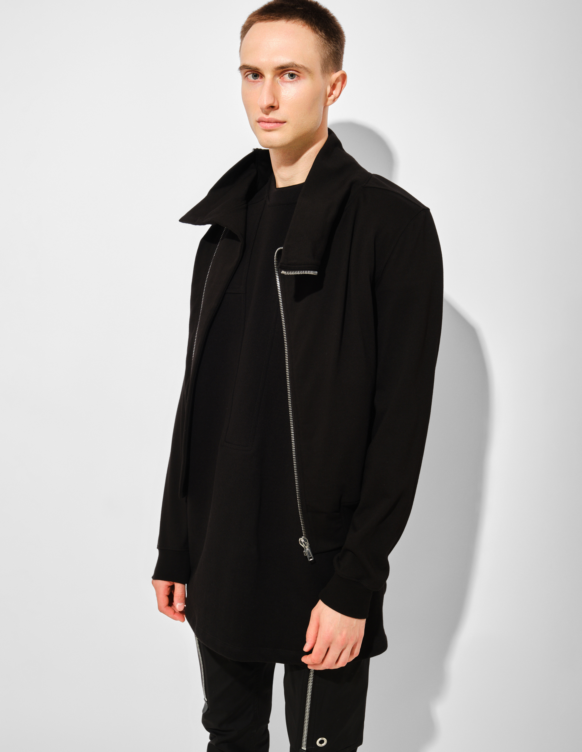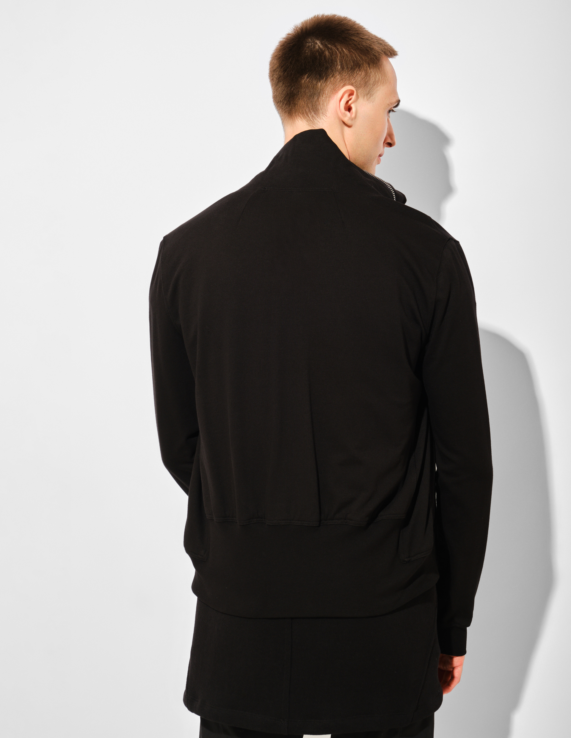 Джемпер Bauhaus Jogger из плотного джерси черного цвета переосмысливает каноны утилитарной одежды через асимметричные решения. Смещенная застежка-молния, проходящая от низа к правой стороне горловины, позволяет трансформировать силуэт: в застегнутом состоянии она формирует высокий воротник-воронку, а в расстегнутом создает эффектную драпирующуюся линию. Боковые карманы, интегрированные в швы, сохраняют чистоту линий. Принципы коллекции FW25 Concordians находят отражение в использовании органического хлопка с сертификатом GOTS, что подчеркивает ответственность бренда за экологичность производства и качество материалов. Плотная структура ткани гарантирует сохранение формы и тактильный комфорт.