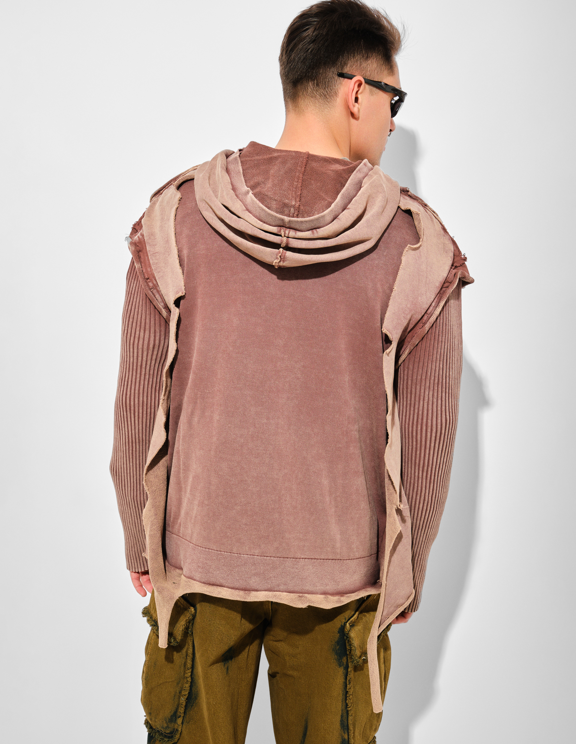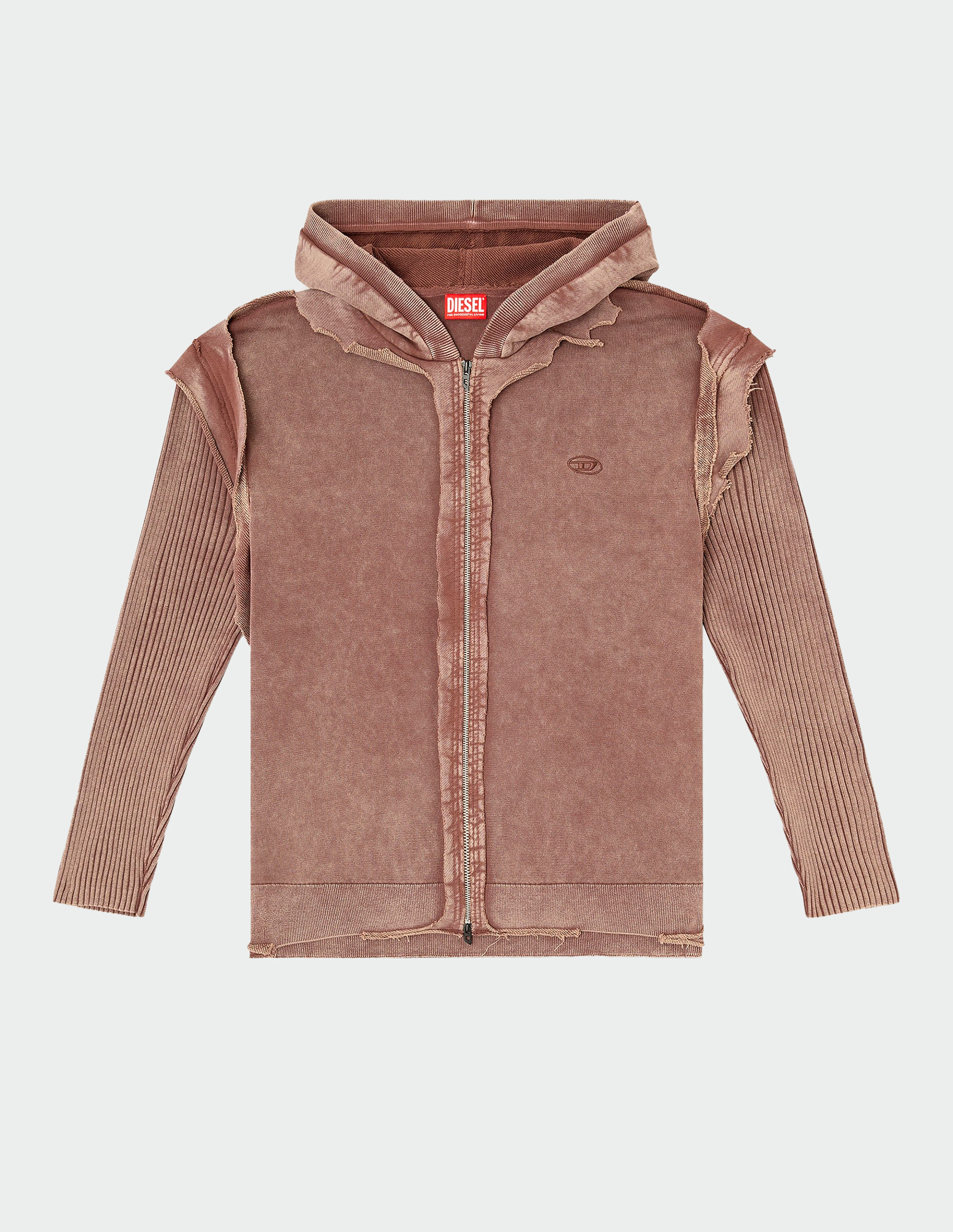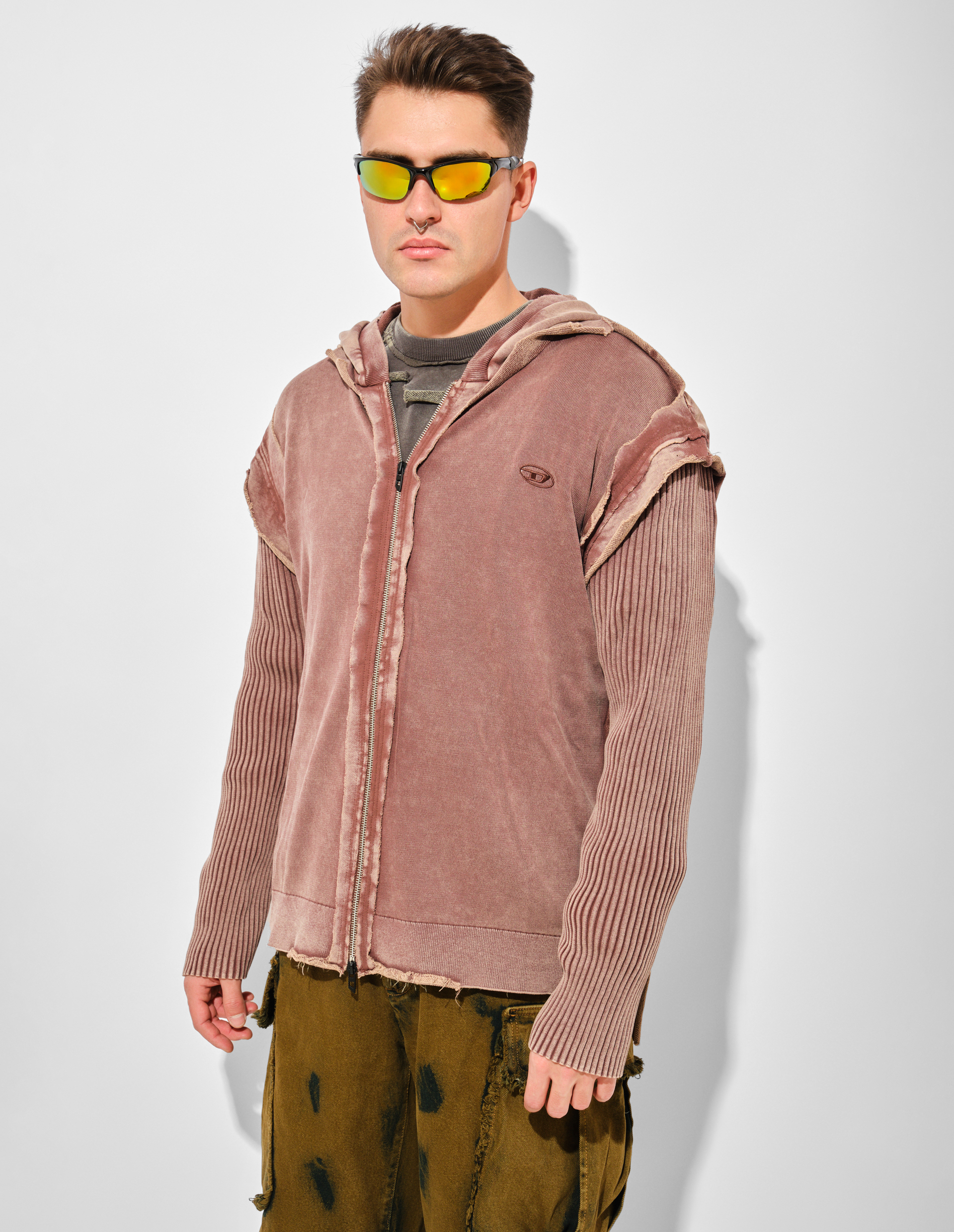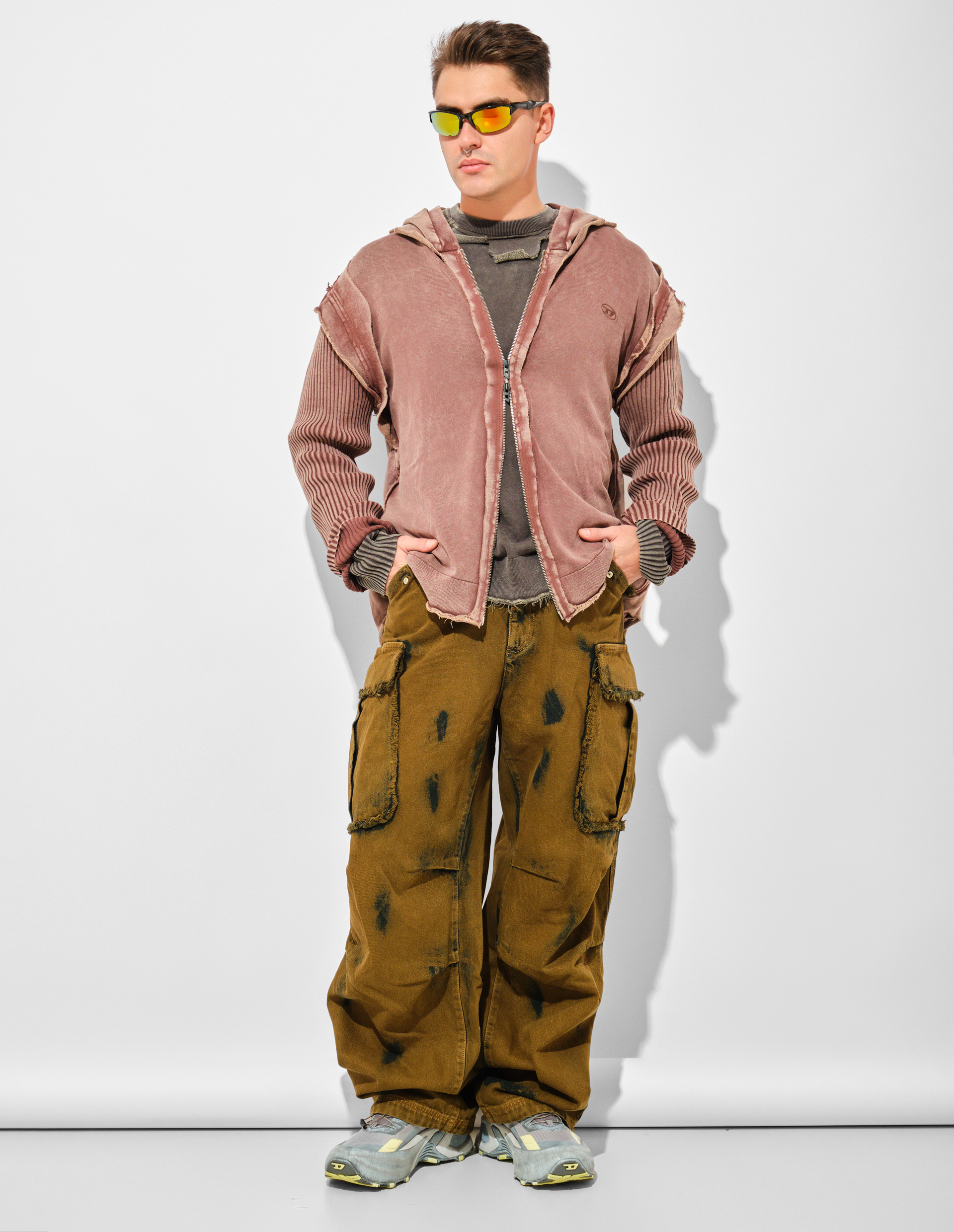 Это худи с разрушенной фактурой становится воплощением бунтарского духа Diesel. Модель с эффектом отслоения ткани демонстрирует намеренное уничтожение формы: наружный слой прорезан и удален, оставляя лишь фрагменты материала. Ребристые манжеты и двухслойный трикотажный корпус контрастируют с деструктивным дизайном, а коричневый оттенок, полученный после покраски готового изделия, подчеркивает винтажный характер.