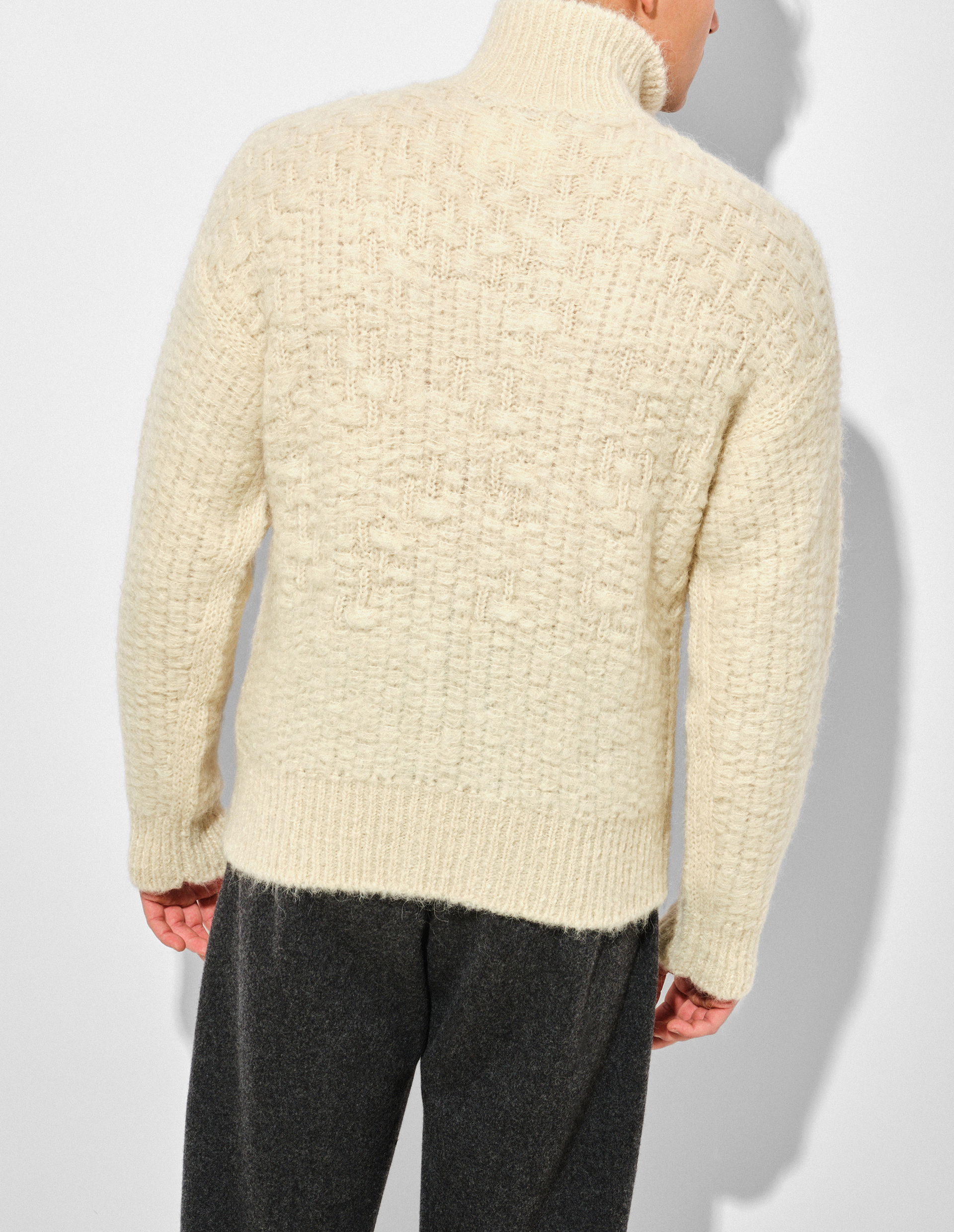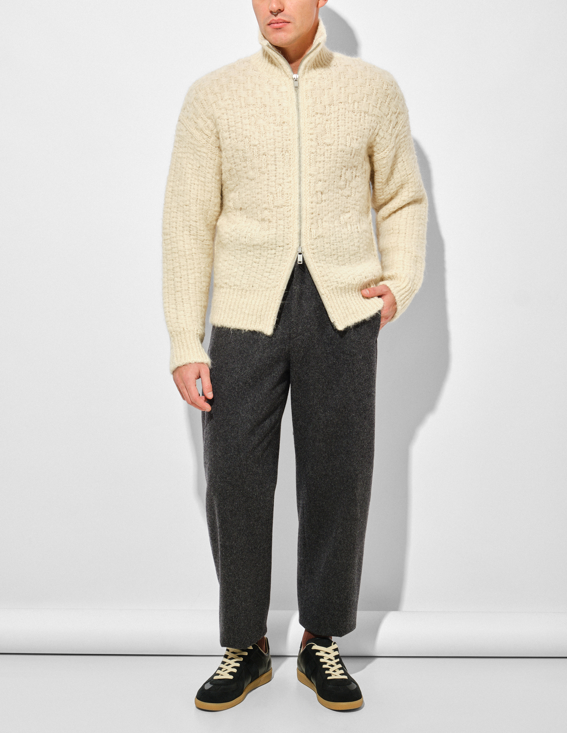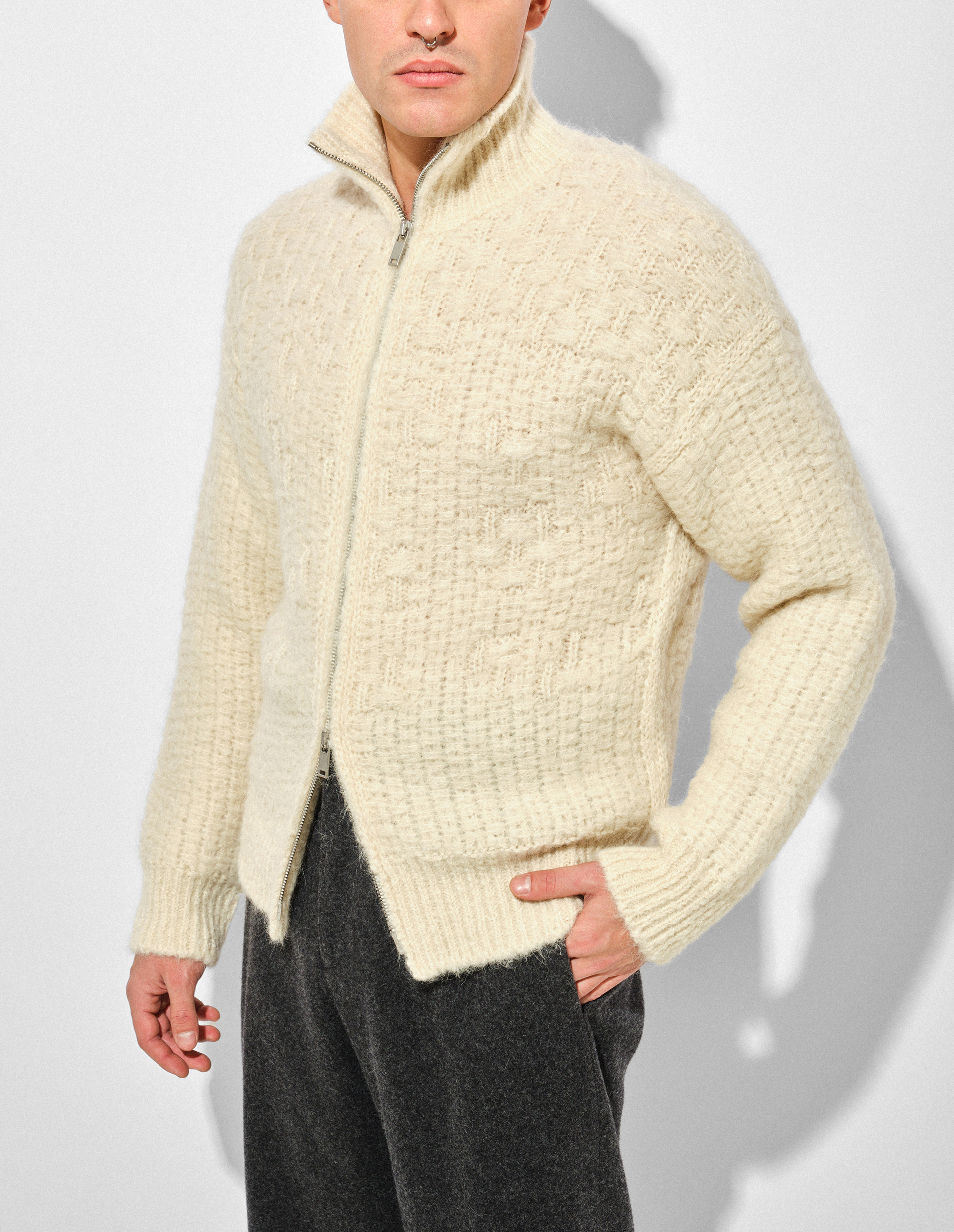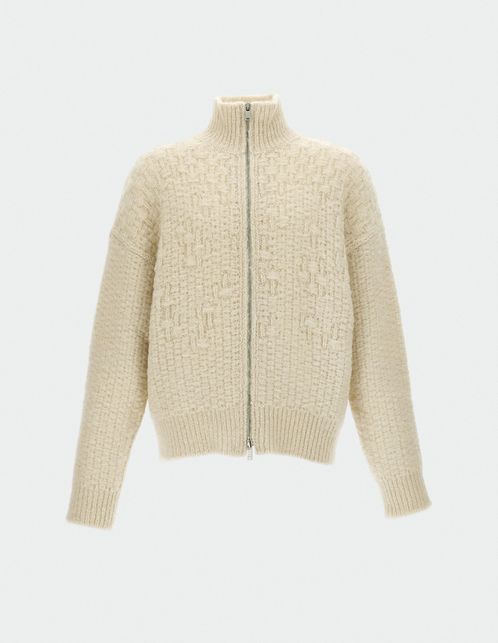 Роскошный и изысканный кардиган с необычным плетением BASKET WEAVE. При его создании мастера Jil Sander остановили свой выбор на пряже из мохера и альпаки, которая «прочнее шерсти, тоньше кашемира, глаже шелка, мягче хлопка и теплее гусиного пуха". Стежки намеренно расположены несколько нерегулярно и имеют разный размер. Хоть они выполнены на машине, идея состоит в том, чтобы вызвать ощущение ручной работы, сформировать трехмерный эффект, современный и динамичный вид. Джемпер характеризуется прямым силуэтом с высоким воротом и центральной встречной молнией, а его завершающим аккордом выступает природный оттенок CHALK.