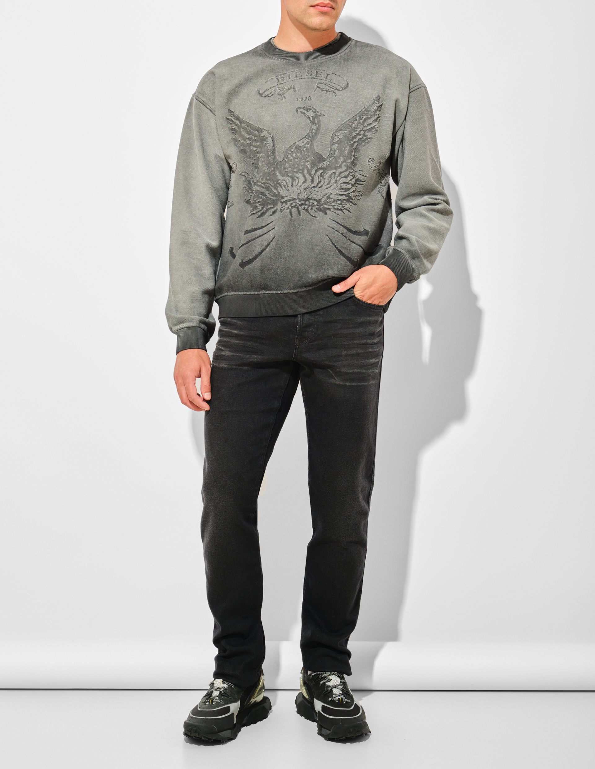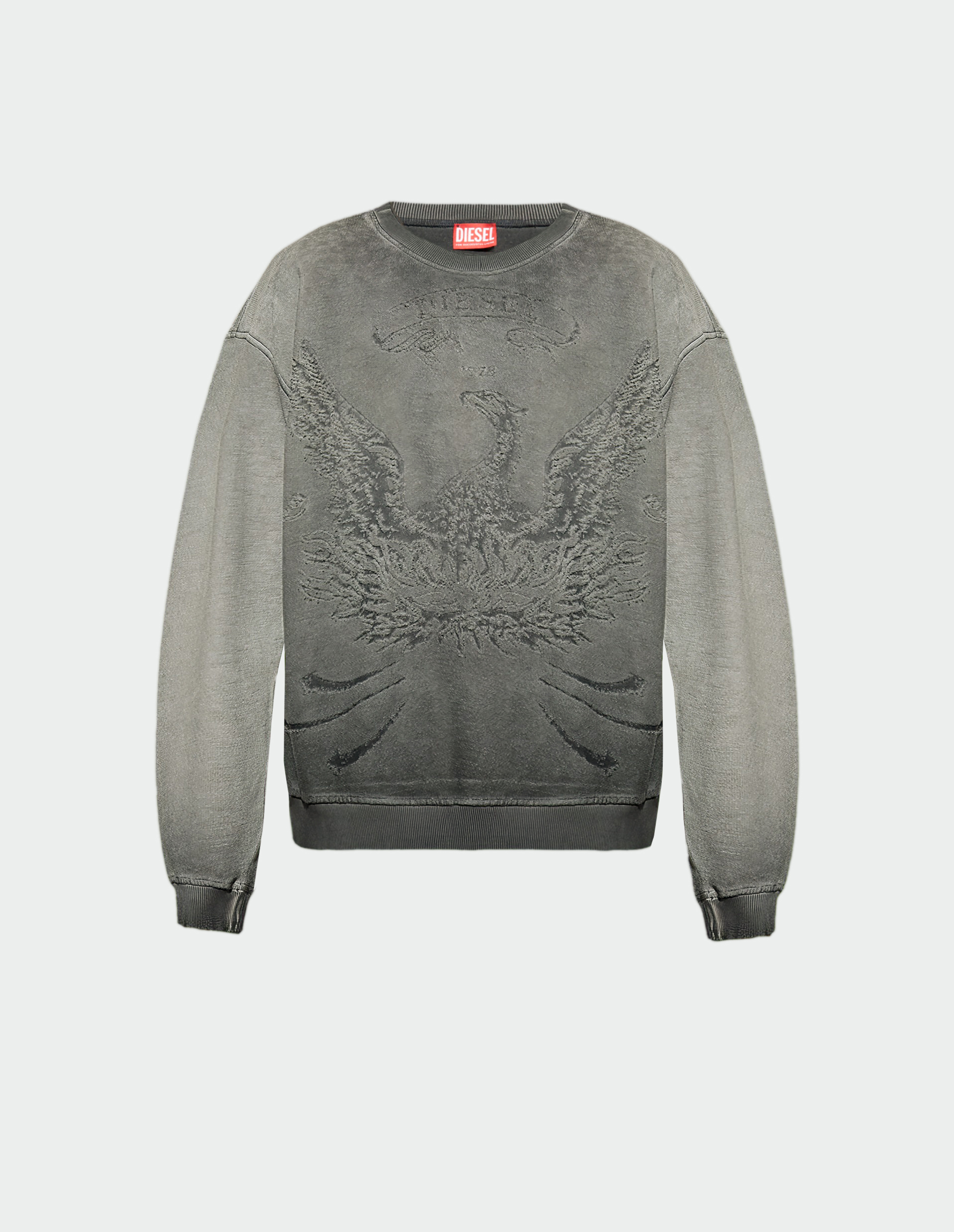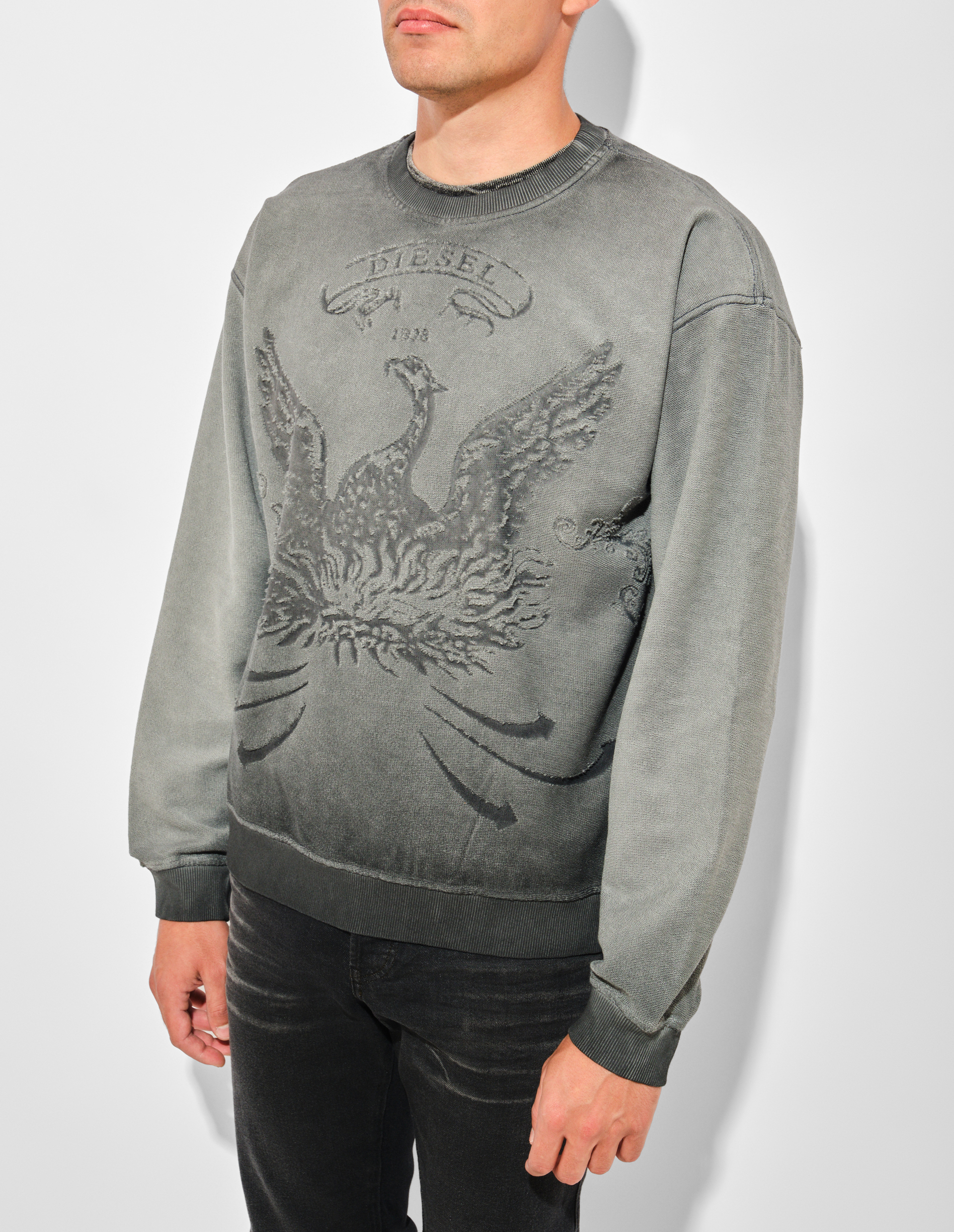 Diesel переосмысливает классический свитшот через призму инновационных технологий и экосознательного подхода. Эта модель из джерси прошла экспериментальную обработку: ткань вывернута, демонстрируя петельчатую изнанку, что создает эффект изысканной объемности. На груди расположен культовый узор Phoenix, выполненный в революционной техникой деворе: лазерная гравировка выжигает на поверхности части волокон, создавая прозрачные и непрозрачные участки. Свободный крой толстовки отражает фирменный дух бренда, а сочетание органического хлопка с переработанными материалами подчеркивает этичные методы производства.