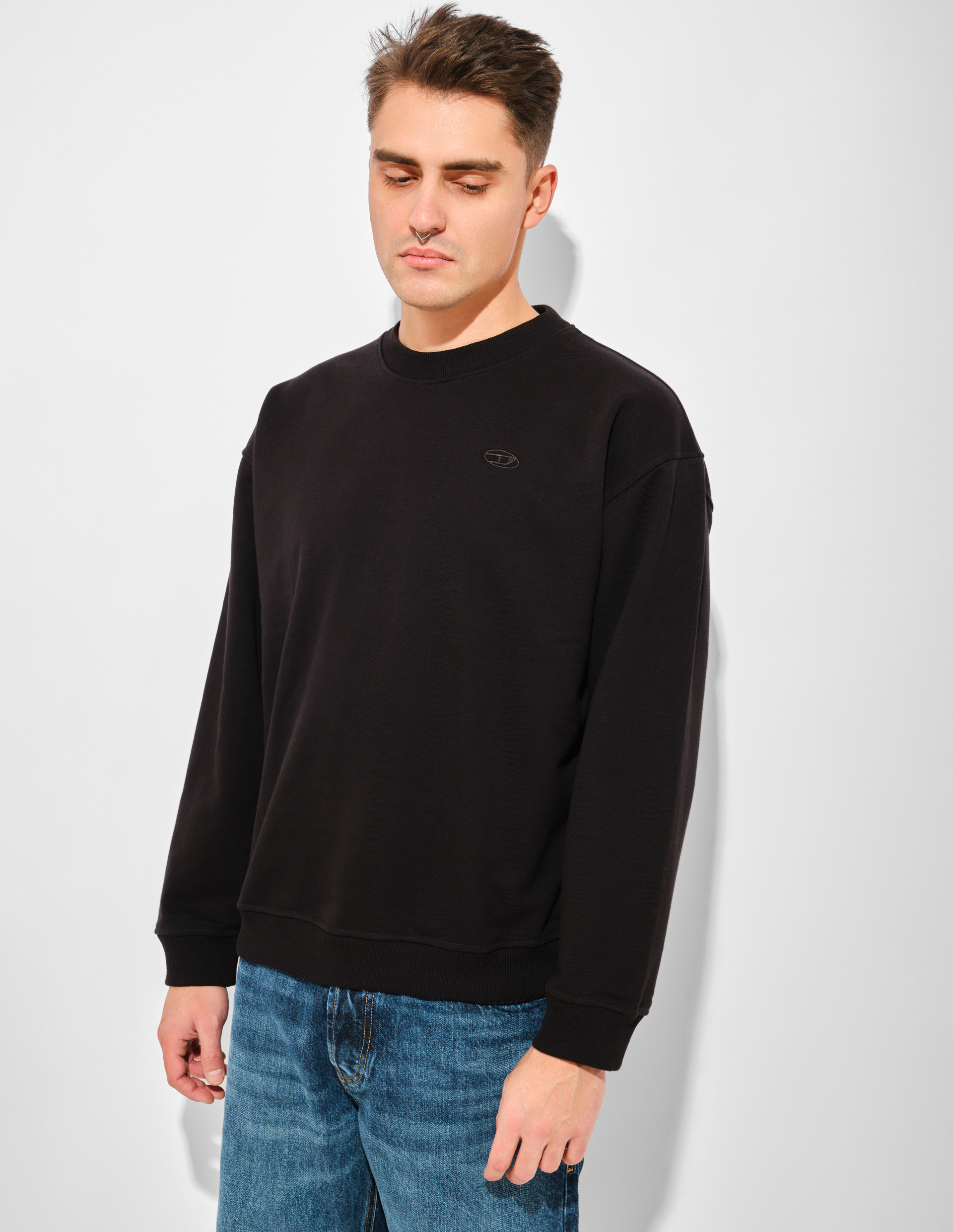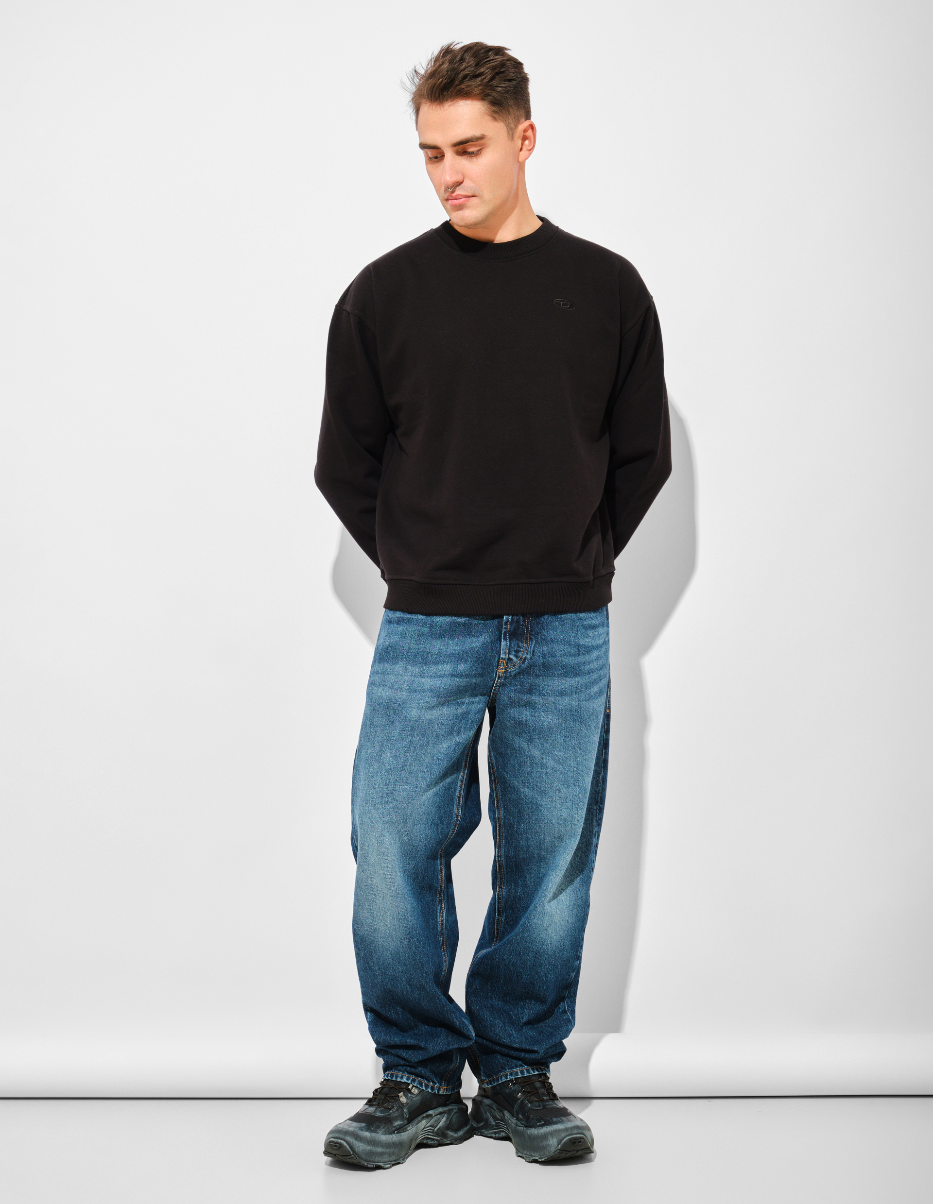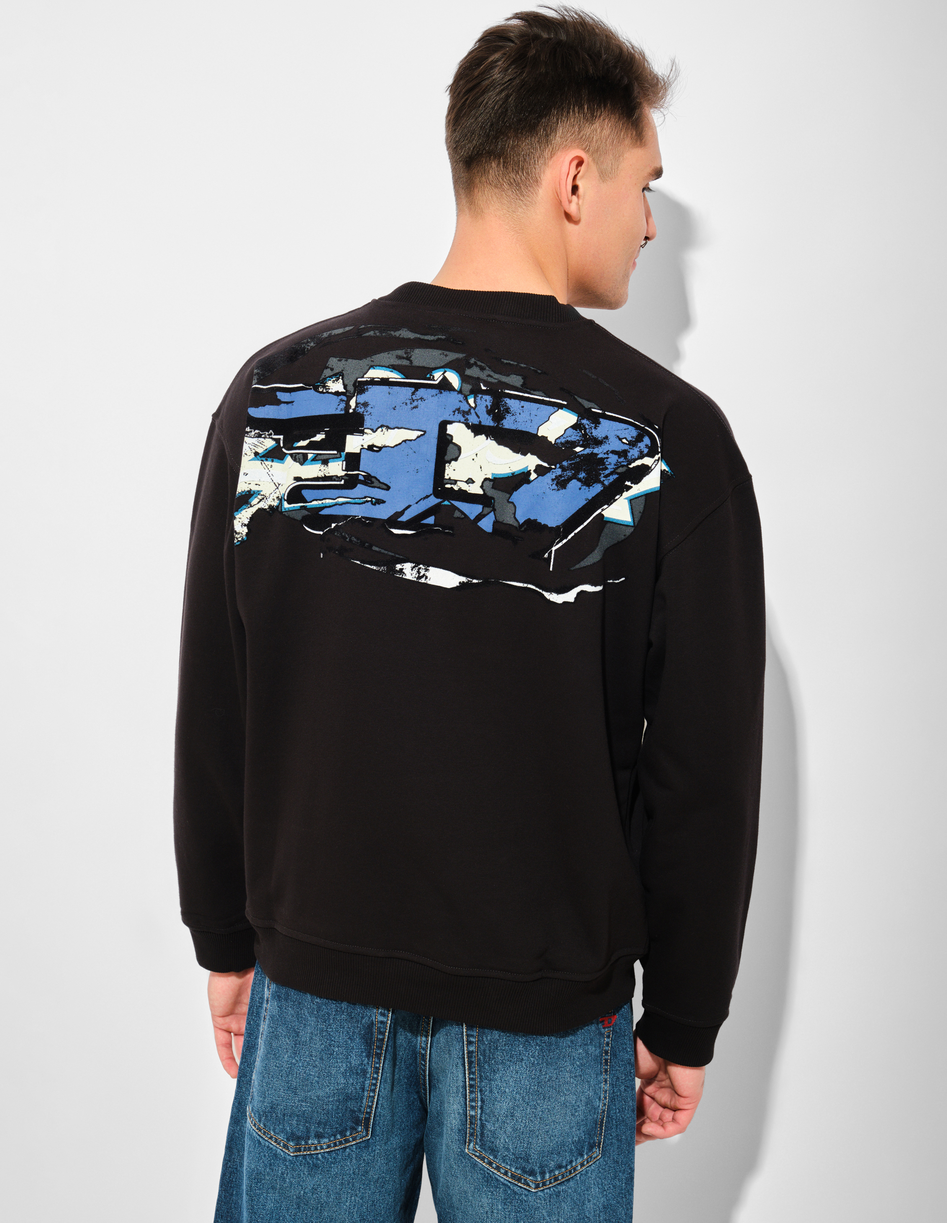 Свитшот свободного кроя из трикотажа с петельчатой изнанкой демонстрирует принципы устойчивого развития Diesel. Состав из сертифицированного органического хлопка и переработанного полиэстера подчеркивает ответственность бренда перед окружающей средой. На спине расположена бунтарская интерпретация овального логотипа D, искусственно состаренная до эффекта многолетней носки — символ вневременного стиля, не подчиняющегося сиюминутным трендам. Сочетание технологичных материалов и намеренно несовершенной графики отражает философию Diesel: подлинная индивидуальность не боится следов времени, а экологичность становится новой формой протеста.