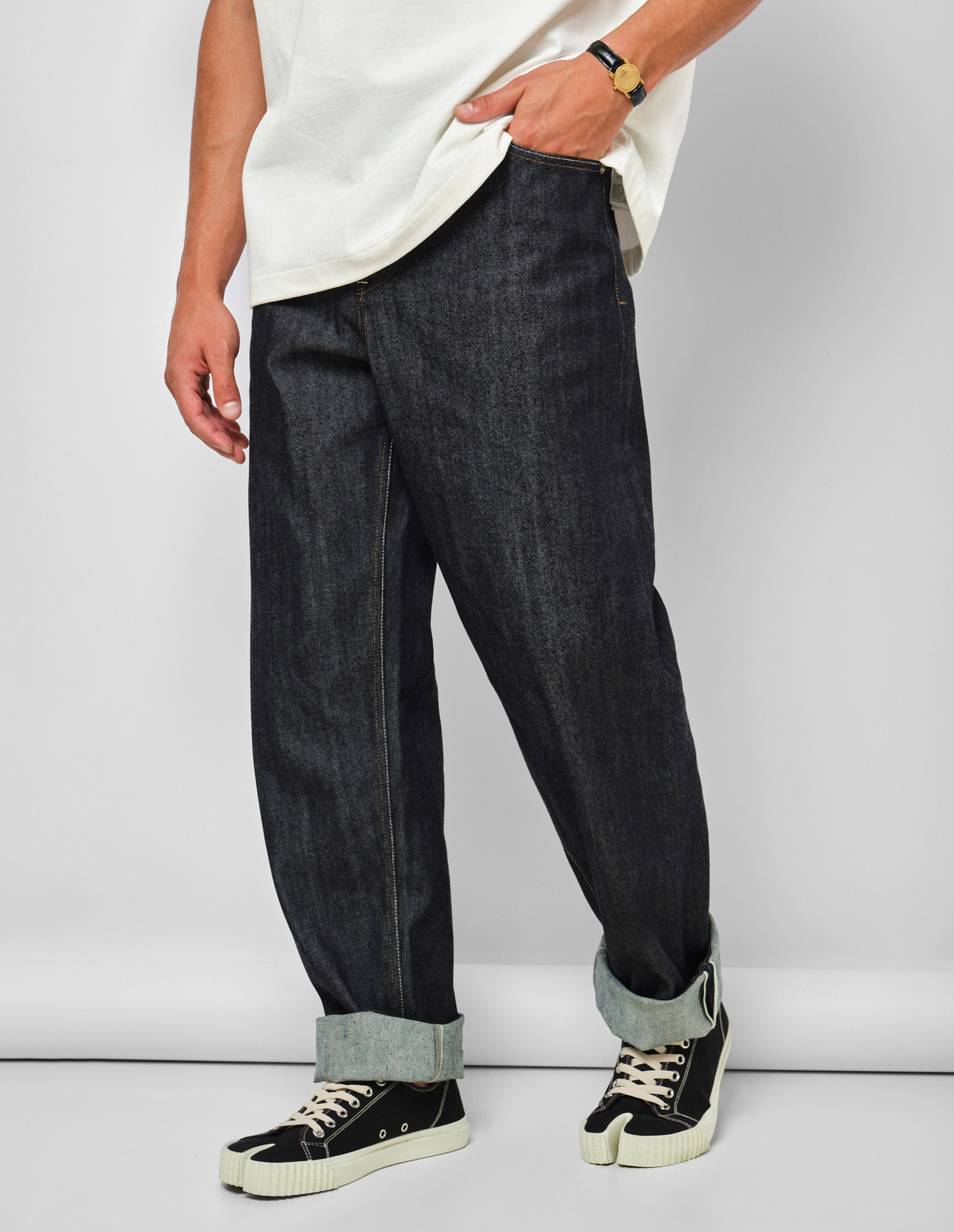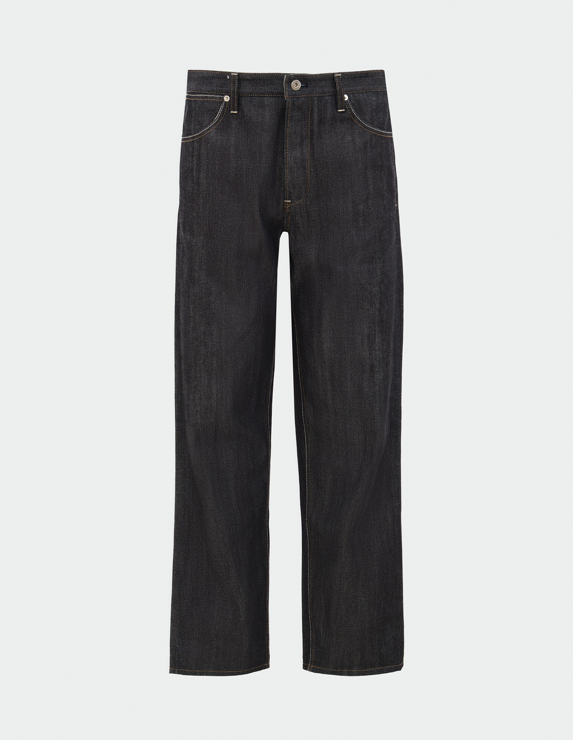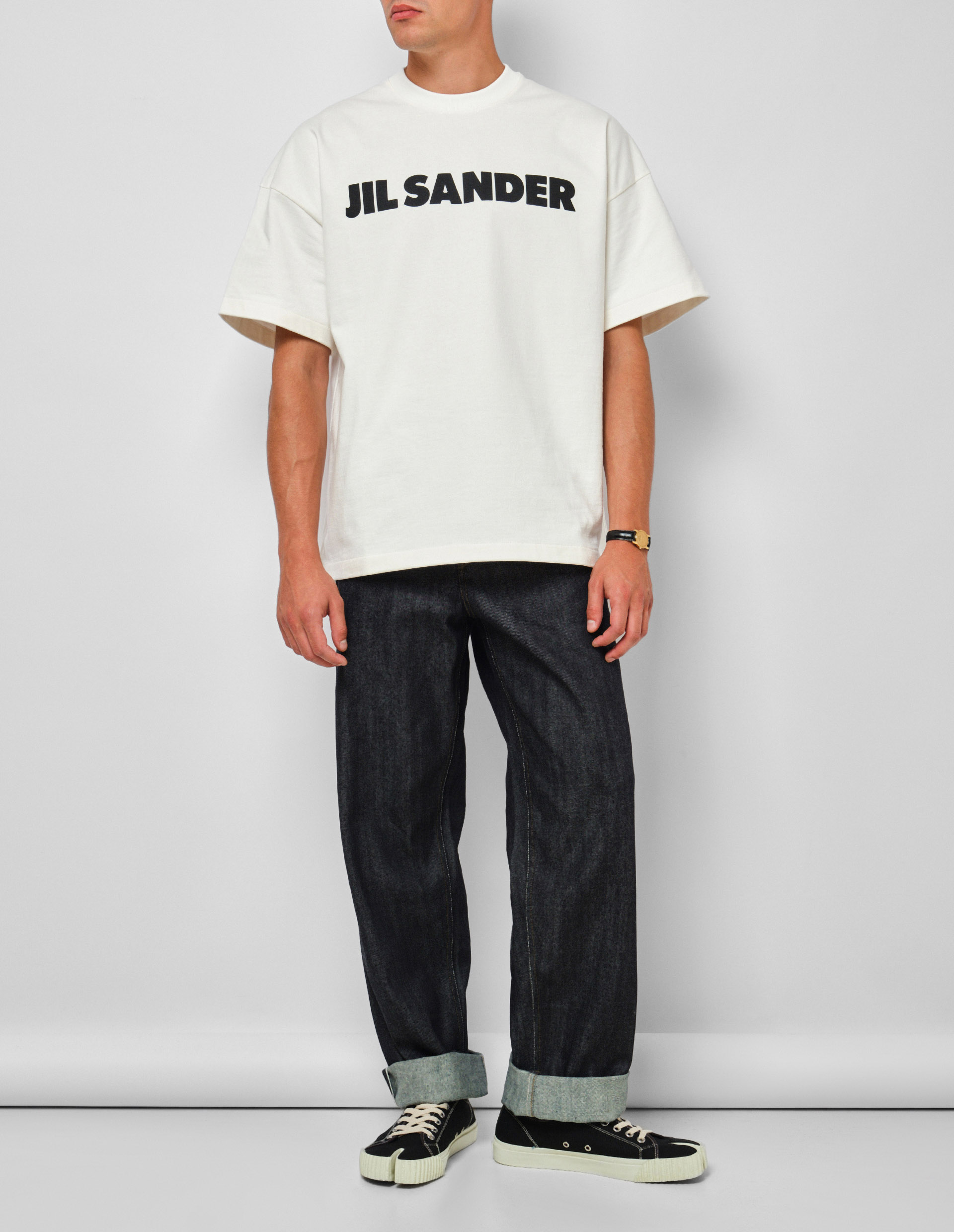 Jil Sander славится простотой и минималистичностью дизайна, а также высококачественными тканями, что демонстрируют собой джинсы от бренда. Темно-синие джинсы сделали предельно лаконичными благодаря зауженному крою и отсутствию ярких деталей, поэтому они поддержат любой повседневный комплект. Для изготовления модели использовали хлопковую ткань средней плотности, а украшением служит двухцветная верхняя строчка подчеркивающая швы.