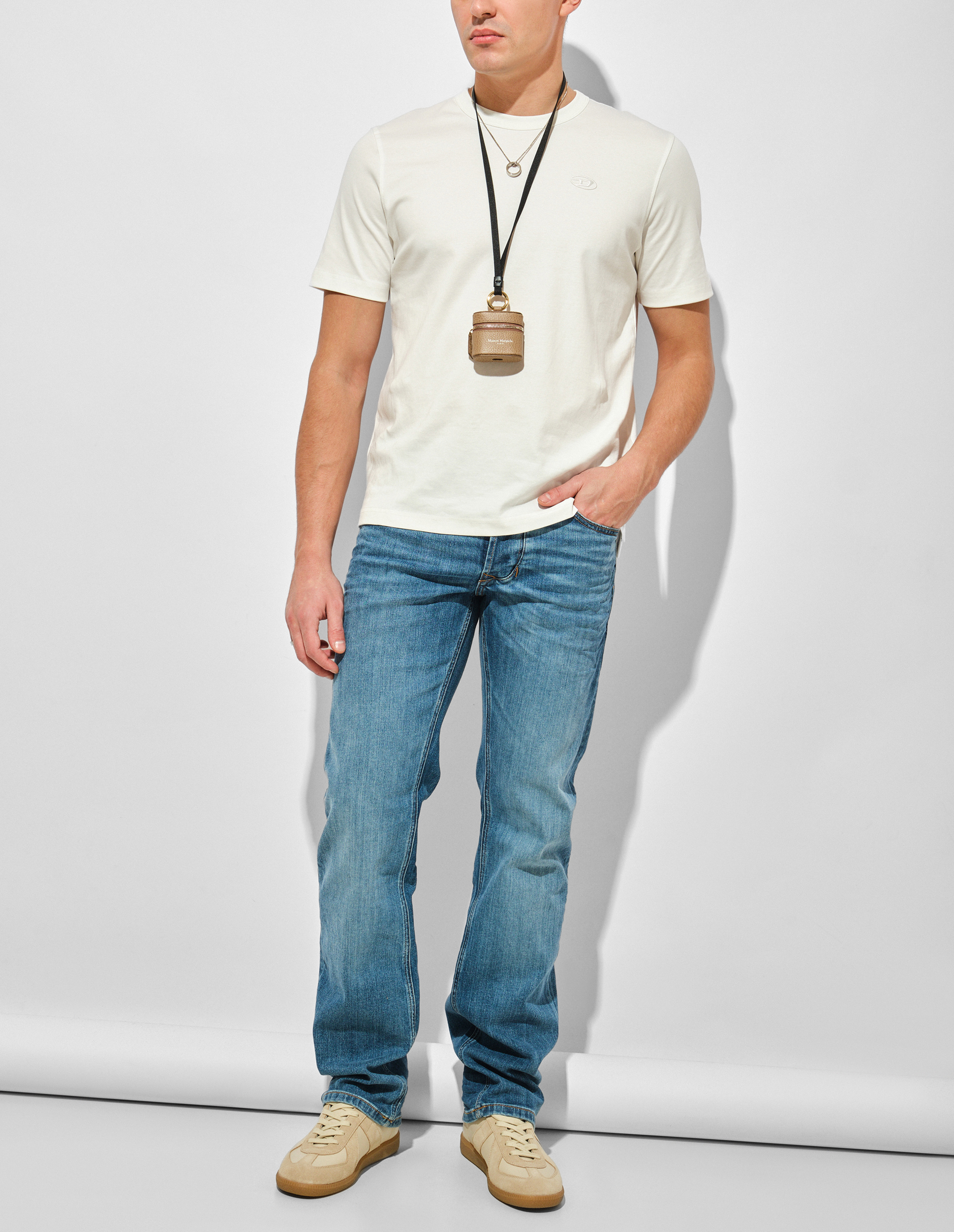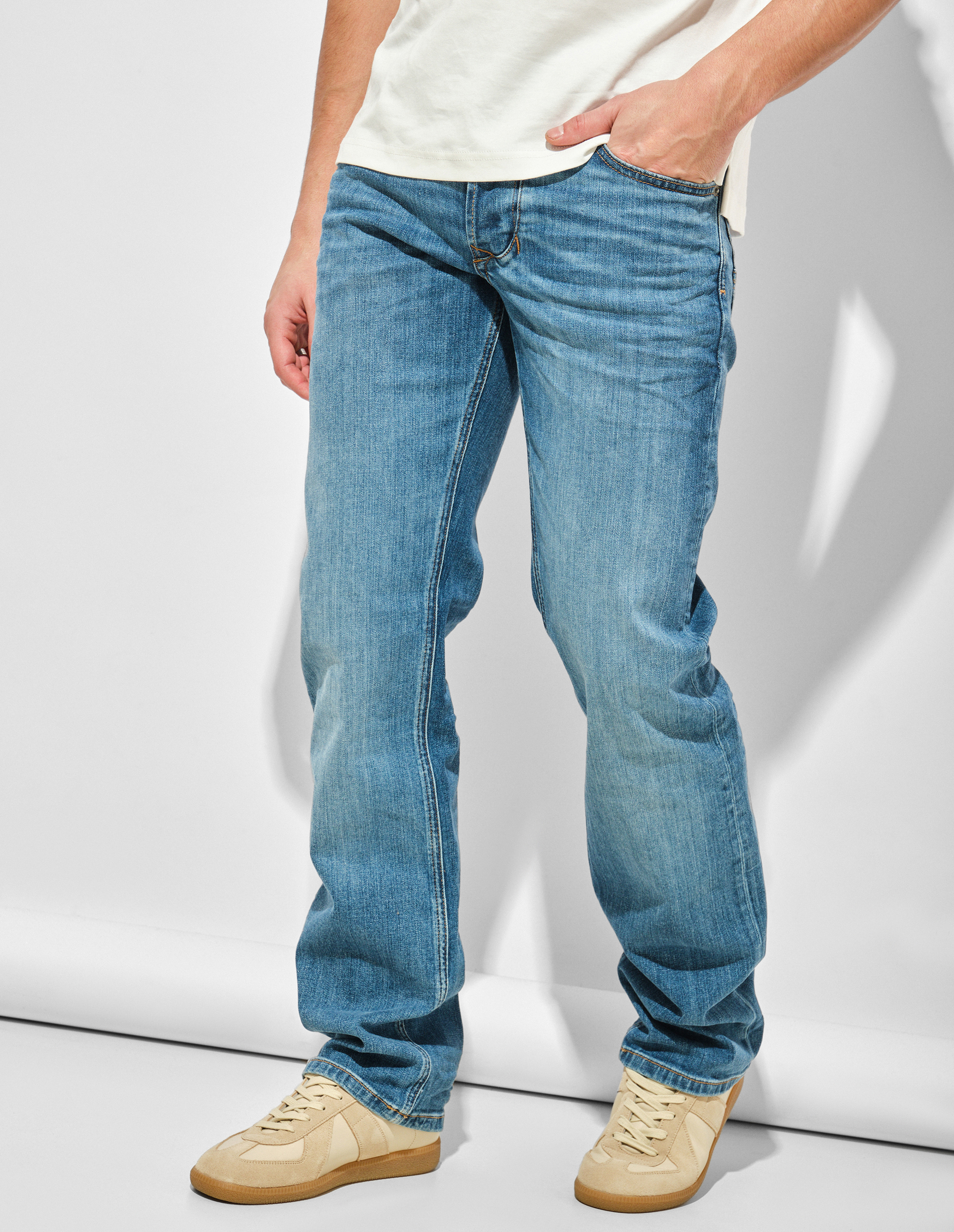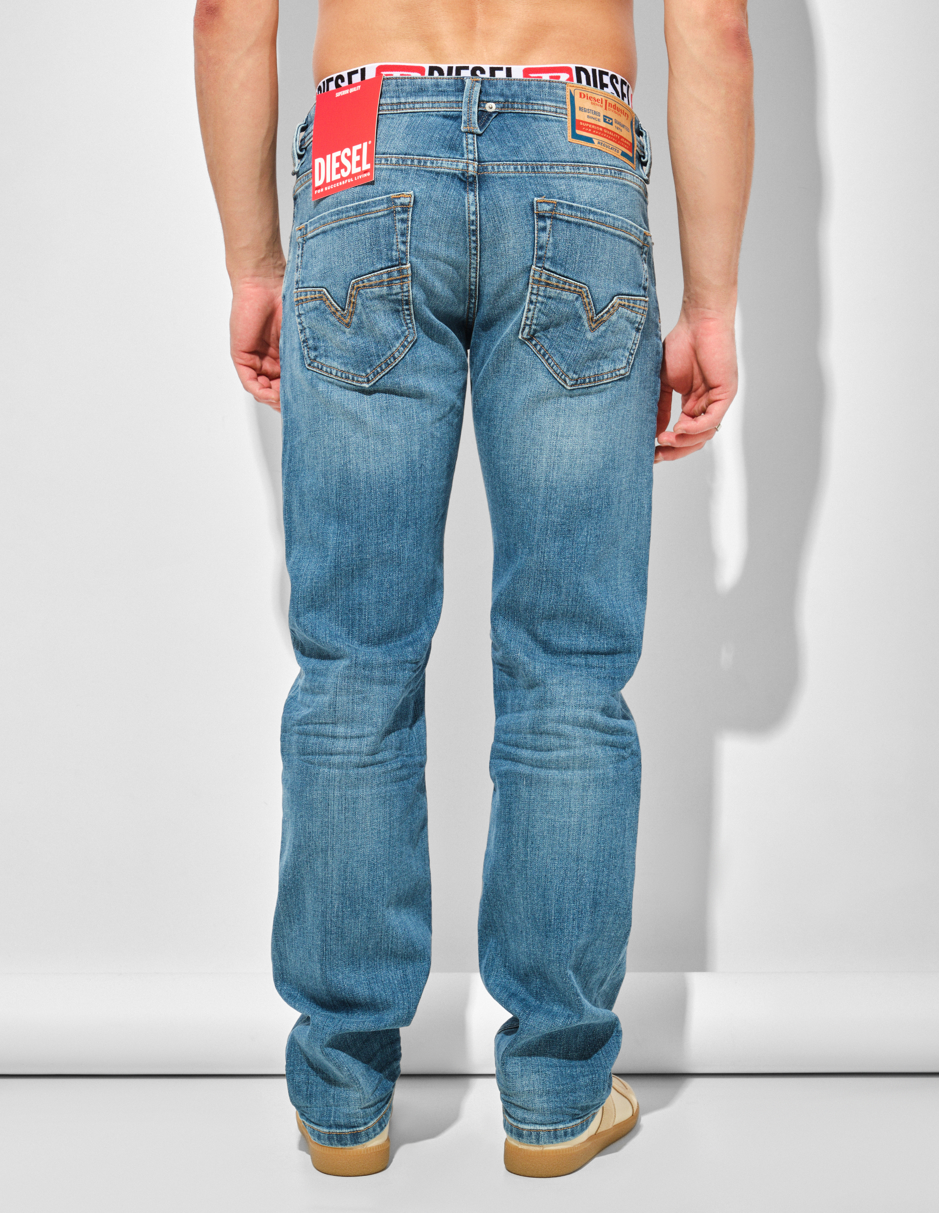 Эта модель светло-синего цвета, является частью ДНК Diesel, включающей серию традиционных оттенков, отражающих наследие и стиль итальянского бренда. Джинсы выполнены из комфортного денима на основе премиального эластичного хлопка, который является дышащим материалом и благодаря умеренной растяжимости обеспечивает комфортную среднюю посадку. Прямой силуэт, слегка свободный в бедрах, не сковывает движения и становится базой при формировании образа. Завершают практичную конструкцию пять карманов и фирменный жакрон.