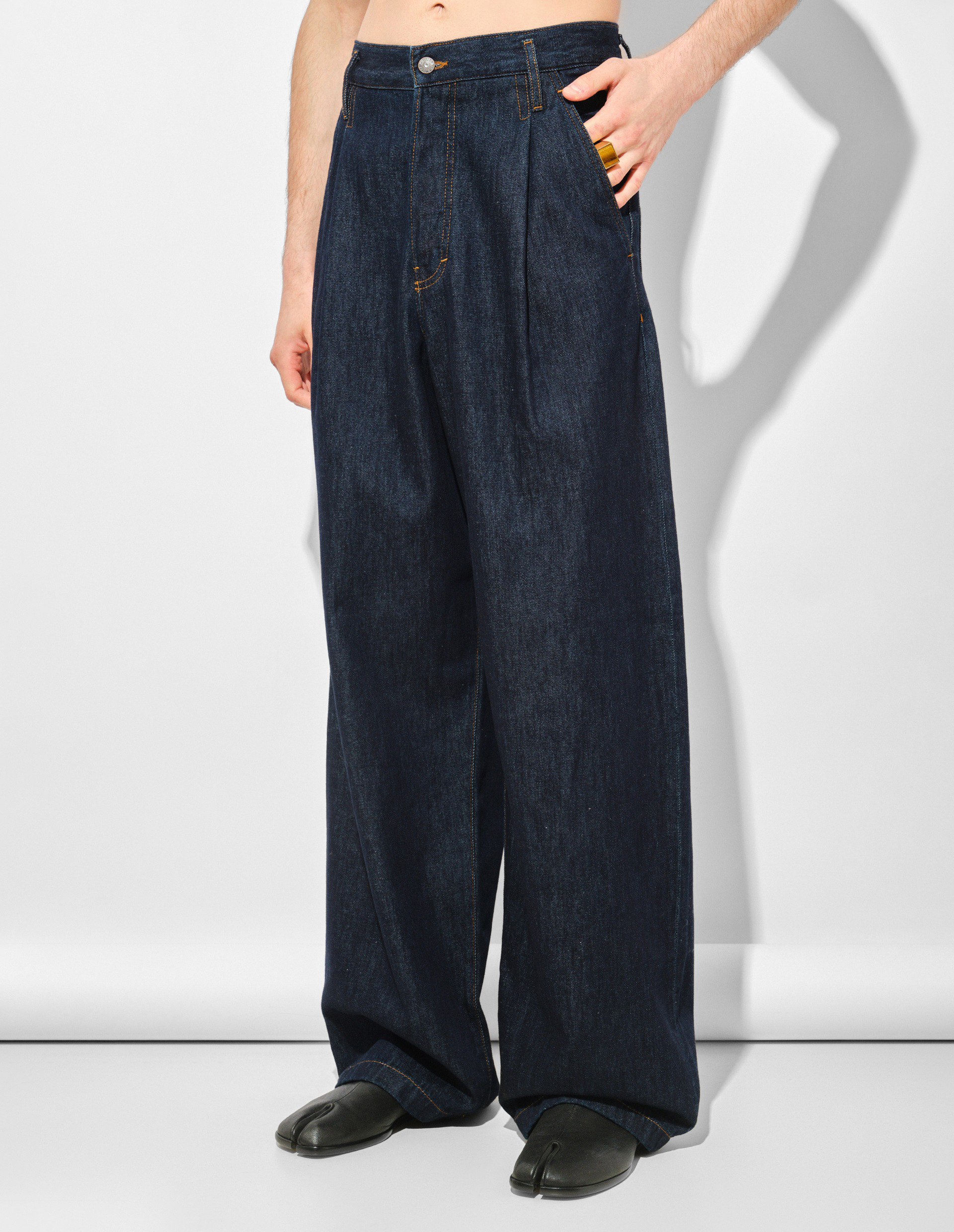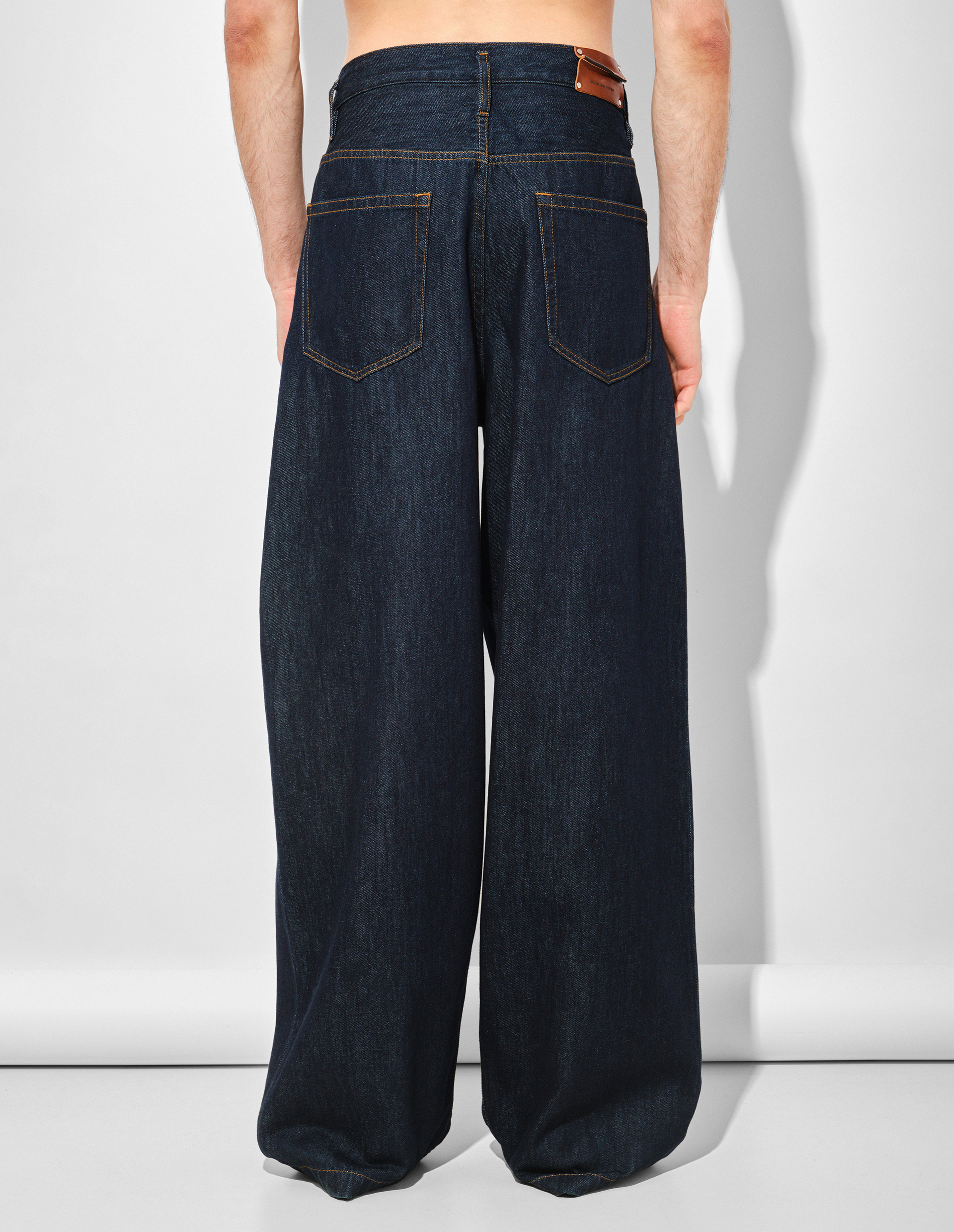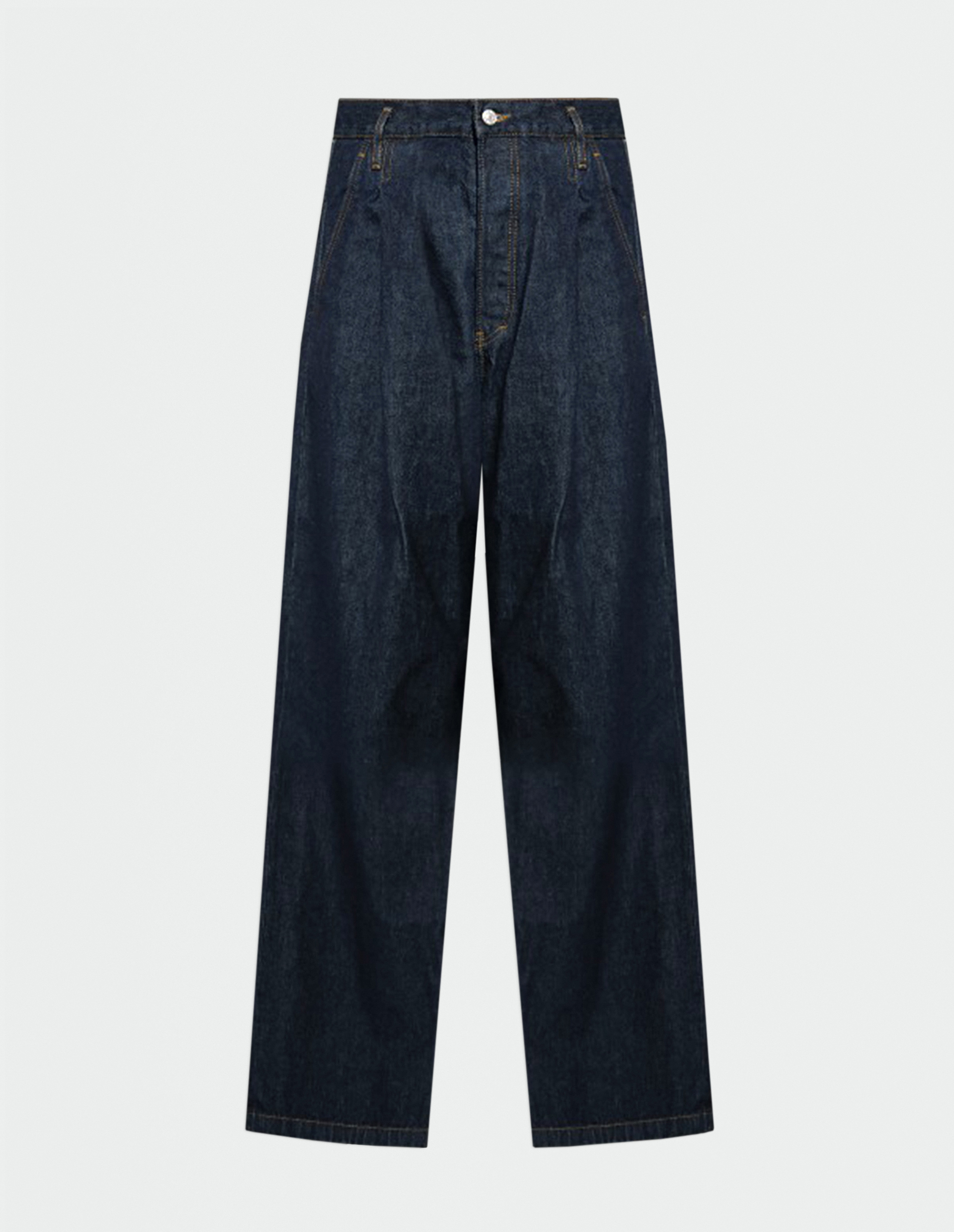 Функциональность продумана до мелочей: пять вместительных карманов, шлёвки под ремень и пуговичная застёжка сохраняют верность канонам жанра. Со временем глубокий синий тон приобретёт благородную патину, становясь уникальным.