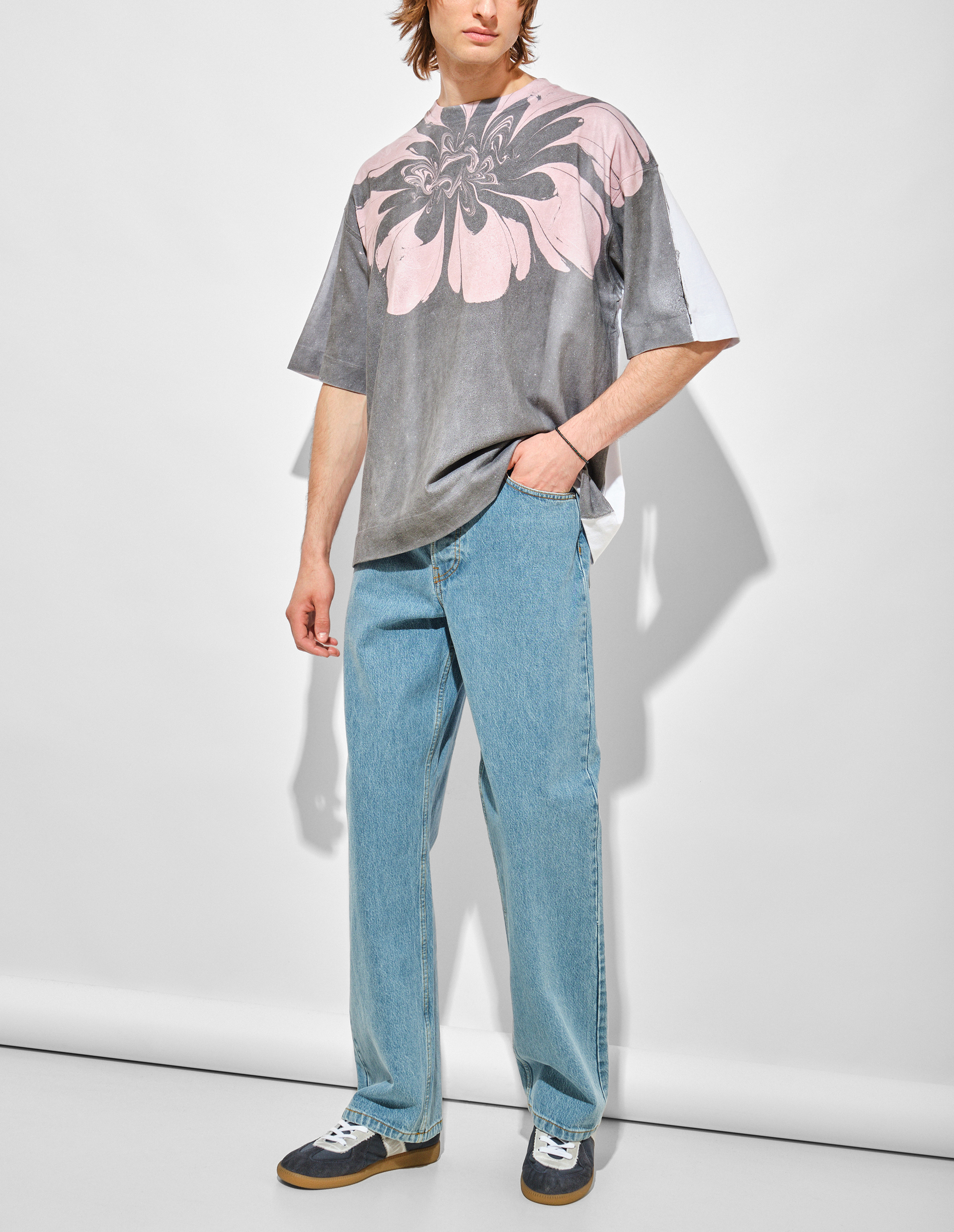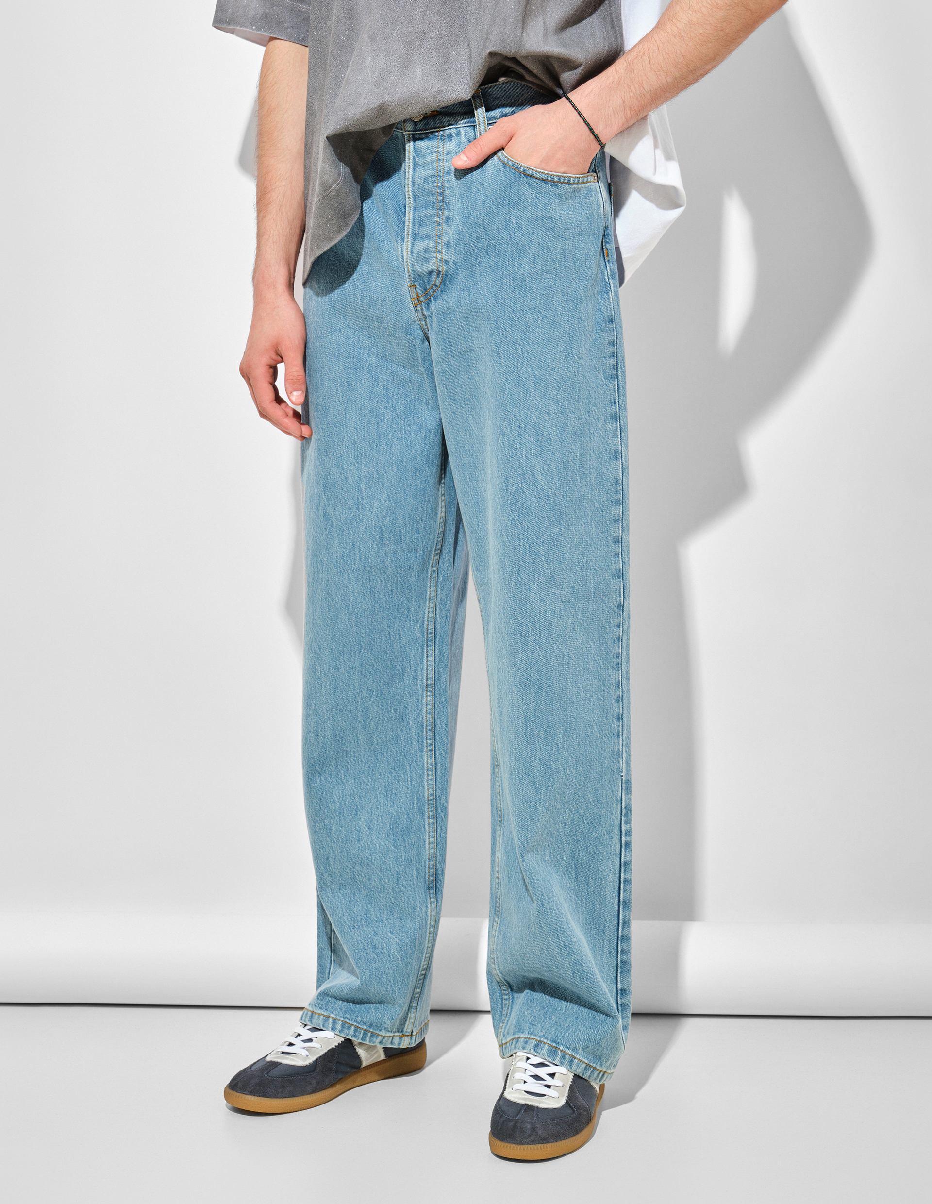 Эти джинсы сочетают классический крой с современными деталями. Широкий силуэт с пятью карманами обеспечивает удобство и функциональность. Особенность модели – выбеленная отделка и фирменный патч с заклепками на задней части пояса, подчеркивающий принадлежность к коллекции бренда. Плотный хлопок гарантирует комфорт при носке и долговечность. Универсальный дизайн подходит для создания разных образов – от повседневного до стильного городского лука. Dries Van Noten сохраняет верность качественным материалам и продуманным деталям, превращая базовую вещь в must-have сезона.
