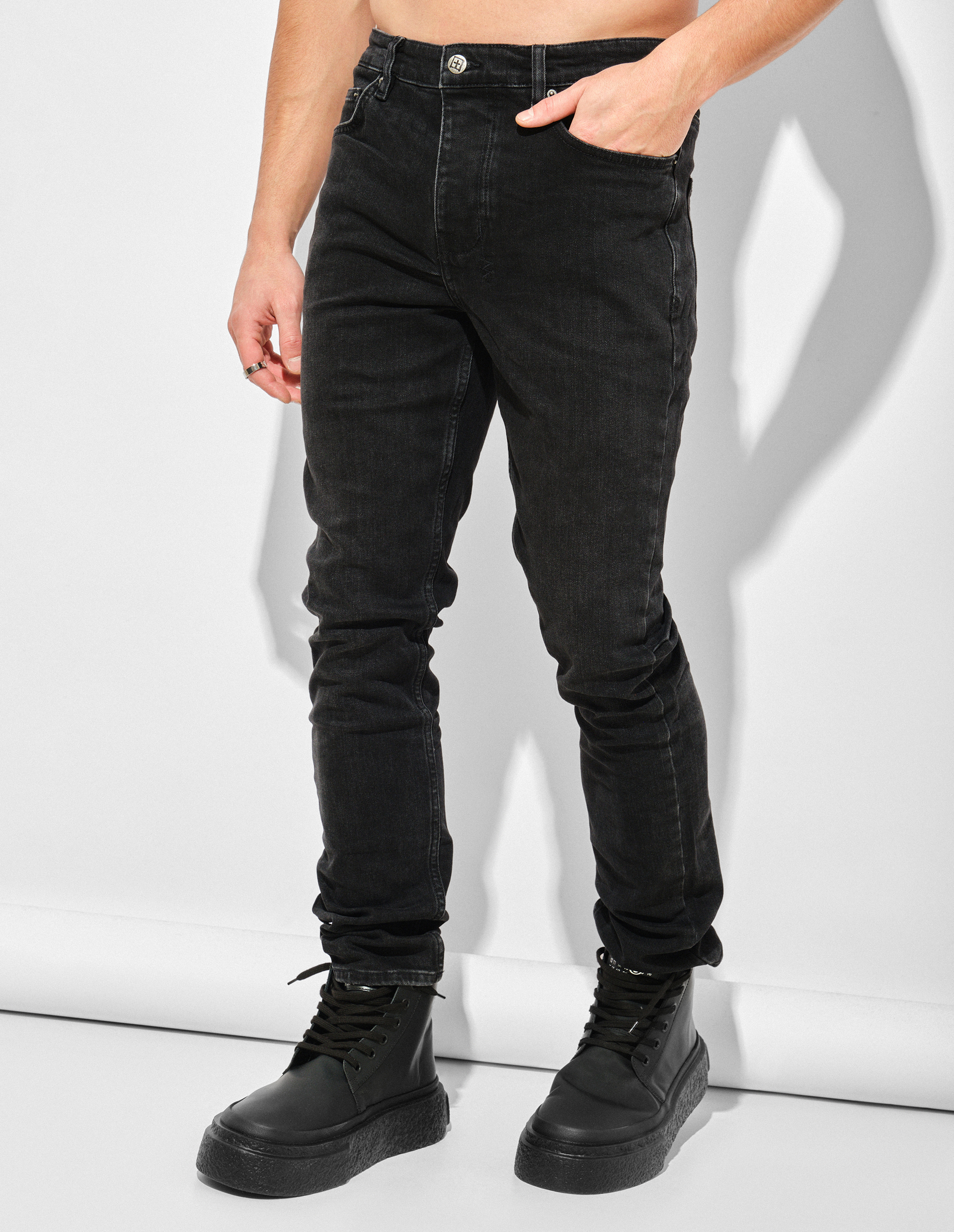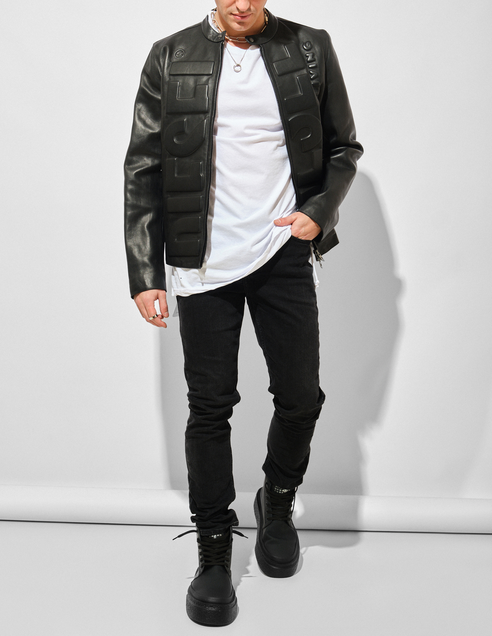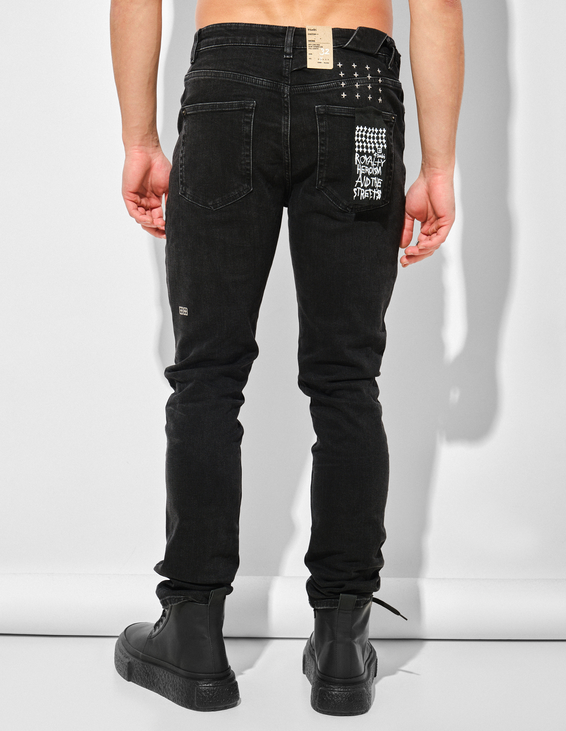 Chitch Krow — джинсы изготовлены из премиального турецкого денима, окрашенного в угольно-черный цвет. Эта модель также имеет зауженный силуэт, среднюю посадку, классический крой с пятью карманами. Брюки из эксклюзивного семейства Chitch предлагают больше объема, чем традиционные скинни, образуя мягкие складки на щиколотках и уникальные детали, включая наклонную голландскую петлю на талии, вытачки вдоль швов, съемную бирку-флаг сзади с надписью ‘Royalty, Heroism & The Streets’.