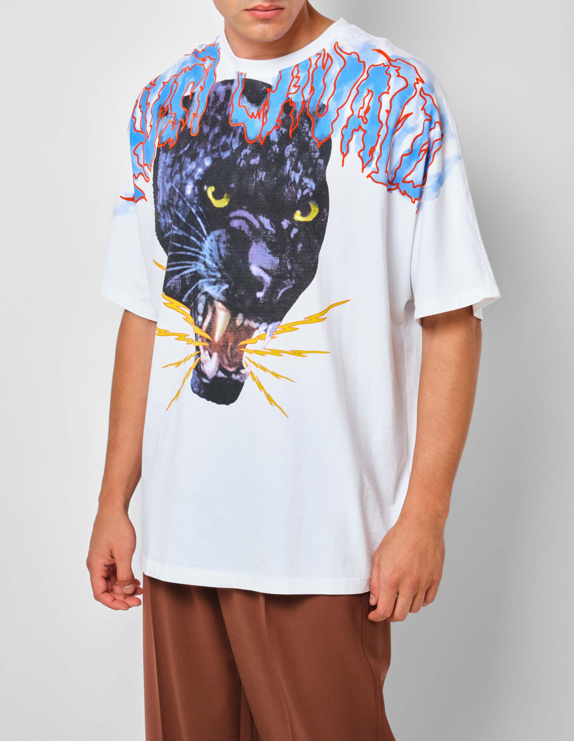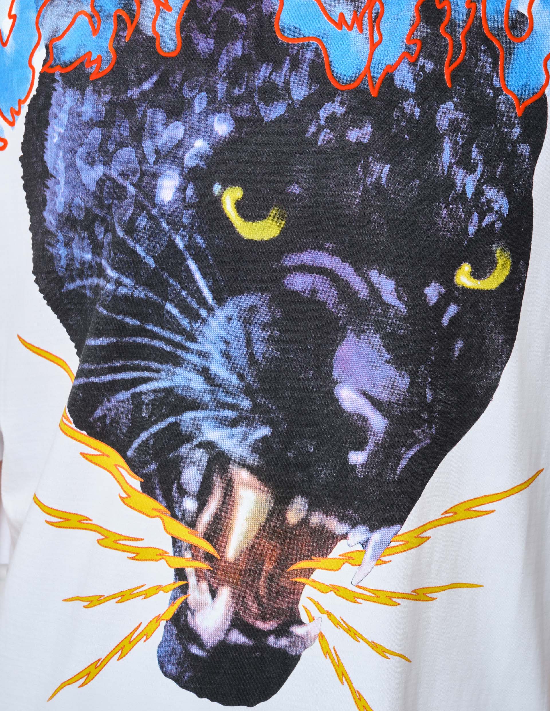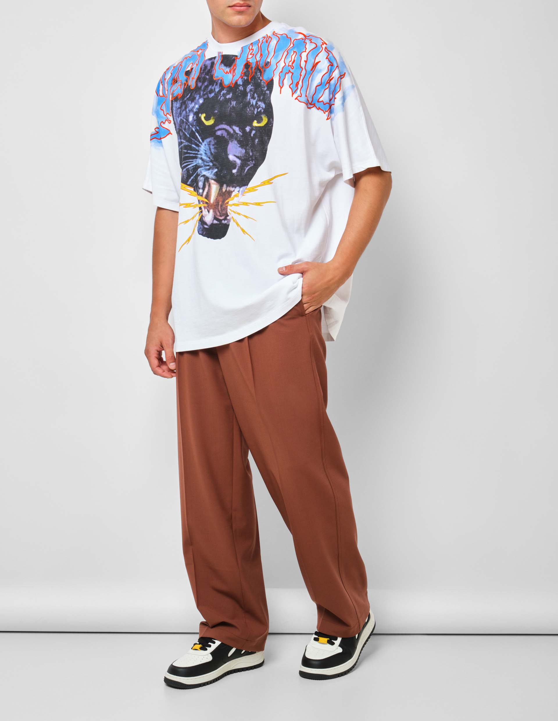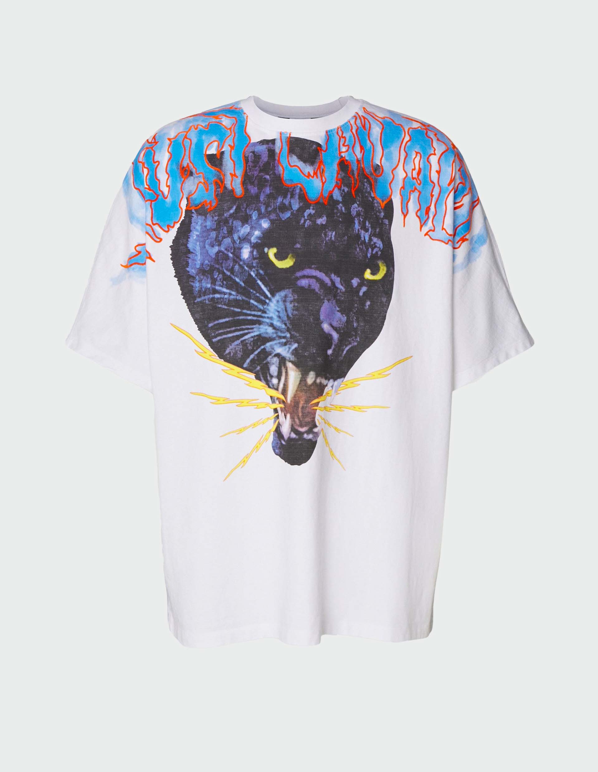 Фирменный анималистичный принт, который активно используется в изображениях бренда Just Cavalli, передает сложный, бунтарский и необузданный характер модного дома, который символизируется животным рисунком агрессивной черной пантеры на белом полотне футболке. Поддержать такой дикий принт способен материал из прочного хлопкового трикотажа, которое отлично пропускает воздух, комфортно облегает тело и сохраняет безупречный внешний вид изделия даже после многочисленных стирок.
