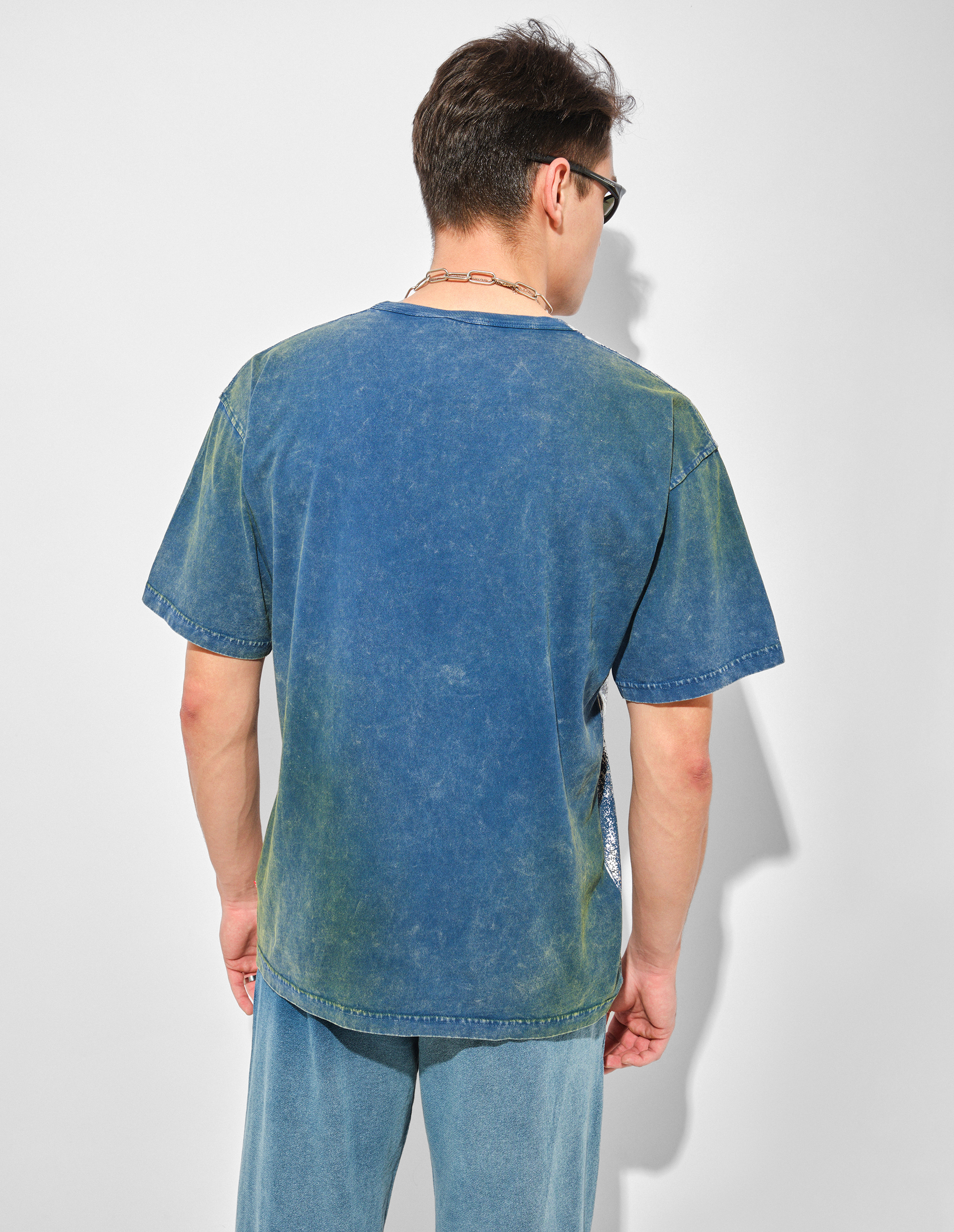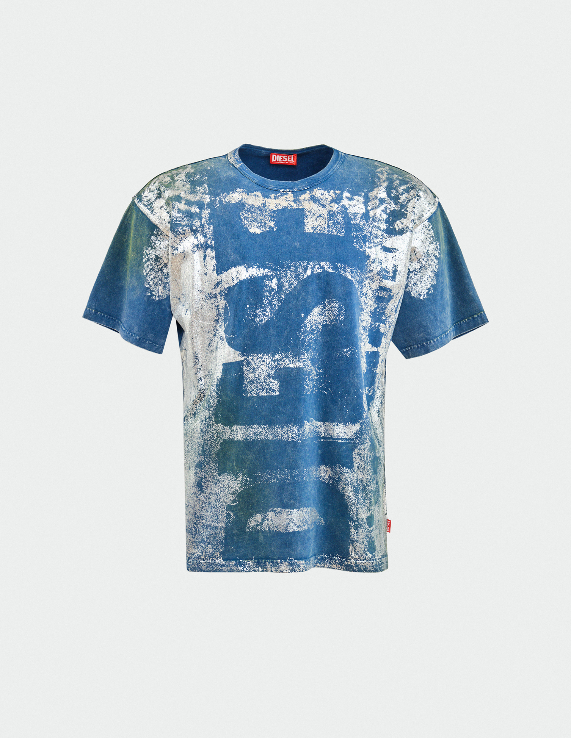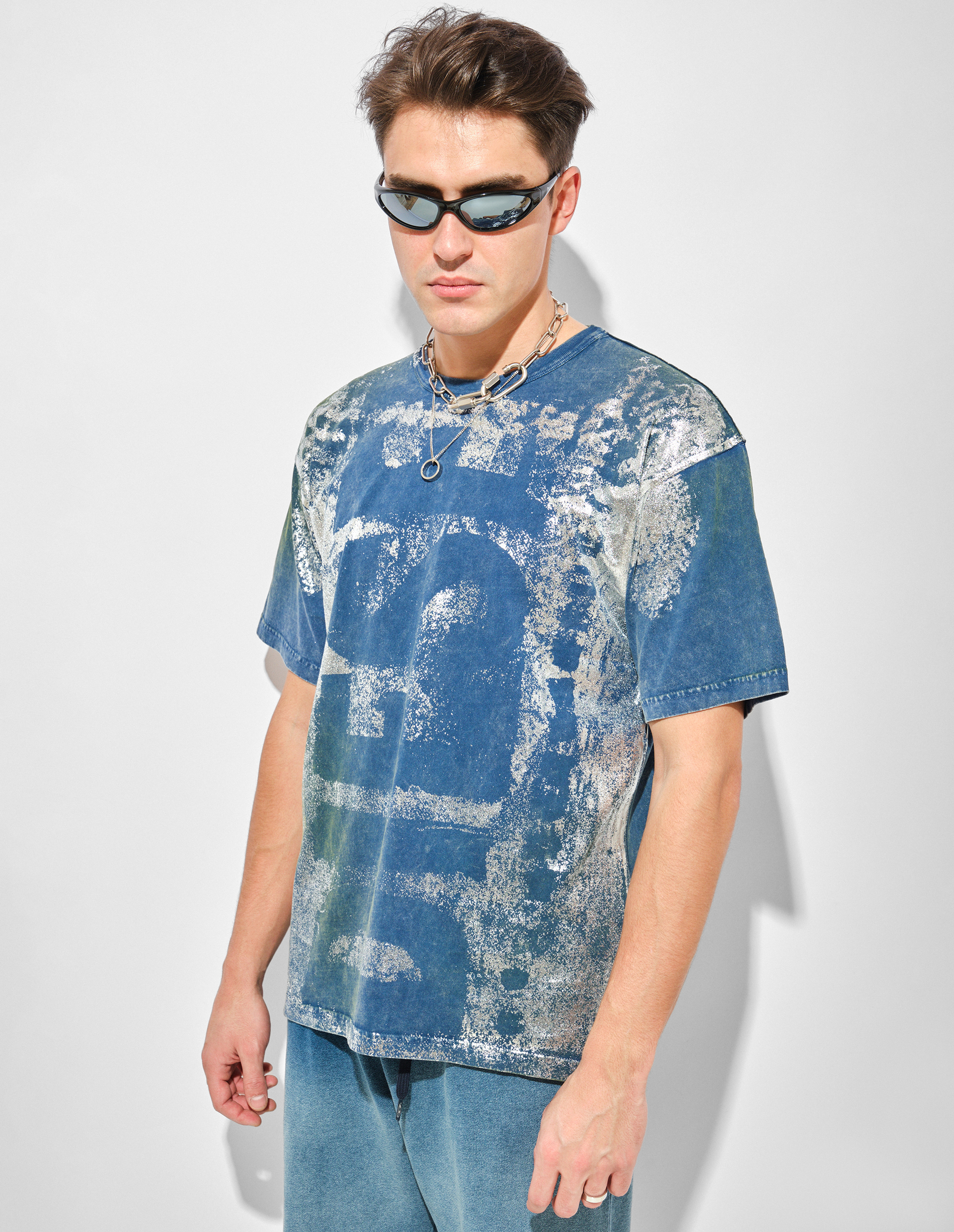 Эта футболка со свободным силуэтом изготовлена из мягкого джерси на основе 100% органического хлопка. Она намеренно имеет винтажный, слегка измазанный вид для создания непринужденного, смелого образа без оглядки на мнение окружающих. Поверхность материала обработана для мраморного эффекта со всплесками распыленной краски и затененными металлизированными зонами. Передняя панель была частично замаскирована перед фольгированием, чтобы сформировать контуры большого логотипа.