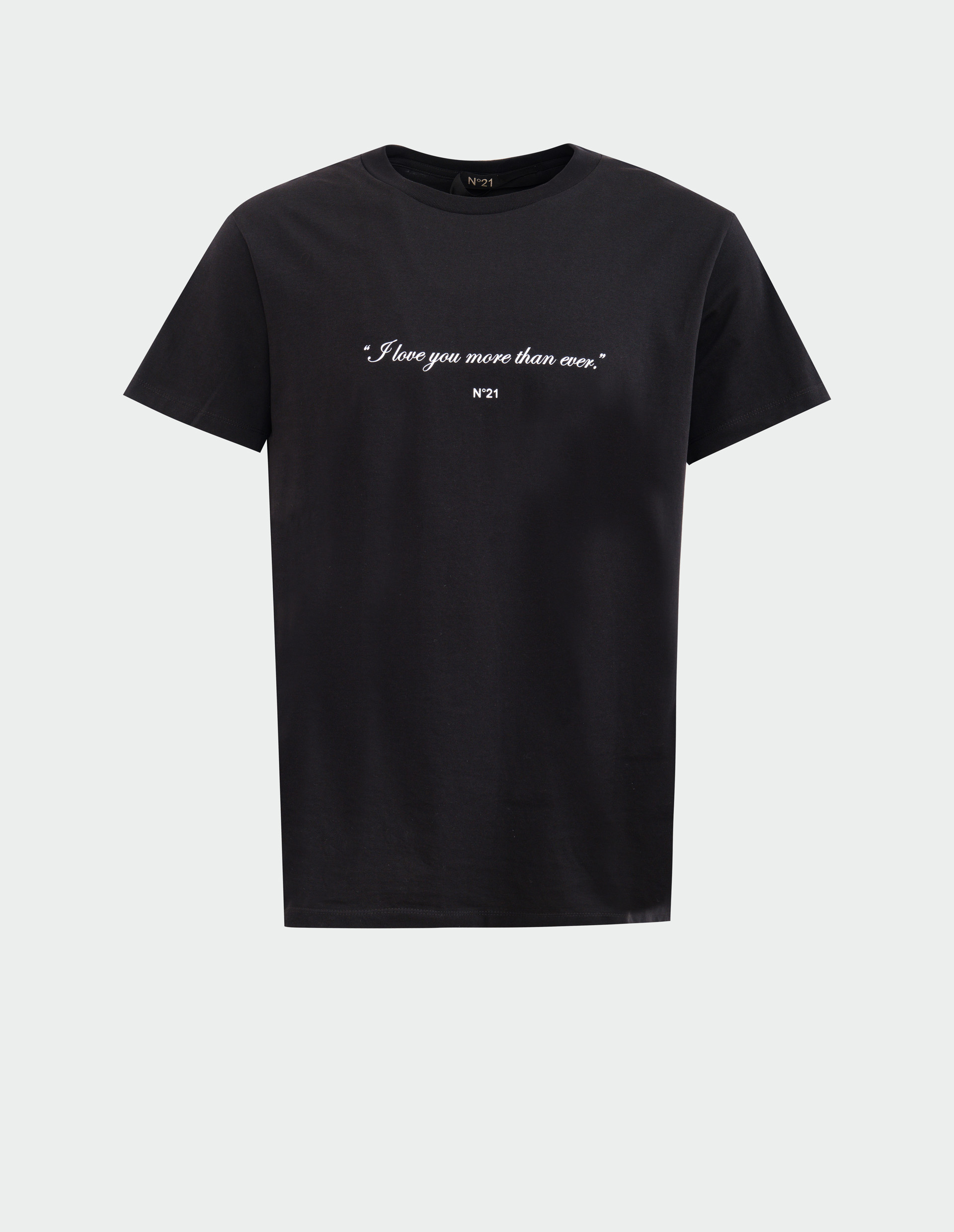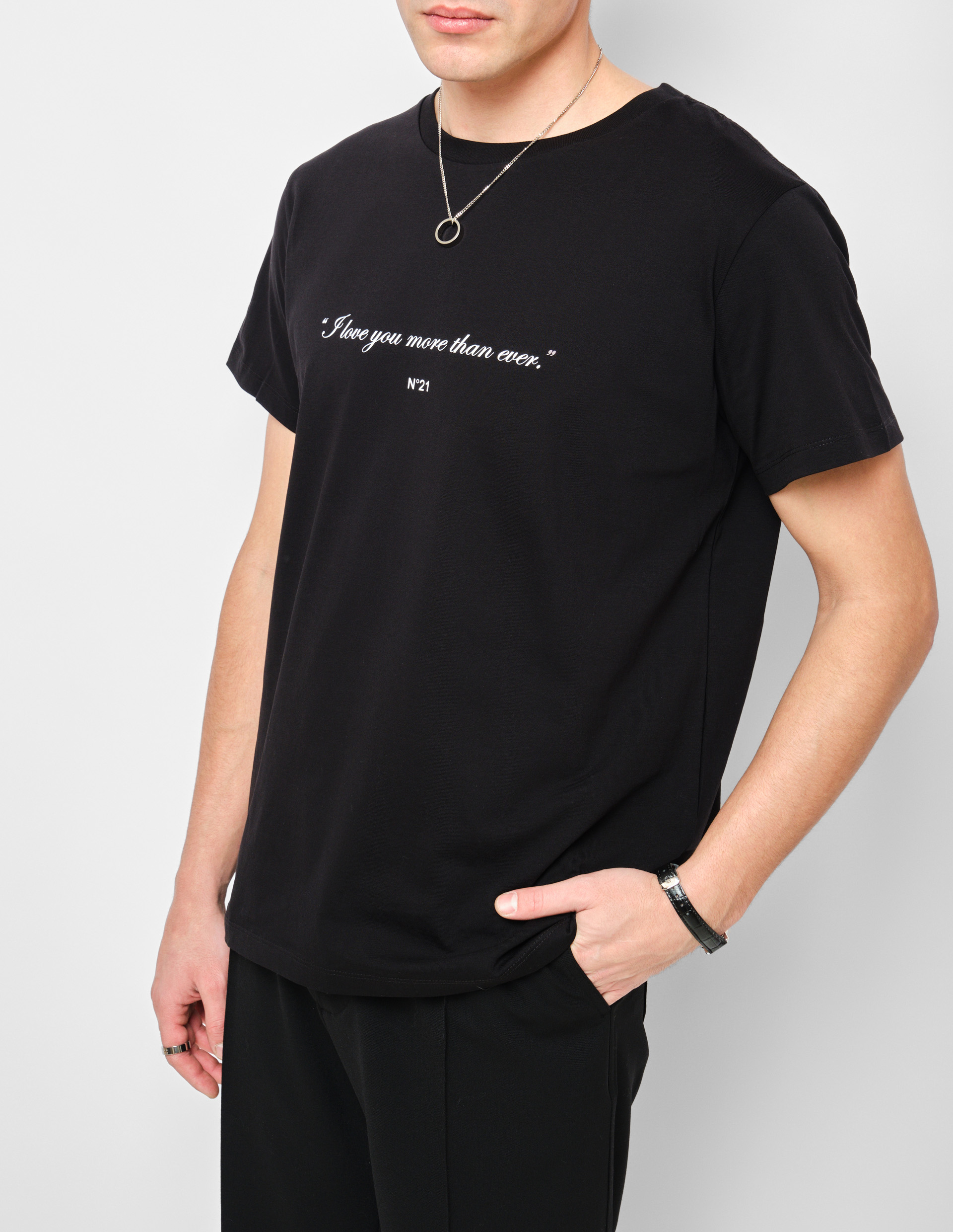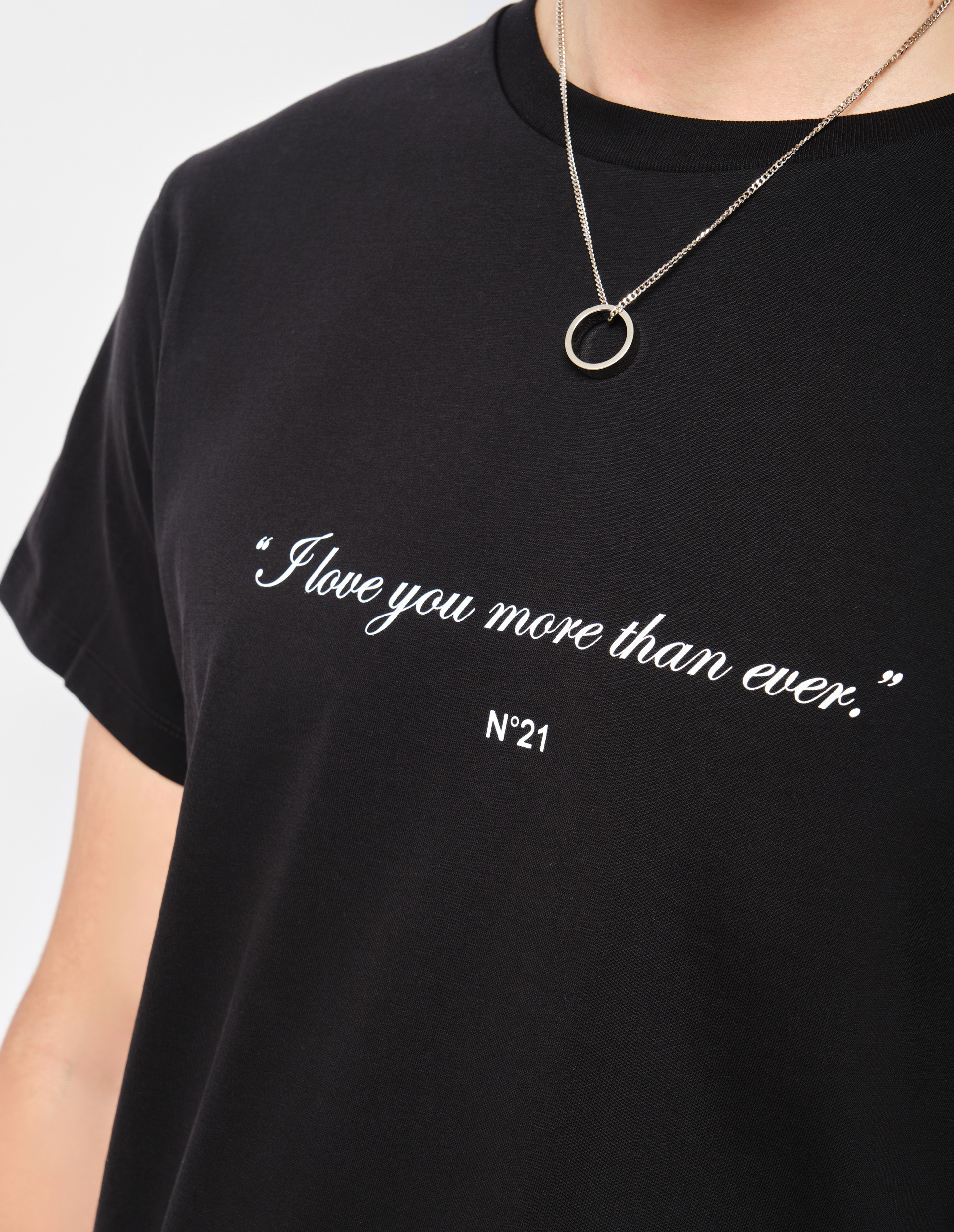 Футболка бренда №21 выполнена из премиального органического хлопка. Получилось мягкое джерси с прочным переплетением волокон, хорошо сохраняющее форму и позволяющее коже дышать. Свободный крой не стесняет движения, а круглый вырез устойчив к растяжению и комфортно прилегает к телу. Изделие окрасили в готовом виде и нанесли эксклюзивную надпись "“I love you more than ever", свидетельствующую об особом творческом подходе к дизайну, любви к кропотливой работе и высочайшему итальянскому качеству.
