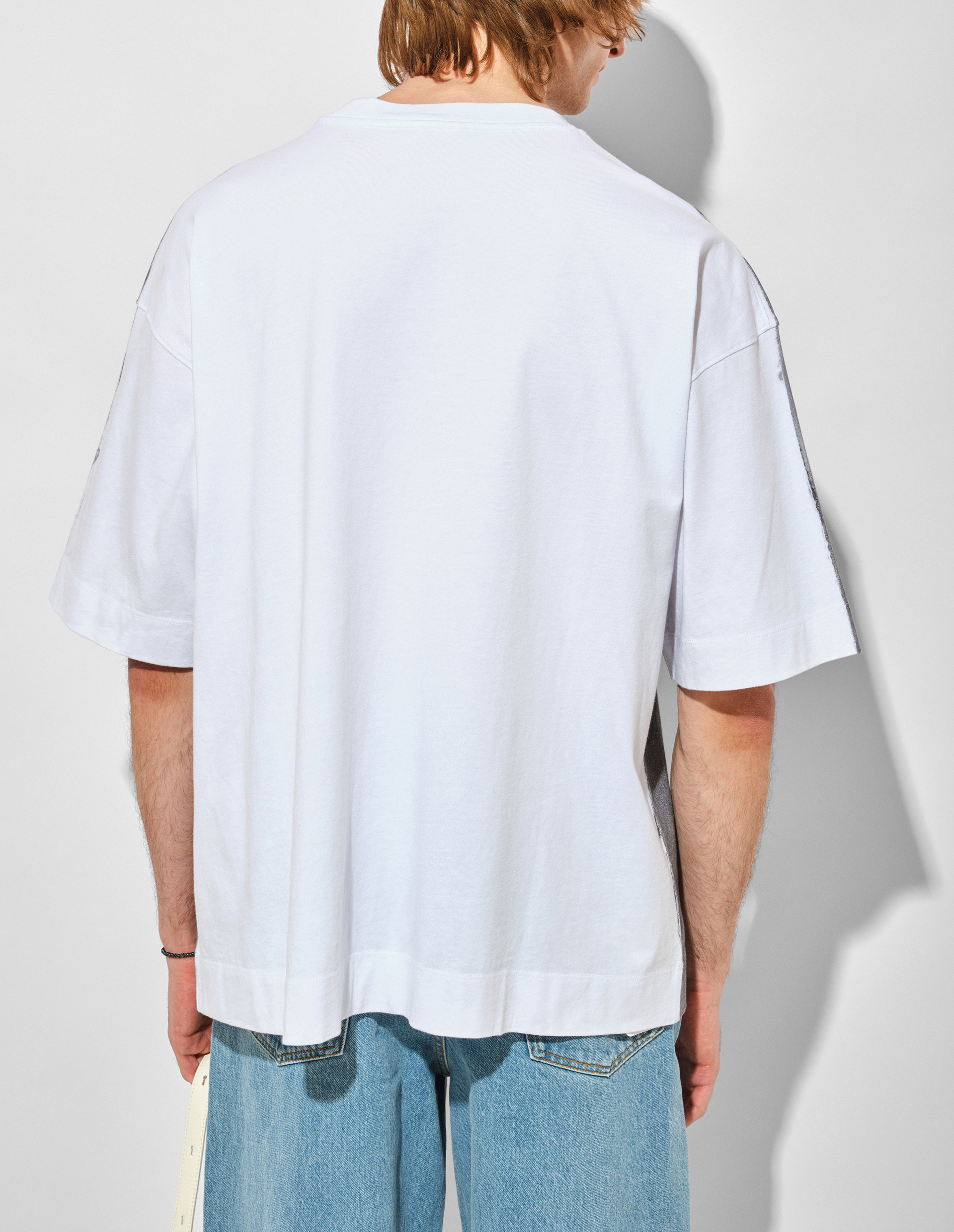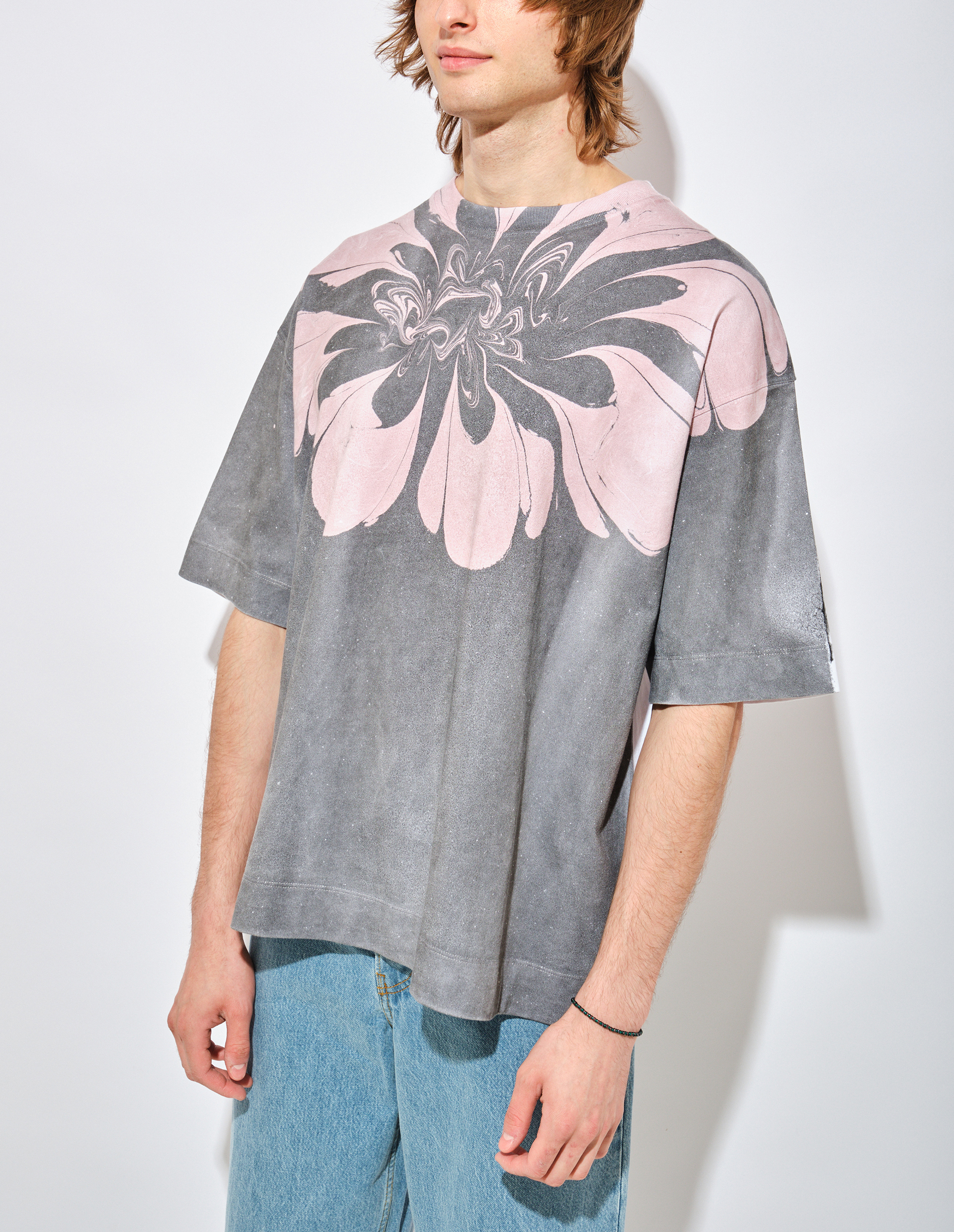 Оверсайз-футболка из плотного хлопкового трикотажа с принтом, вдохновленным древней японской техникой суминагаси. Этот 1000-летний метод мраморирования, где чернила, нанесенные на воду, создают неповторимые узоры, воплотился в графичном цветочном мотиве. Каждое изделие уникально благодаря естественным вариациям ручной техники. Свободный крой с короткими рукавами и круглым вырезом сочетает современный комфорт с традиционной эстетикой.