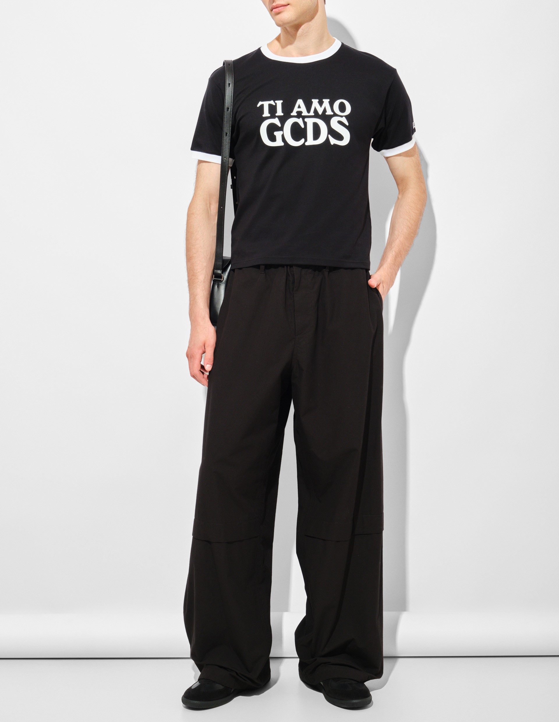 Футболка GCDS свободного кроя выполнена на основе мягкого хлопкового джерси с оверсайз-силуэтом, круглым вырезом и короткими рукавами. Контрастная бортовая окантовка подчеркивает графичность кроя с намеком на спортивную эстетику. Фронтальный принт «Ti Amo GCDS» выполнен в фирменной стилистике бренда — слегка наивный шрифт, ироничная отсылка к поп-культуре и уличному стилю. Каждая деталь отражает ДНК марки: саркастичный взгляд на моду, итальянское качество материалов и провокационный подход к дизайну.