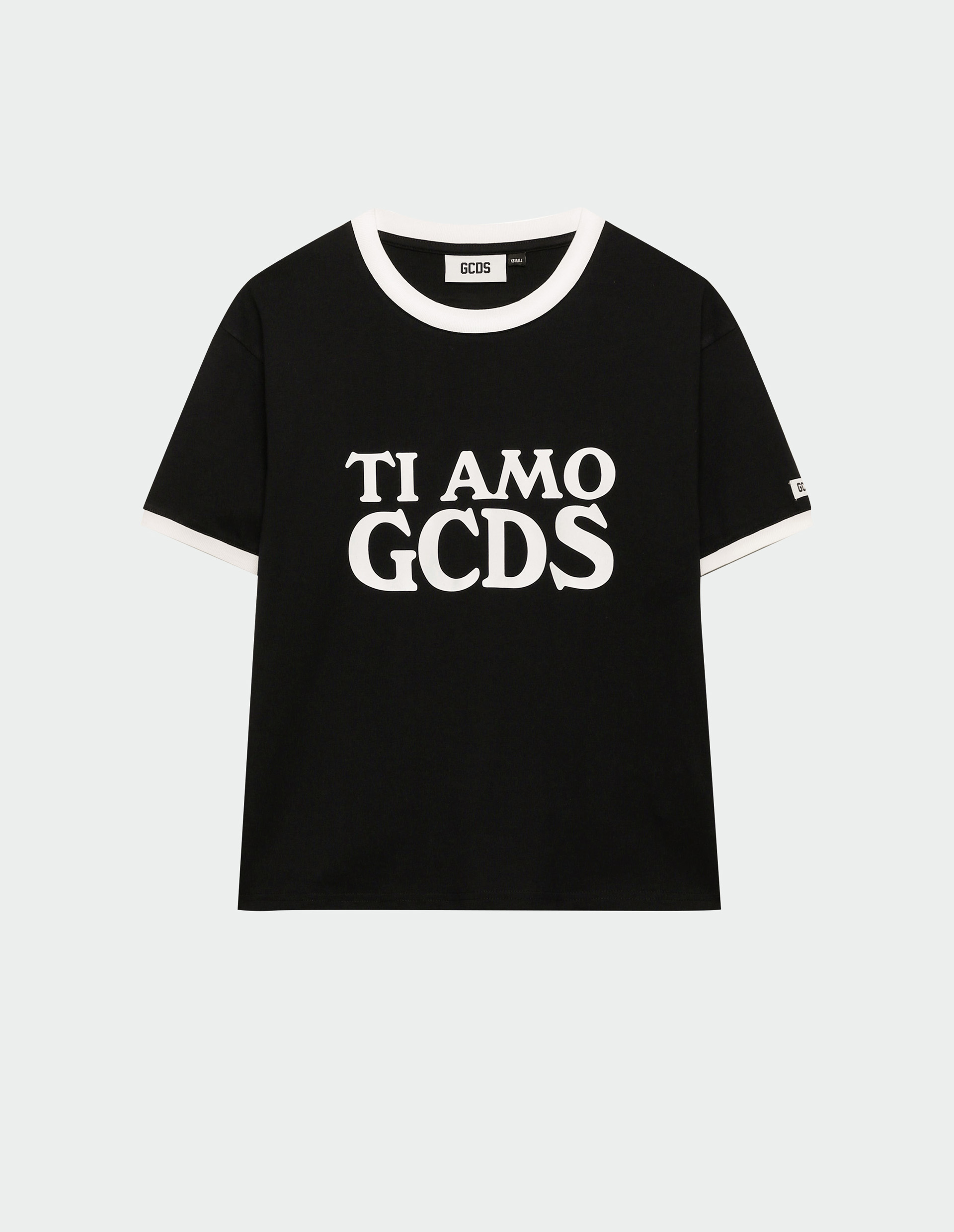 Черная футболка с белой окантовкой и принтом TI AMO GCDS