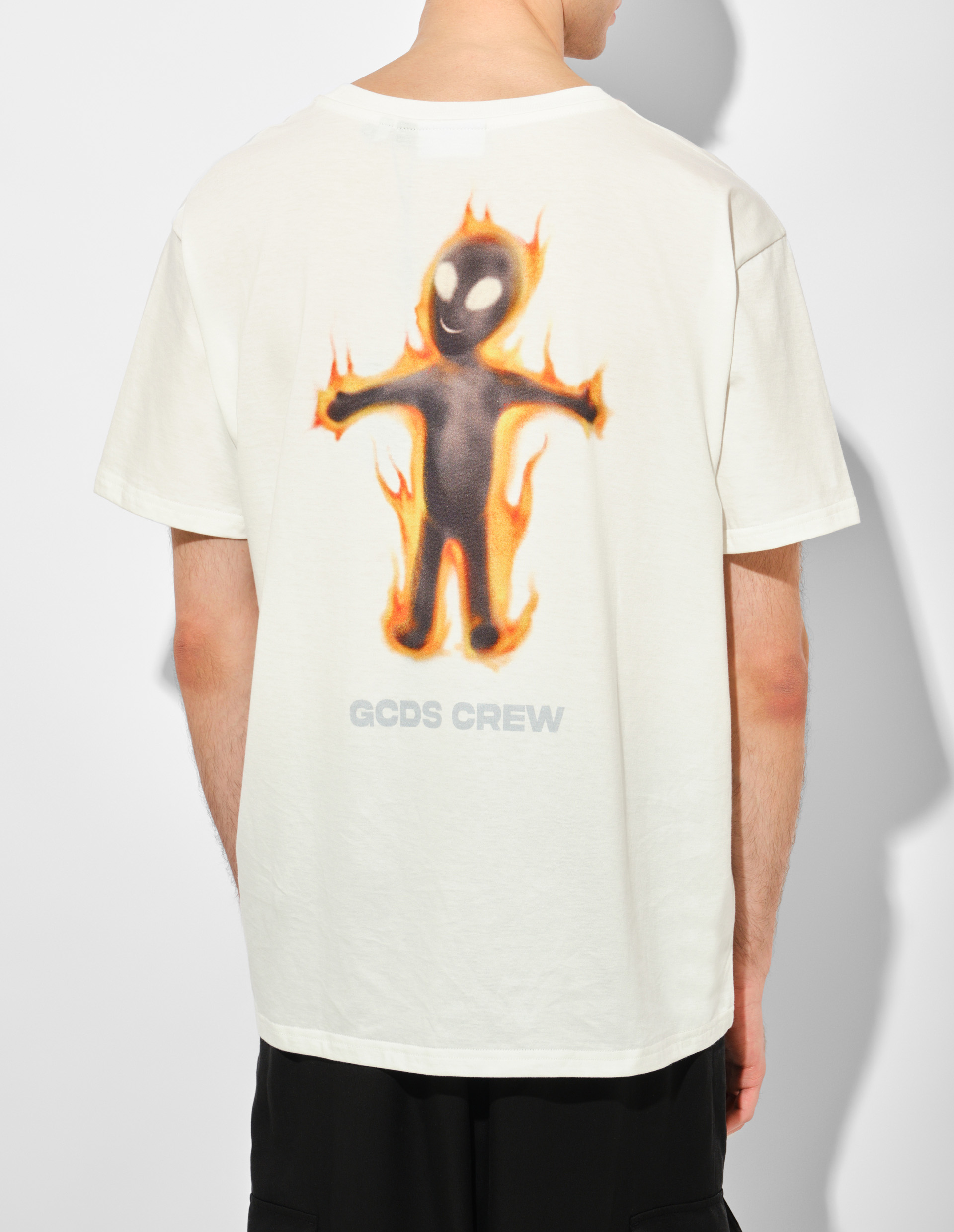 Провокация становится новой нормой в этой футболке GCDS из коллекции весна-лето 2025. Принт «Wirdo Flames» на спине изображает горящего человечка — мощную метафору борьбы между отчаянием и бунтом, превращающую модель в носимый арт-объект. Поп-культура пульсирует в каждой детали этой футболки, оставляя игривые намёки и отсылки, которые заставят задуматься, а 100% хлопок и истинное итальянское качество остаются символом постоянства в этом безумном мире.