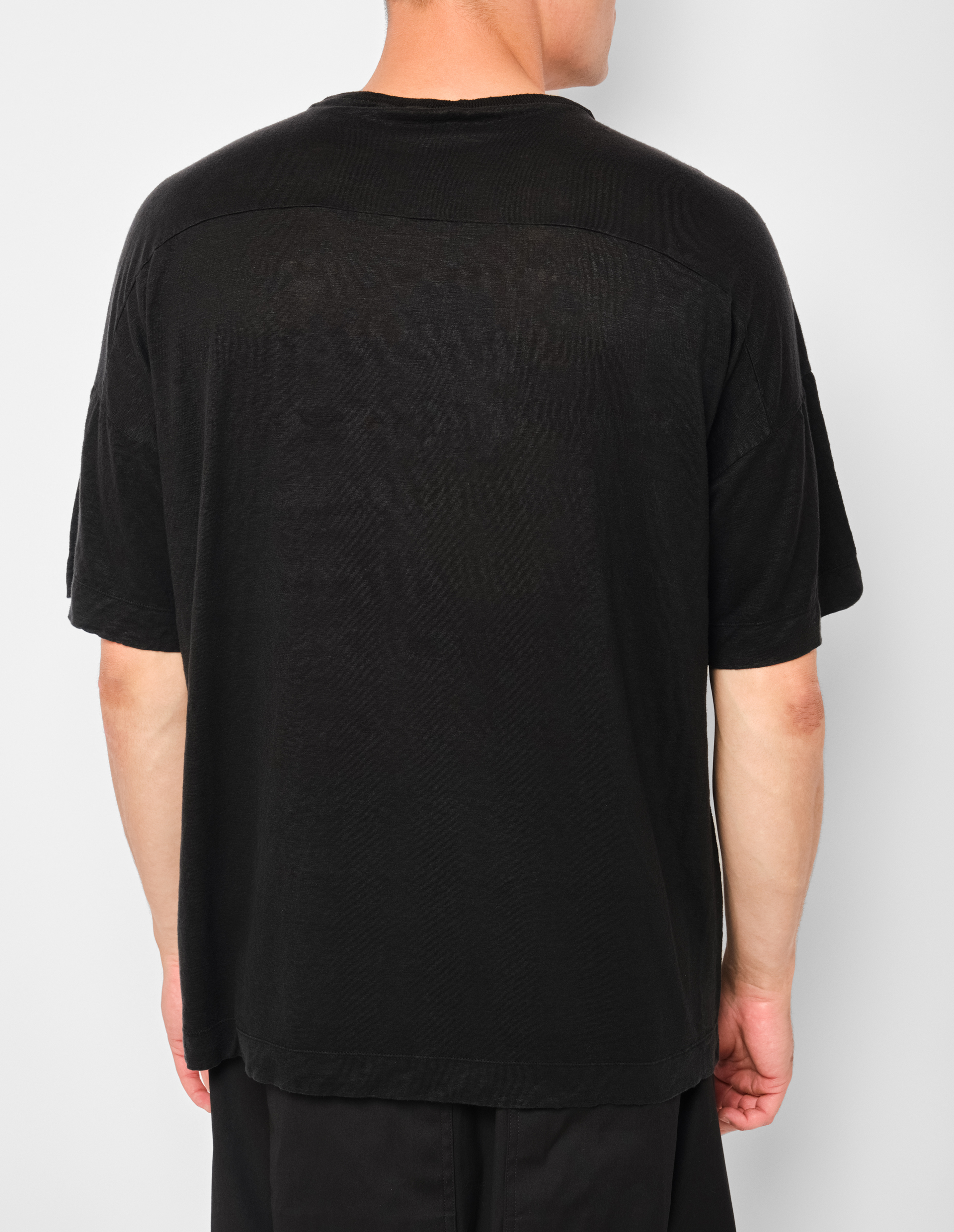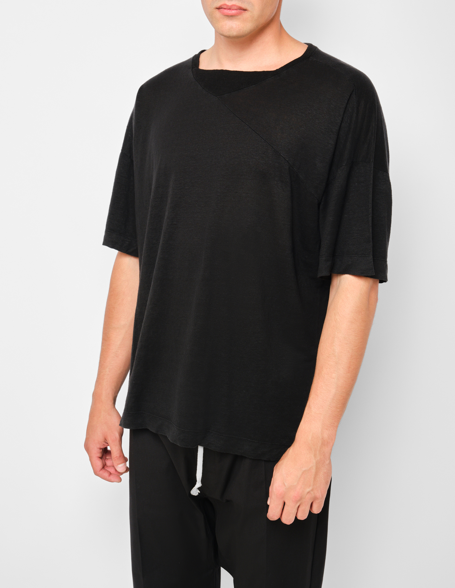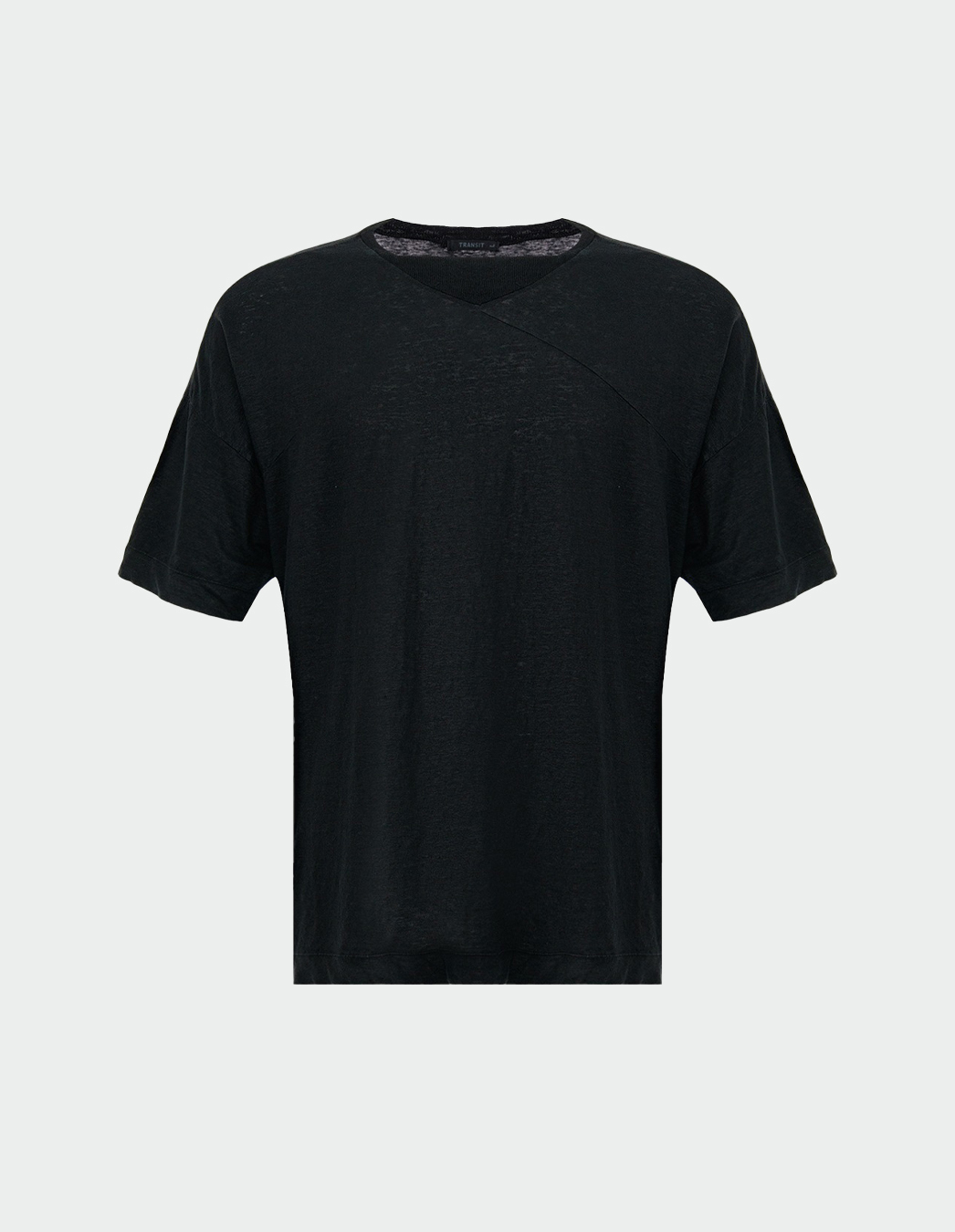 Transit представляет футболку из конопляного джерси, демонстрируя инновационный подход к работе с натуральными материалами. Особое плетение льняных и конопляных нитей создает характерную текстуру, которая придает вещи фирменный характер. V-образный вырез с трикотажной вставкой продолжается рельефным швом на груди, одновременной рассекающим и соединяющим крой. Метод холодного окрашивания дает глубокий, насыщенный оттенок, который со временем приобретает благородные потертости. Эта модель производится на фабрике в Италии, где сочетают современные технологии с ручной обработкой деталей.
