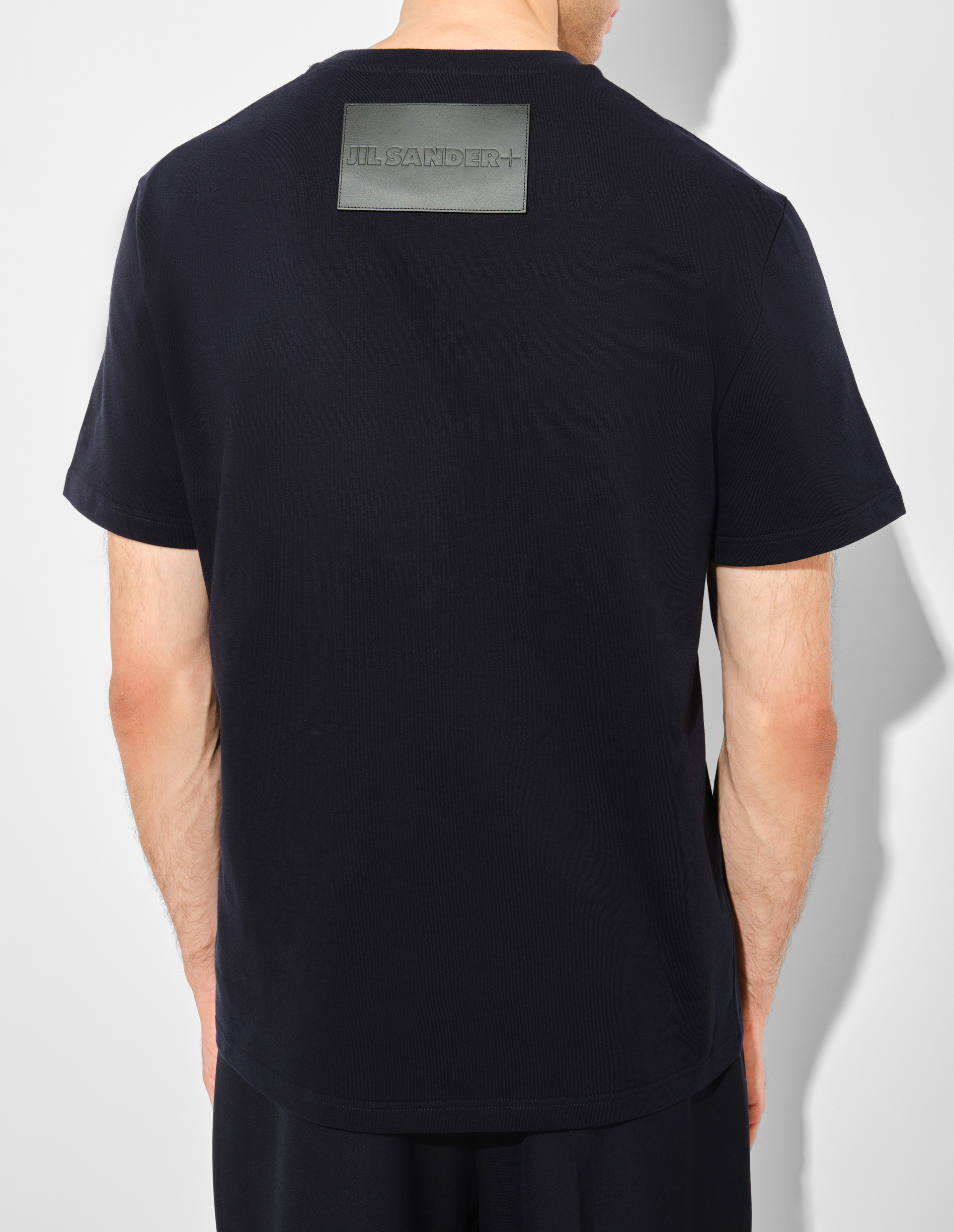 Темно-синяя футболка из плотного джерси воплощает лаконичную эстетику Jil Sander. Мужская модель с короткими рукавами и классическим кроем подчеркивает универсальность, а итальянский хлопок особого плетения обеспечивает идеальную посадку и долговечность, сохраняя форму после множества стирок. Кожаная нашивка с тиснёным логотипом Jil Sander+ на спине обозначает принадлежность к особой линейке бренда, созданной для современной активной жизни, где сдержанная роскошь сочетается с функциональностью, высочайшим качеством материалов и чистотой дизайна.