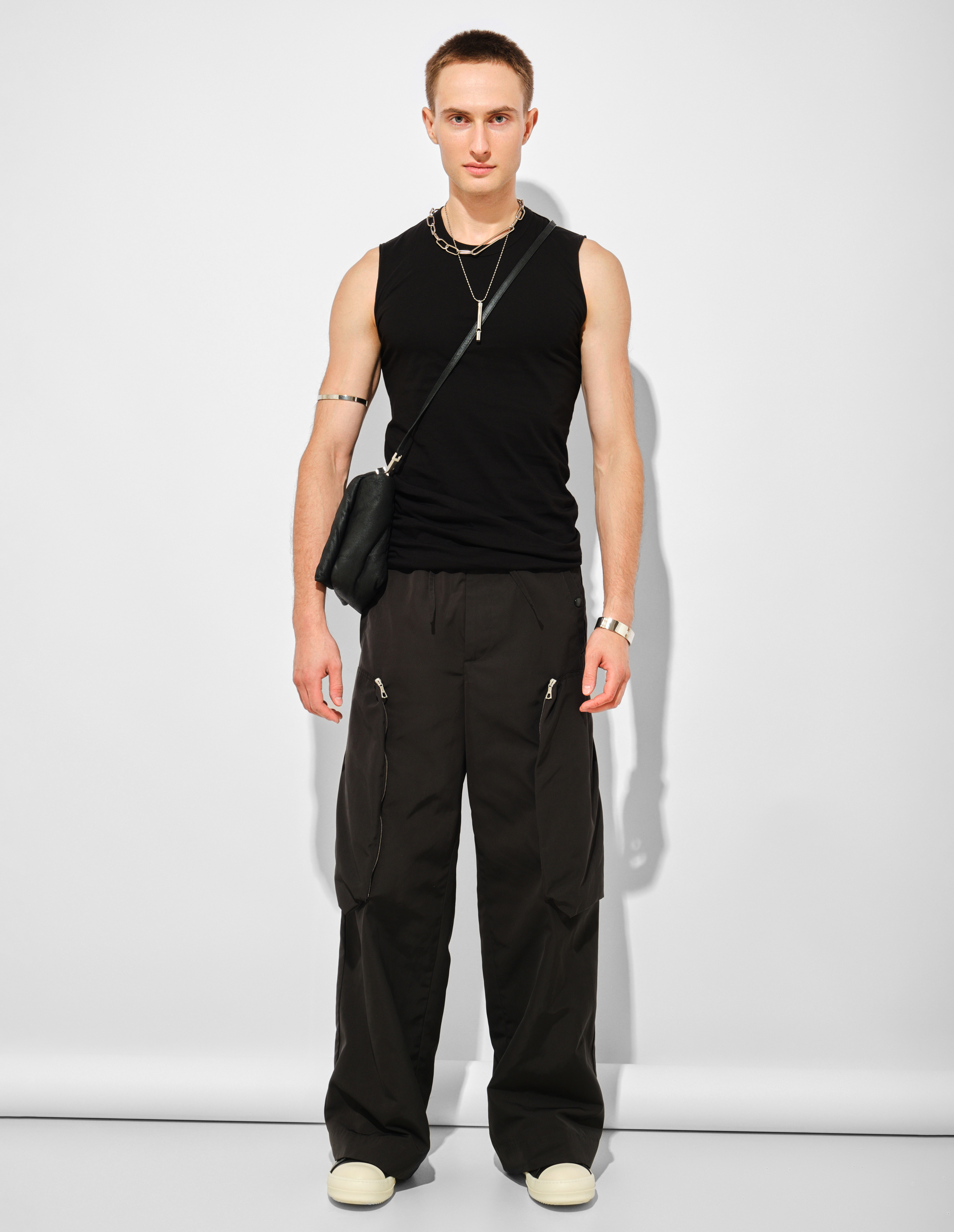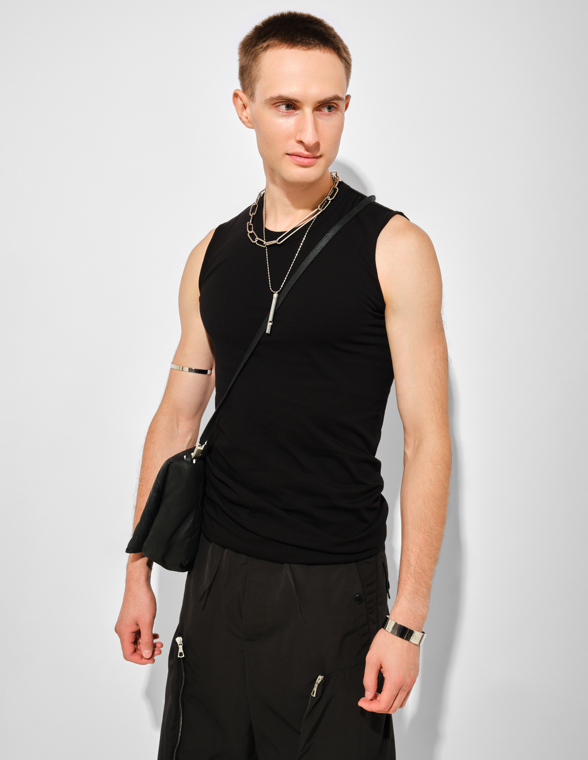 Черный удлиненный топ без рукавов Basic SL T демонстрирует скульптурный минимализм, характерный для эстетики бренда. Модель из классического хлопкового джерси с круглым вырезом и необработанным краем подола строится на контрасте лаконичной формы и сложной конструкции. Фирменный шов на спине подчеркивает анатомические линии мужской фигуры, создавая четкий архитектурный силуэт. Удлиненный крой и намеренно грубый край низа создают эффект незавершенности, характерный для деконструктивистского подхода Рика Оуэнса. Модель отражает принципы коллекции FW25 Concordians через аскетичную палитру и тщательно продуманную простоту, где каждая деталь становится частью целостного высказывания о современной мужественности. Плотный хлопковый джерси сохраняет форму, обеспечивая комфорт в носке и подчеркивая естественные контуры тела.