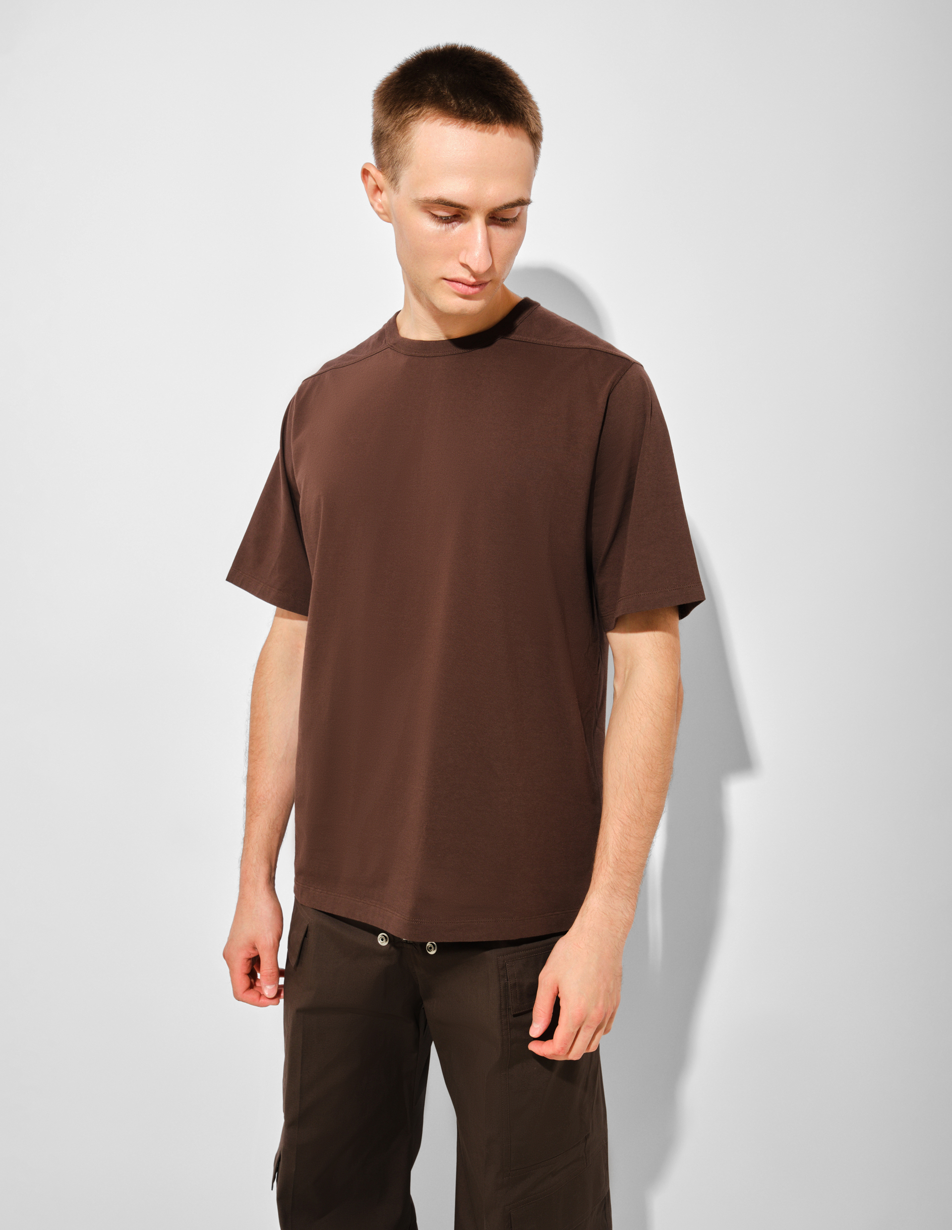 Геометрически точные линии и скульптурная простота характеризуют футболку Brad T. Модель из плотного хлопкового джерси с эффектом washed отличается квадратной формой и короткими рукавами. Фирменный оттенок darkdust в сочетании с горизонтальными плечевыми швами создает архитектурную линию, альтернативную классическим скосам — этот узнаваемый прием Рика Оуэнса формирует строгий графичный силуэт вместе с центральным швом на спинке. Плотная структура сертифицированного органического хлопка GOTS гарантирует сохранение формы и комфорт при носке. Локализация полного производственного цикла в итальянском регионе Конкордия отражает принципы коллекции FW25 Concordians, где осознанное производство становится неотъемлемой частью эстетики. За лаконичным внешним видом этой базовой вещи скрывается продуманная конструкция и ответственный подход к созданию одежды.