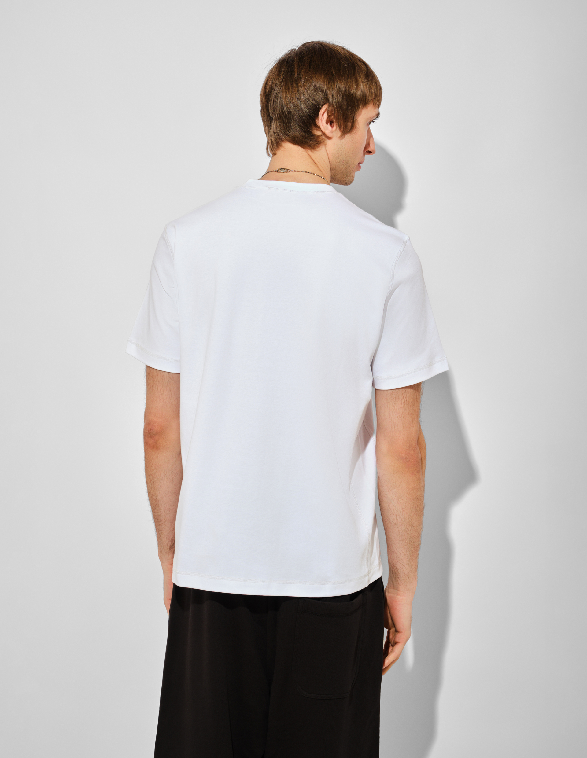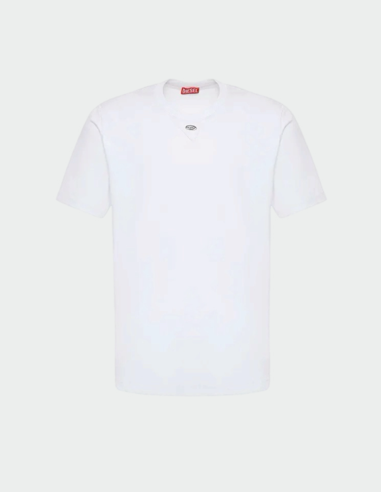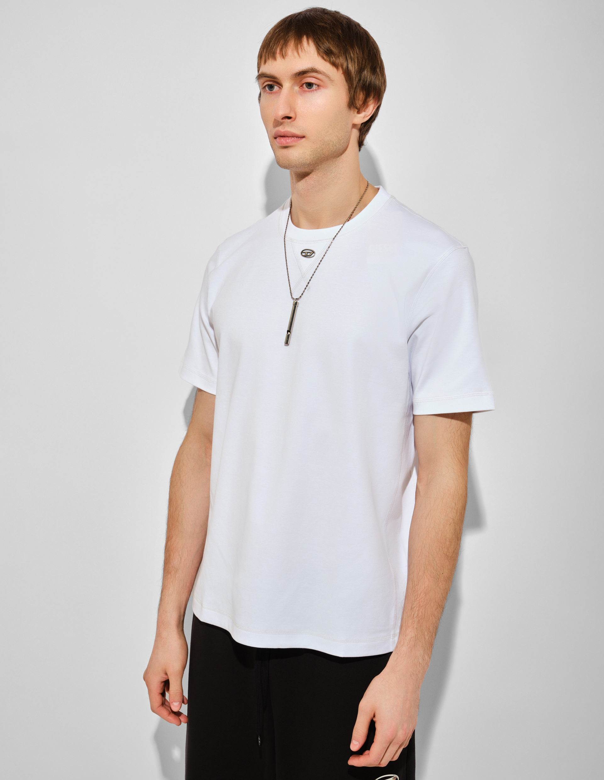 Архитектура шва на чистом холсте. Эта футболка от Diesel переосмысливает базовую вещь через внимание к конструктивным деталям. Белоснежный цвет выступает идеальным фоном для игры фактур: декоративные швы по всему изделию становятся главным графическим элементом, превращая функциональную строчку в эстетическое высказывание. Маленькое металлическое лого на ключице добавляет индустриального акцента — холодный блеск серебра контрастирует с чистотой хлопка, выдавая принадлежность к миру Diesel с его культом детали. Модель выполнена из мягкого, но износостойкого хлопкового джерси, сохраняющего форму. Классический прямой крой создает универсальный силуэт. В эру Гленна Мартенса бренд доказывает, что даже в минимализме есть место сложным решениям, где каждый шов работает на общую архитектуру.