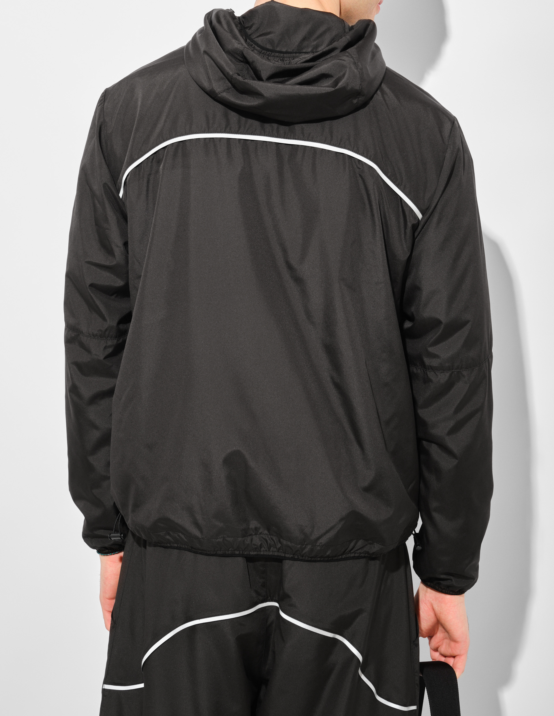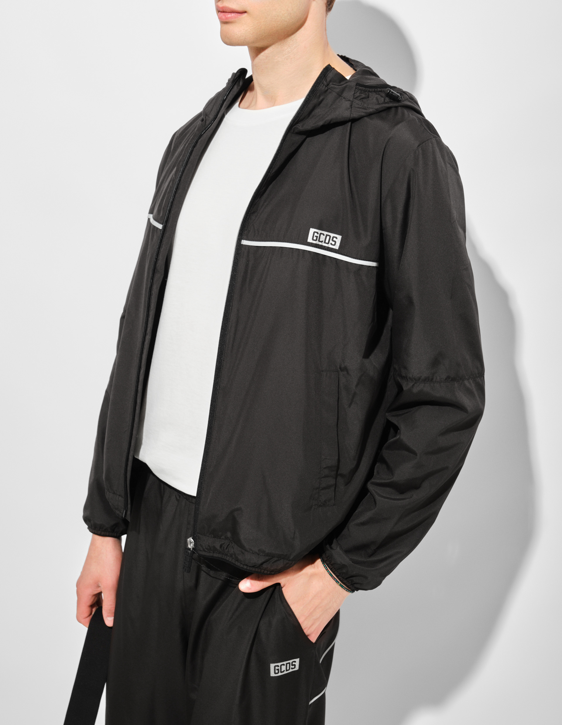 Укороченный силуэт этой нейлоновой ветровки бросает вызов традиционным представлениям об уличной одежде. Техничные детали – регулируемый капюшон с эластичной тесьмой, стопоры на линии низа и удобные боковые карманы – сочетаются с дерзкой эстетикой GCDS. Светоотражающая полоса на груди и спине работает как двойное заявление: функциональный элемент ночной видимости превращается в фирменный графический акцент, а проклеенная молния подчеркивает индустриальный характер вещи. Философия коллекции Essentials раскрывается здесь полностью: минималистичный дизайн, заряженный энергией стритвира.