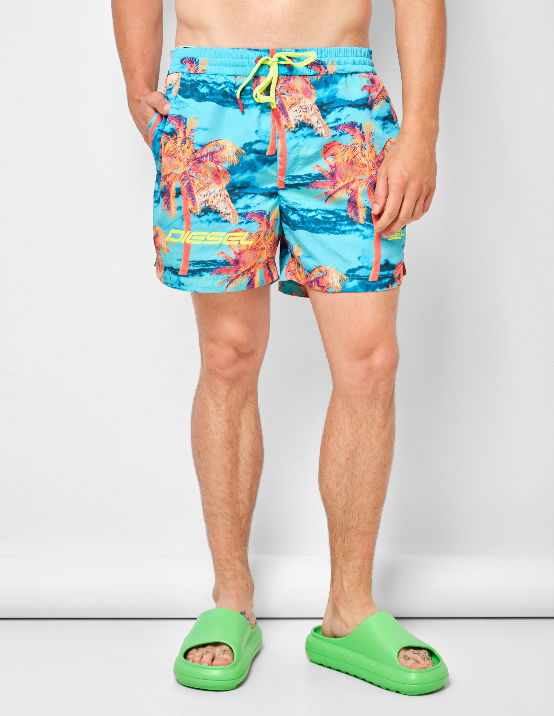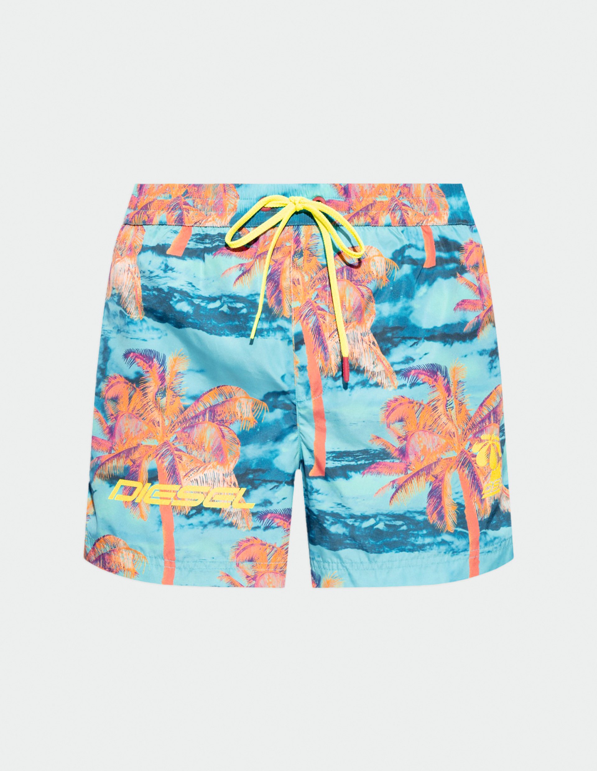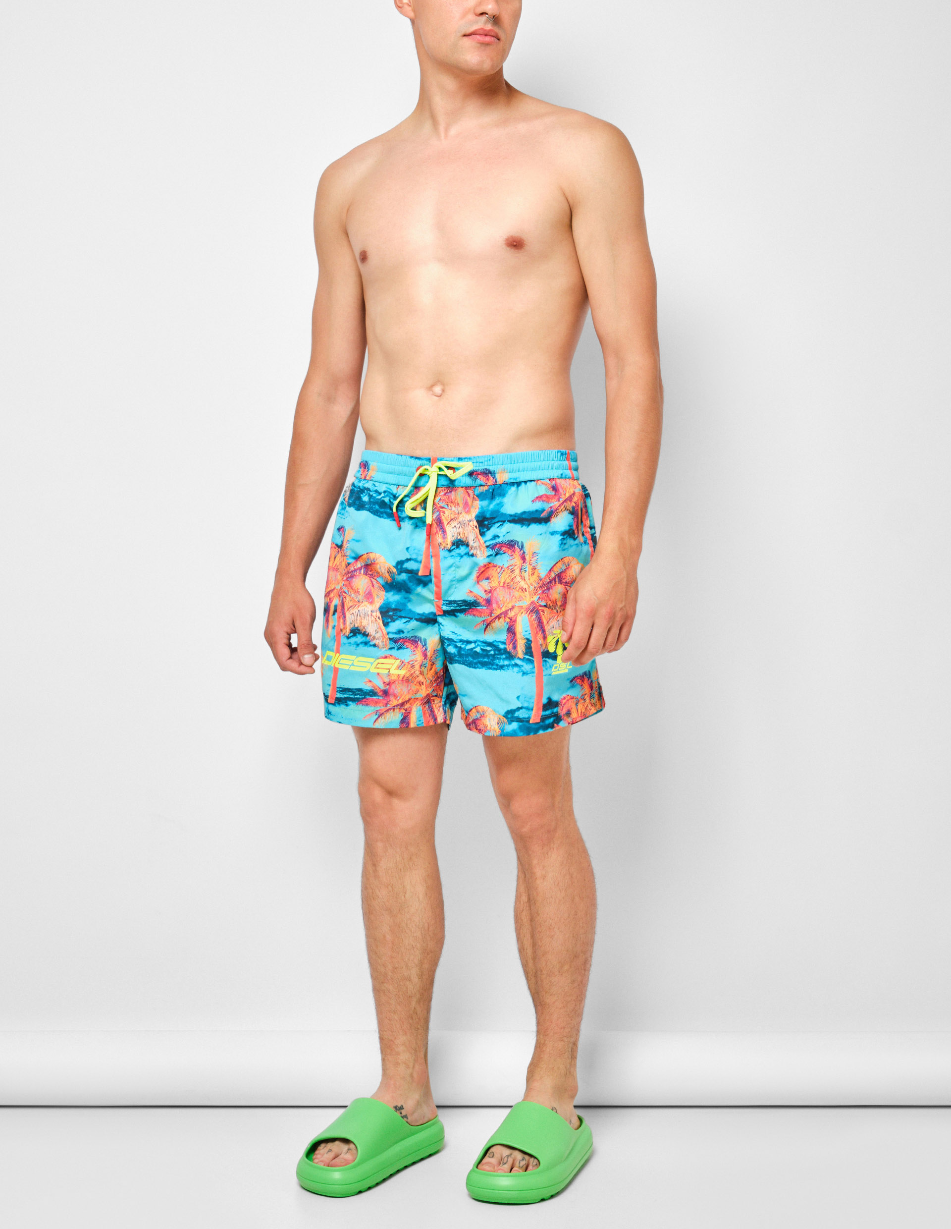 Мужские шорты для плавания изготовлены из легкой и быстросохнущей переработанной ткани. Модель средней длины с принтом в виде пальм смотрится ярко и эффектно. Дополнены эластичным поясом с кулиской, благодаря которой можно отрегулировать высоту посадки на талии, а также надежно зафиксировать шорты, чтобы они хорошо держались даже при высокой физической активности на пляже, в море либо бассейне. Для большего комфорта имеют водоотводящие люверсы и легкую сетчатую подкладку. Сзади расположен практичный карман на молнии. Флуоресцентные логотипы украшают изделие.