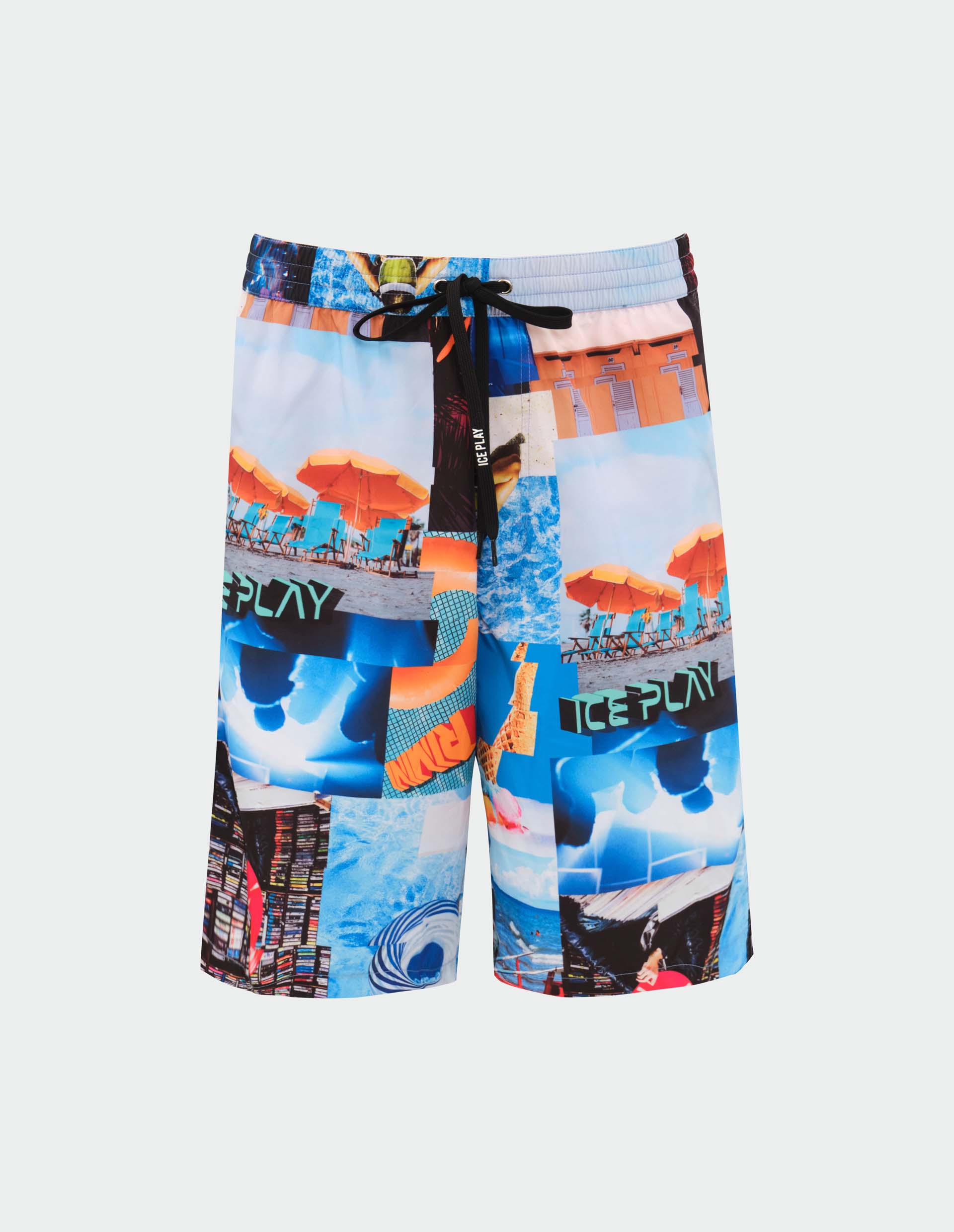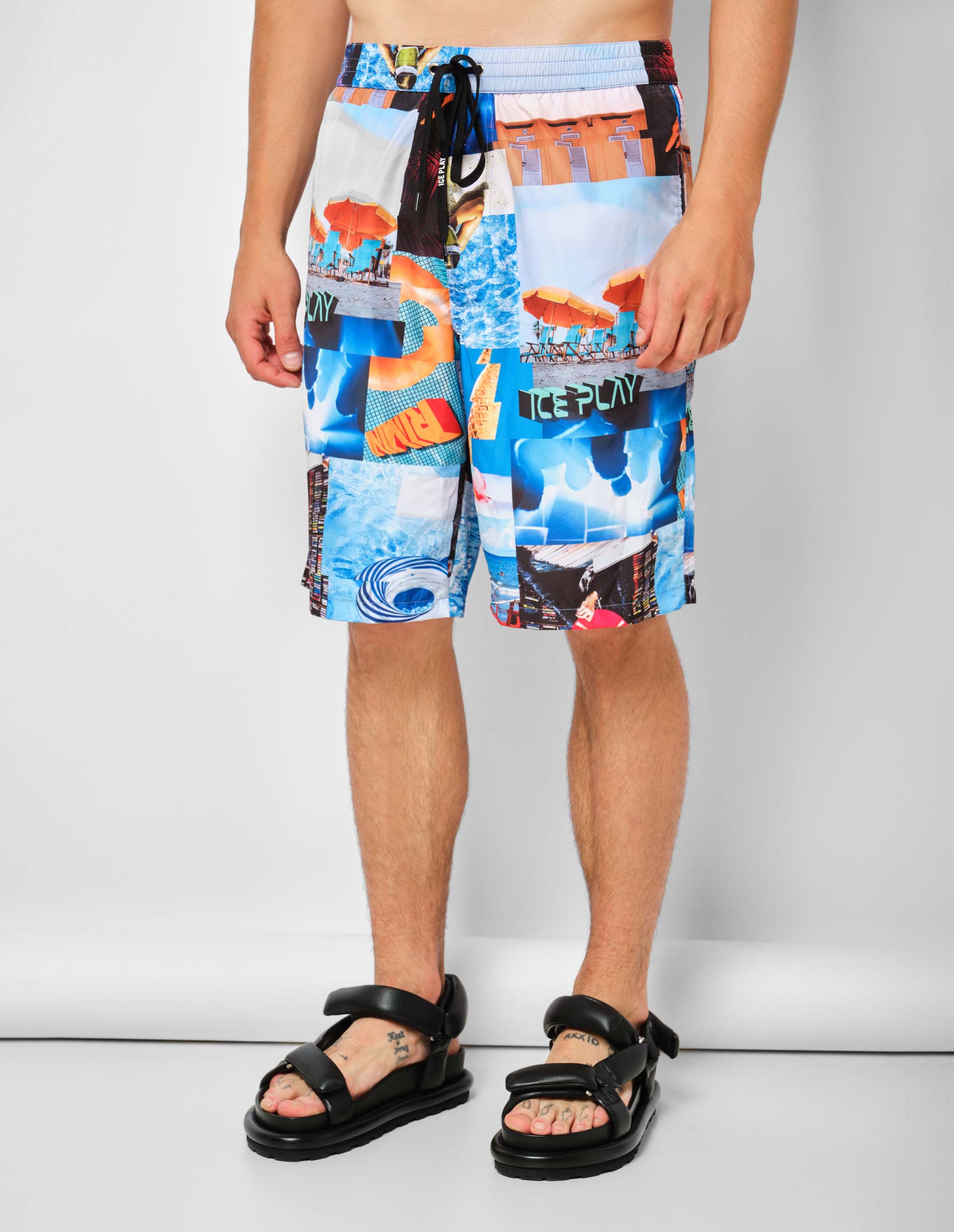 Мужские шорты для плавания изготовлены из легкой и быстросохнущей переработанной ткани. Модель длиной до колена смотрится стильно и эффектно благодаря яркому принту. Он напоминает коллаж из фото, на которых запечатлены самые захватывающие моменты летнего отдыха: chill out у бассейна, солнечный пляж, тропический закат и вечеринки с диджеем. Шорты дополнены эластичным поясом с кулиской, благодаря которой можно отрегулировать высоту посадки на талии, а также надежно зафиксировать их даже при высокой физической активности.