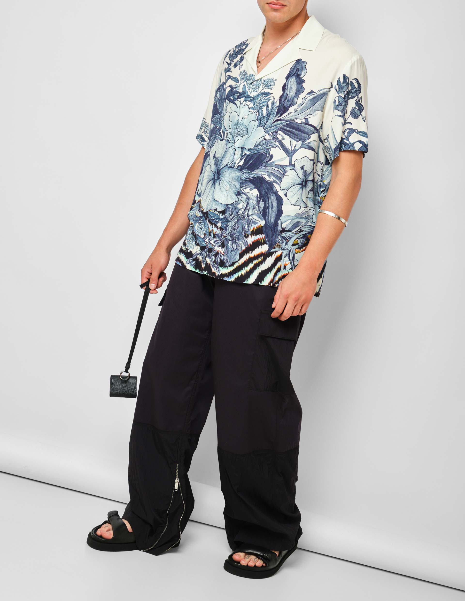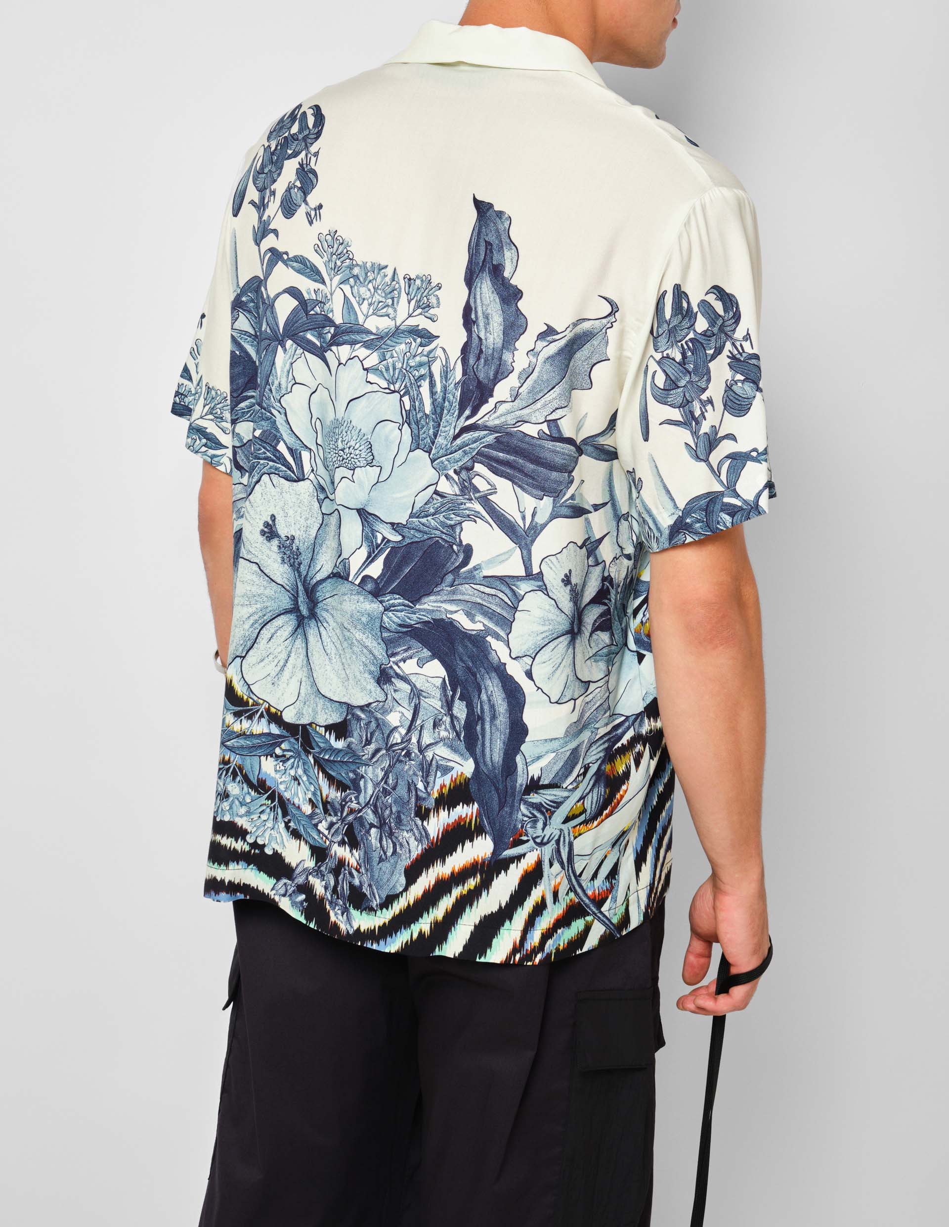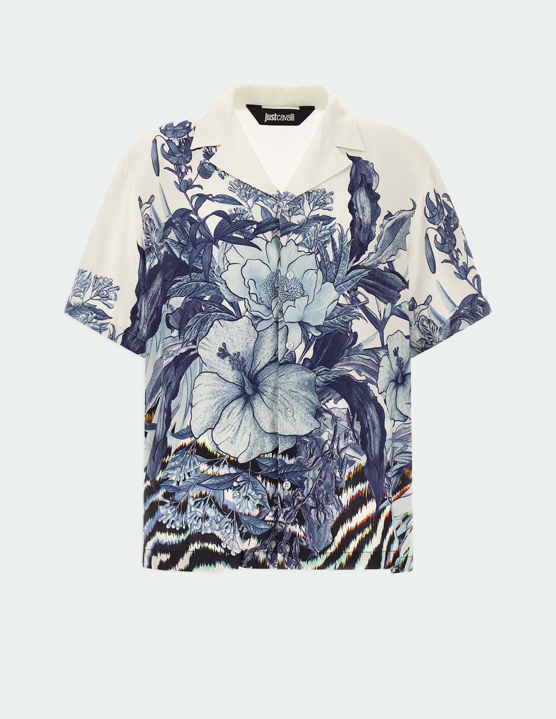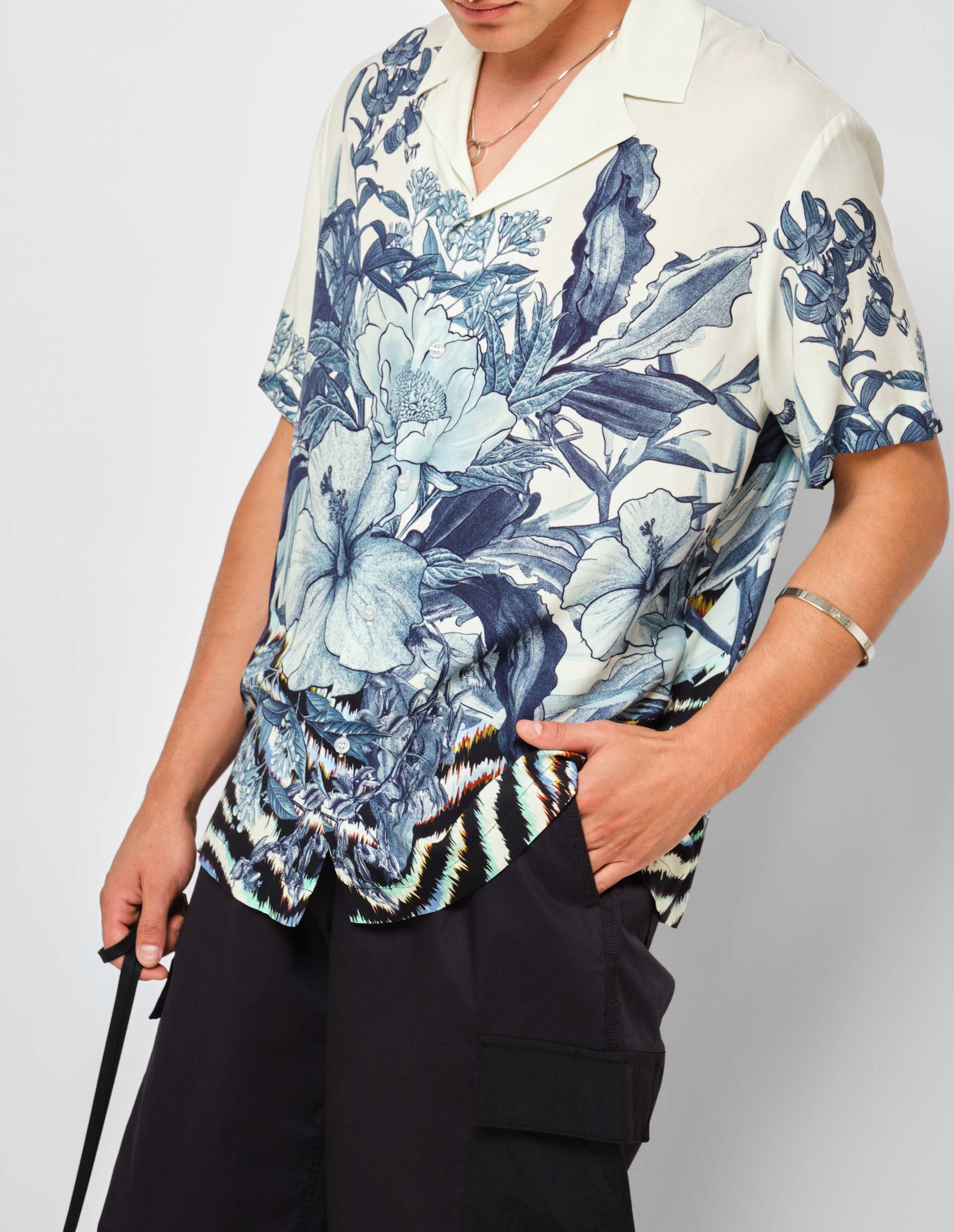 Анималистичное наследие культового модного дома Roberto Cavalli прорывается даже на фоне искусного флористического сада изображенного на стильной рубашке бренда Just Cavalli. Объединив два трендовых принта этого сезона, бренд смог создать поистине уникальные мотивы, переплетающиеся флору и фауну на гладком вискозном материале рубашки. Беззаботному и дикому настроению изделия вторят короткие рукава и акцентный отложной воротник.