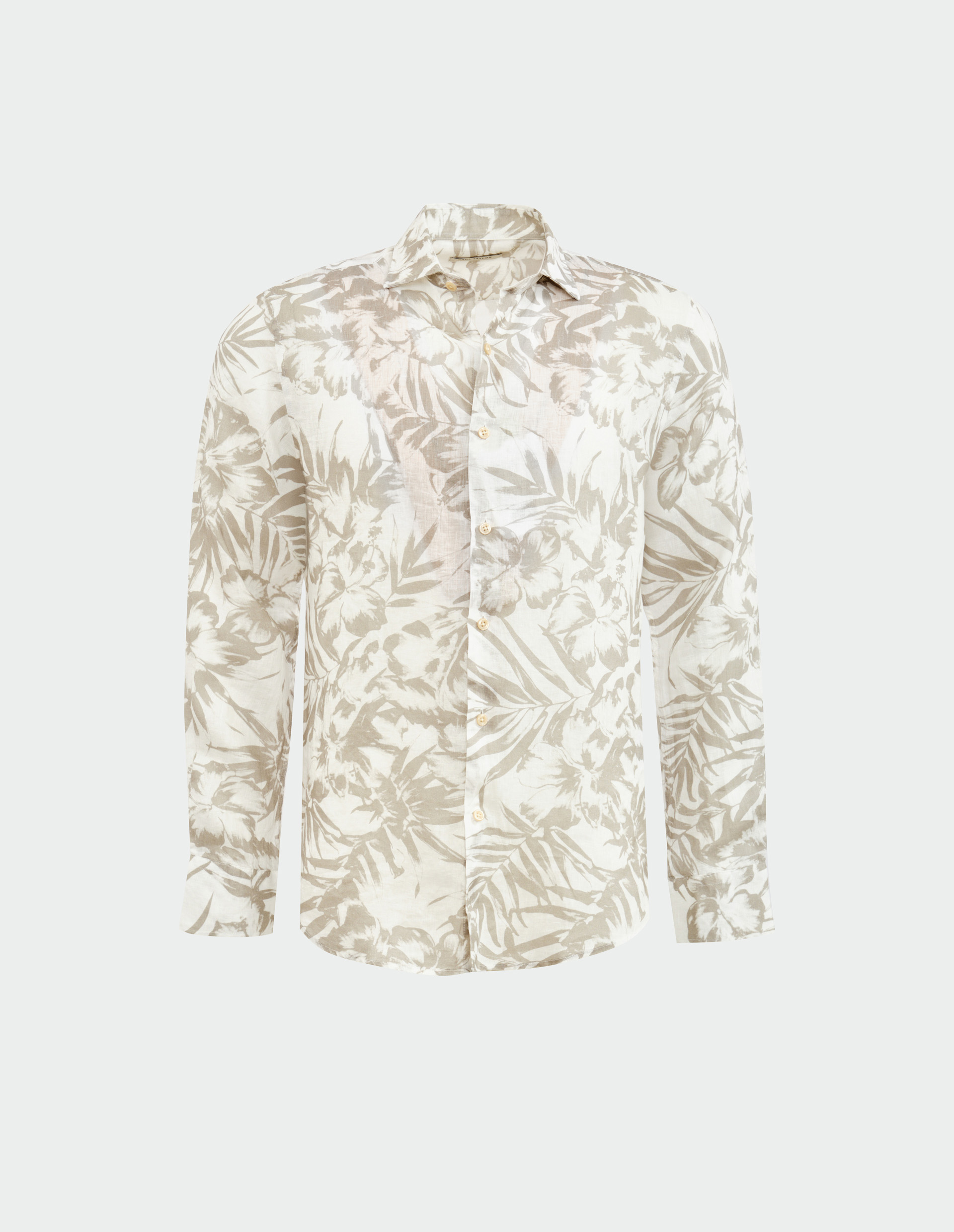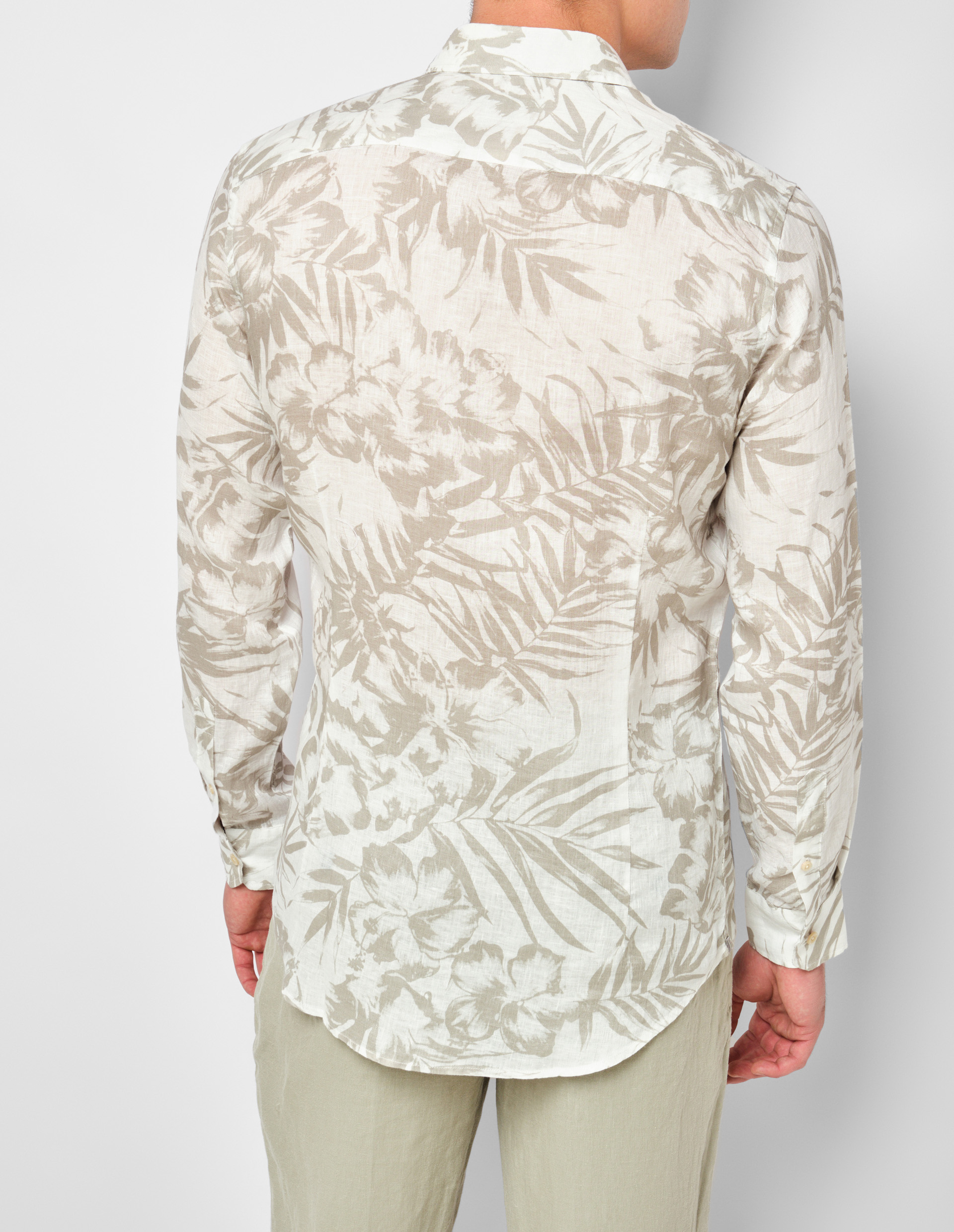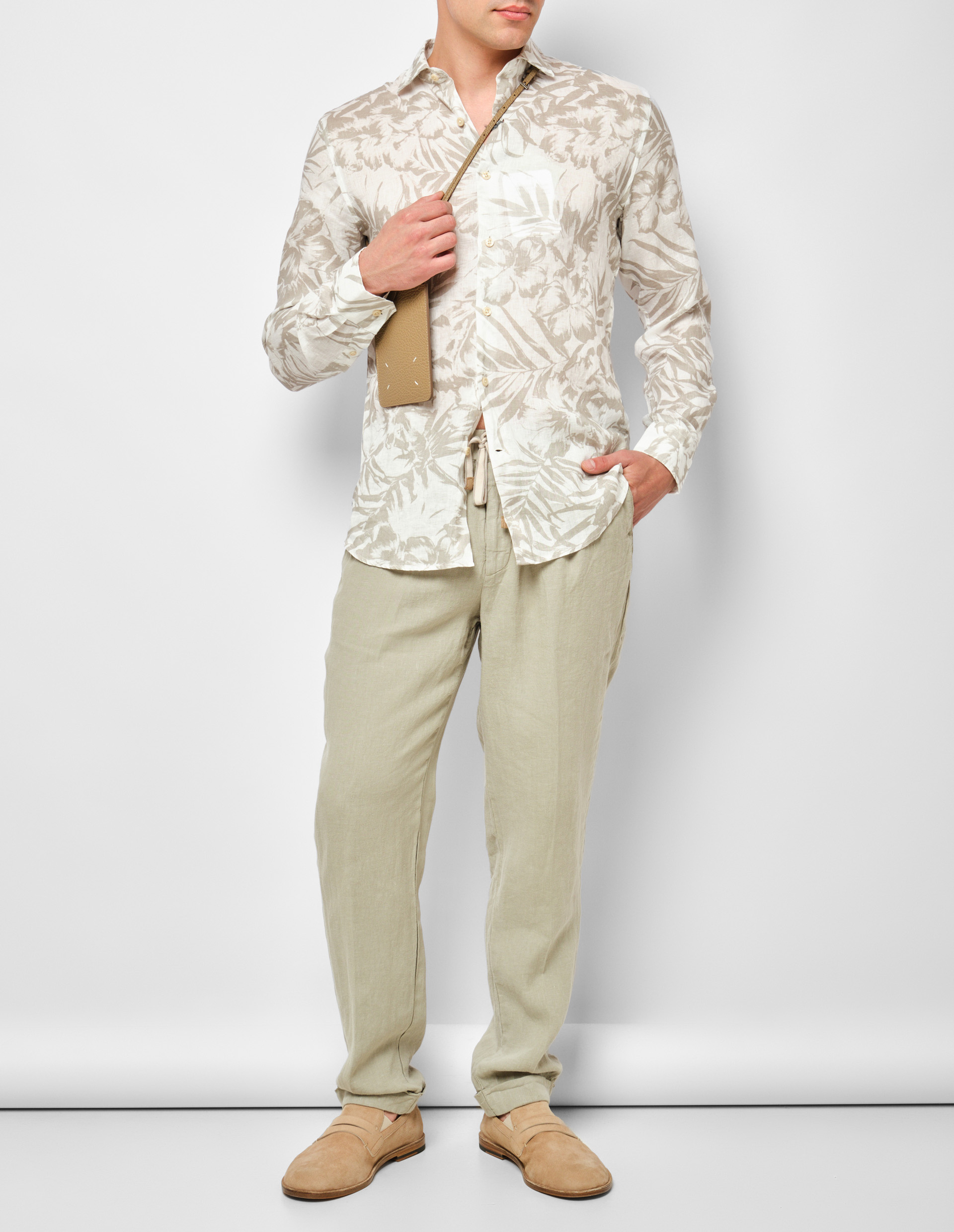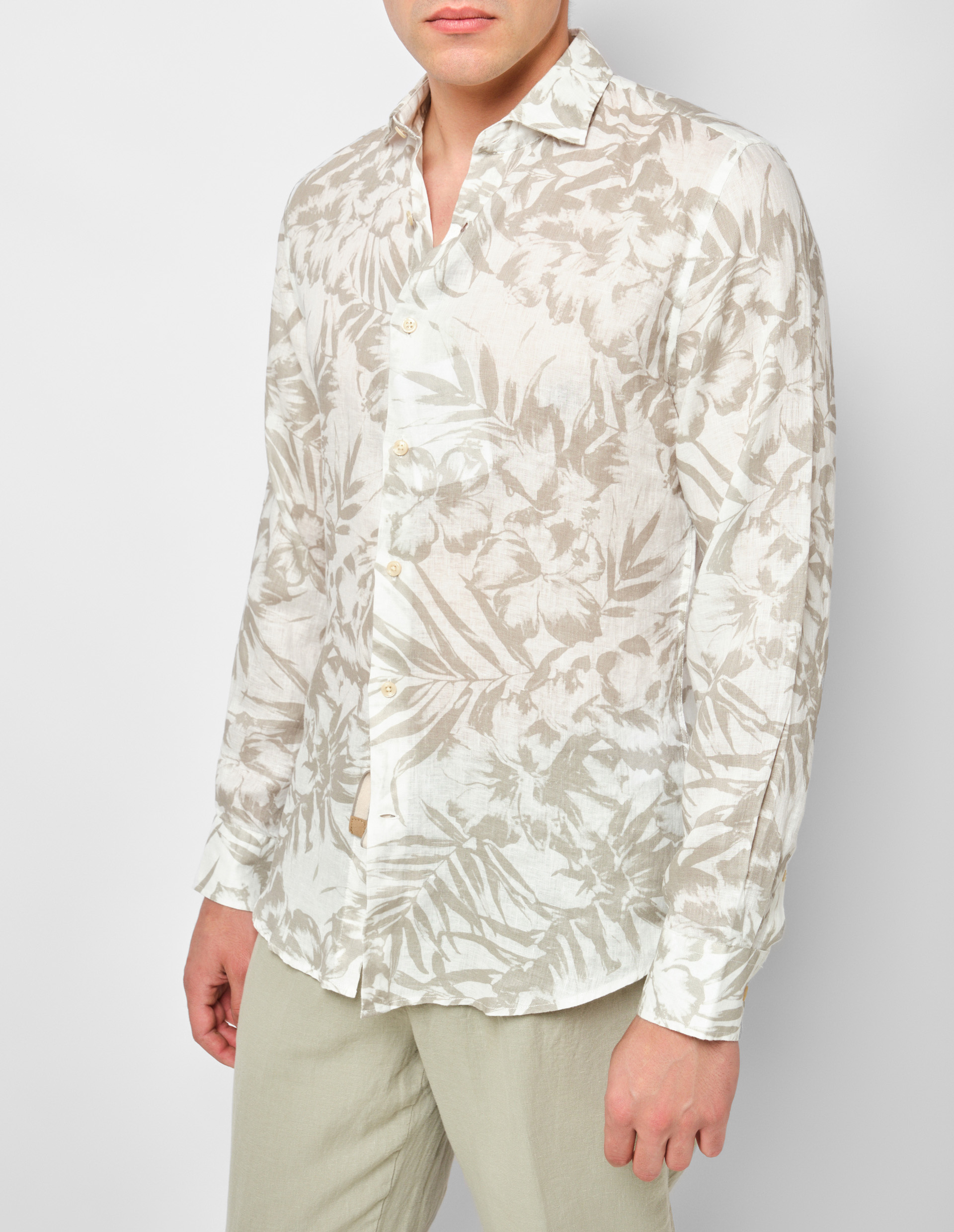 Узор, который украсит это лето! Рубашка из тонкого льна от Paul Taylor декорирована оригинальным растительным принтом. Цветы и папоротники выполнены в приглушенных серо-зеленых тонах, что делает рисунок изящным, а не кричащим. Модель приталенного кроя дополнена классическим воротником, манжетами и пуговицами с эффектом перламутра. Рукава можно застегнуть или закатать. Льняная ткань идеальна для жаркого сезона и сочетания с легкой одеждой.